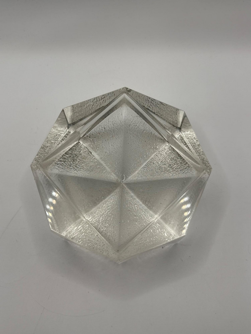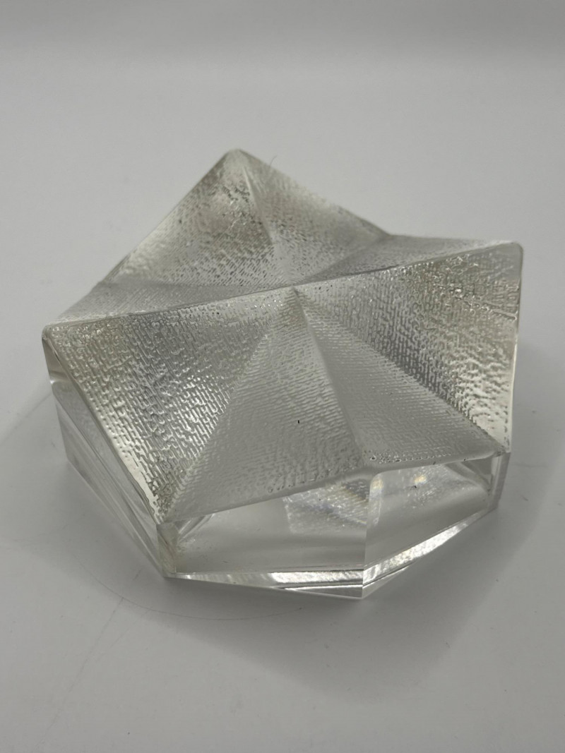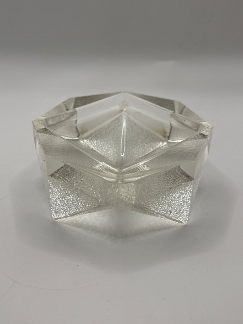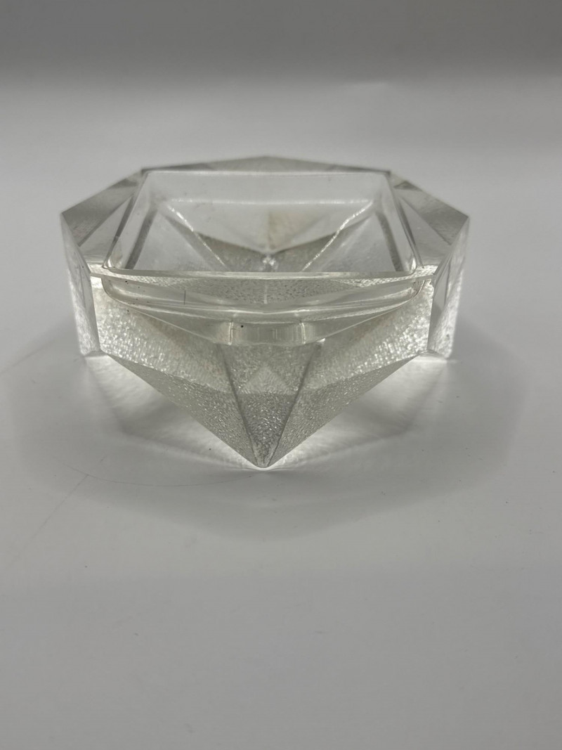 Striking Scandinavian Modern cast glass bowl designed by Eva Englund for Pukeberg Glassworks. This piece features a square top tapering into a pointed base, forming a faceted block silhouette reminiscent of a cut gemstone. The polished exterior and interior contrast with a subtly textured underside, creating dynamic light play. Originally intended as a catchall or vide-poche, it functions beautifully as a sculptural bowl or minimalist centerpiece. Important Details: Designer: Eva Englund Maker: Pukeberg Glassworks, Sweden Material: Molded clear glass