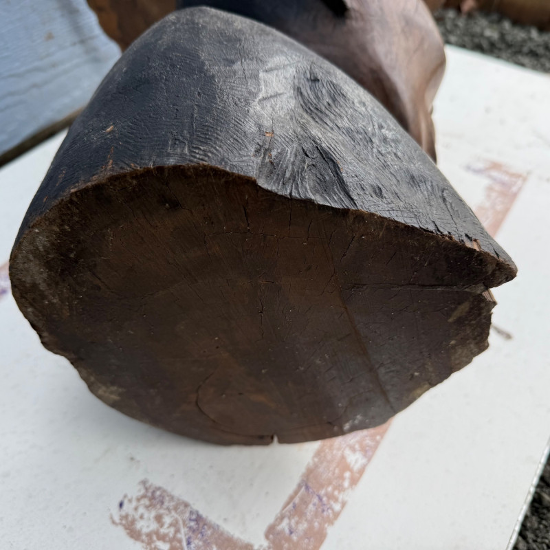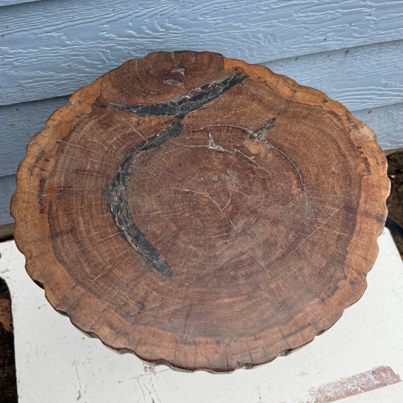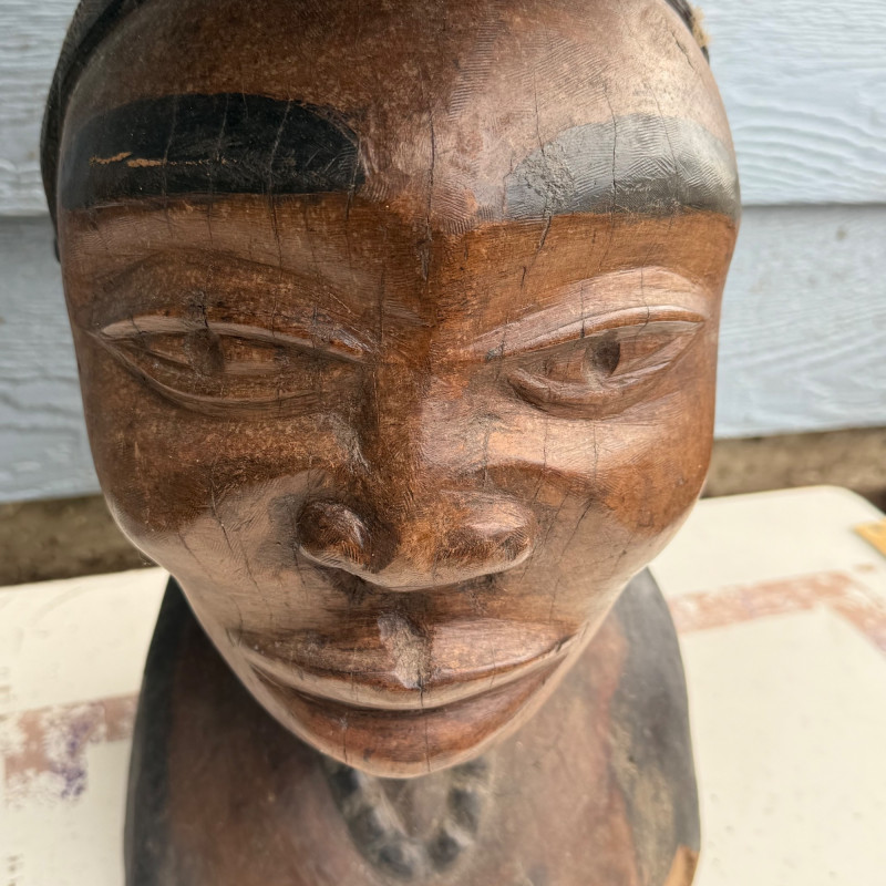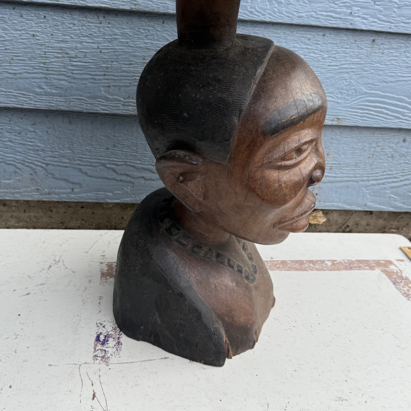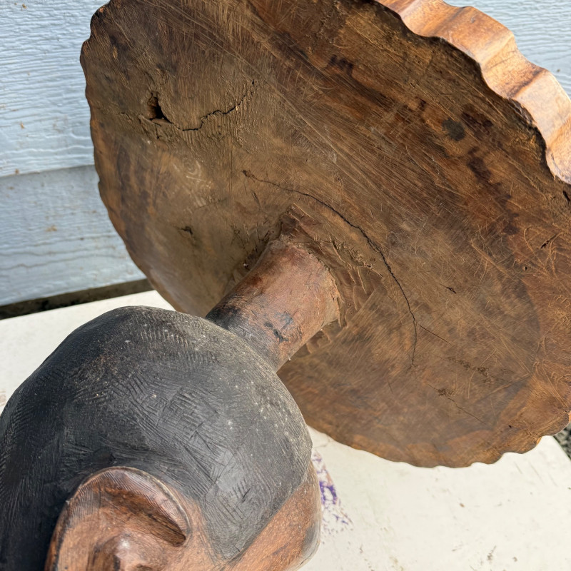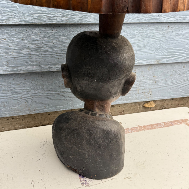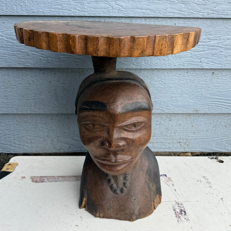 Tribal Decor / Functional Art A hand-carved wooden stool or low table featuring a sculptural base in the form of a human head. The head is carved in full relief with detailed facial features including almond-shaped eyes, arched brows, a broad nose, and full lips. The top is a circular platform with a textured edge, resting directly on the crown of the head. Material: Solid carved hardwood Finish: Natural matte with visible grain and patina Design Features: Full sculptural head with stylized facial features Circular top with carved rim texture Slight wear and surface variation consistent with age Single-piece construction with no visible joints or attachments Very heavy. Details