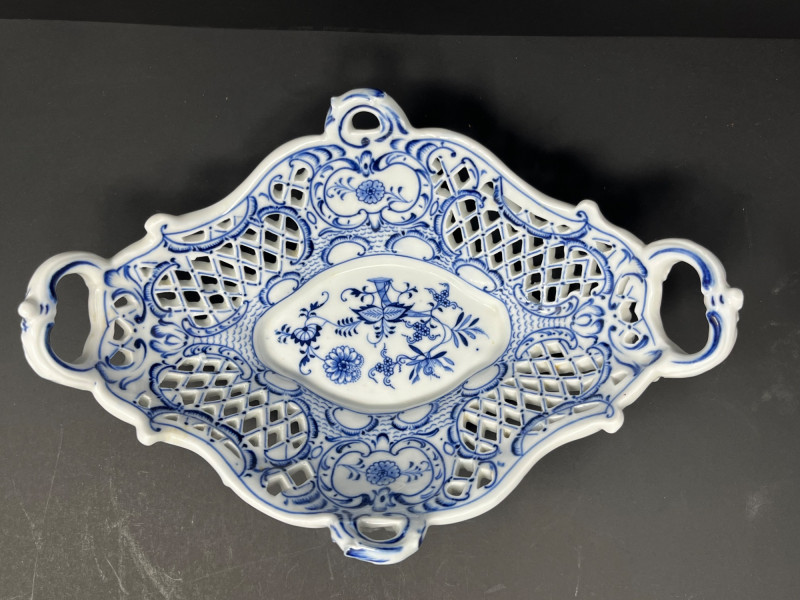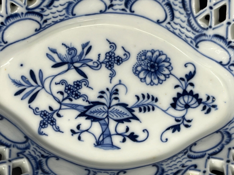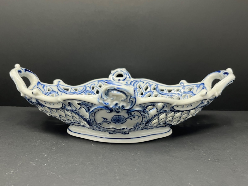 From a private Pacific Northwest collection of European decorative arts. This is a Meissen porcelain jardinière or centerpiece bowl, likely featuring the "Blue Onion" pattern. Meissen porcelain is a type of hard-paste porcelain that was first produced in Europe in the early 18th century in Meissen, Germany. Pattern: The "Blue Onion" pattern, also known as Zwiebelmuster, is a popular porcelain design that originated at the Meissen factory. Item Type: This piece is a reticulated (pierced) basket bowl, also referred to as a jardinière or centerpiece bowl. Origin: Meissen porcelain is made in Germany and is known for its high quality and craftsmanship. Age: Similar pieces are often from the 19th century.