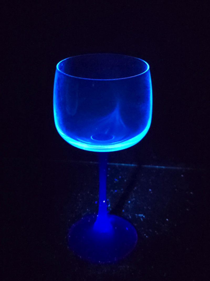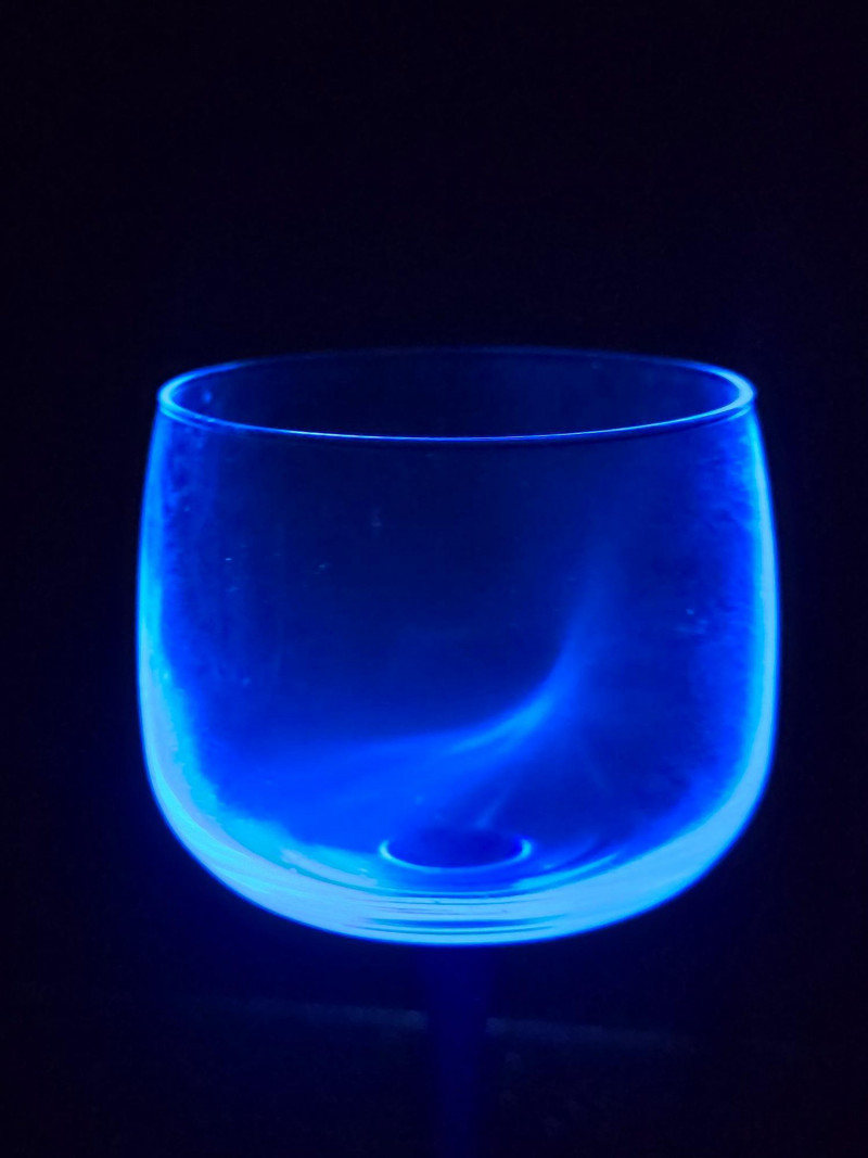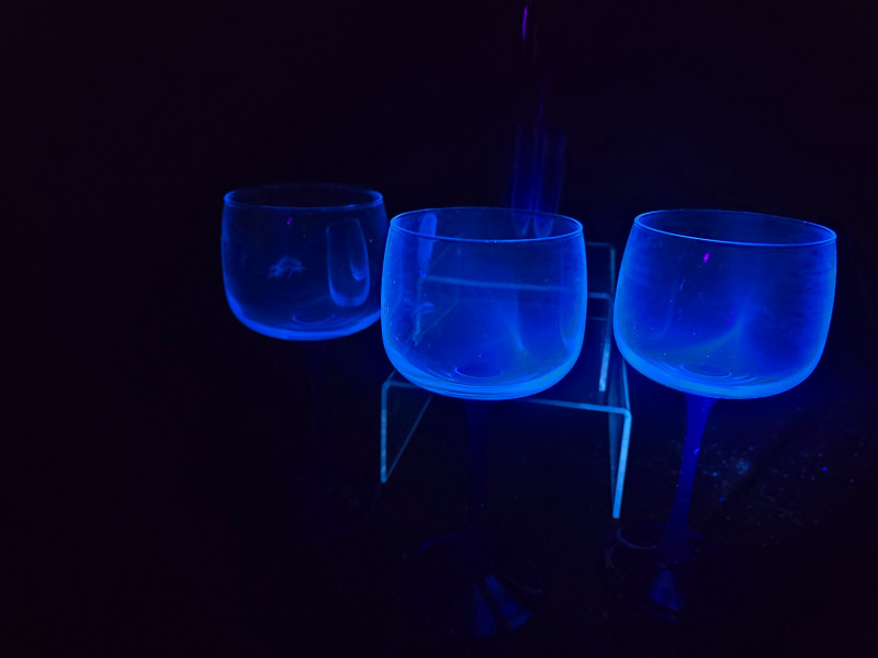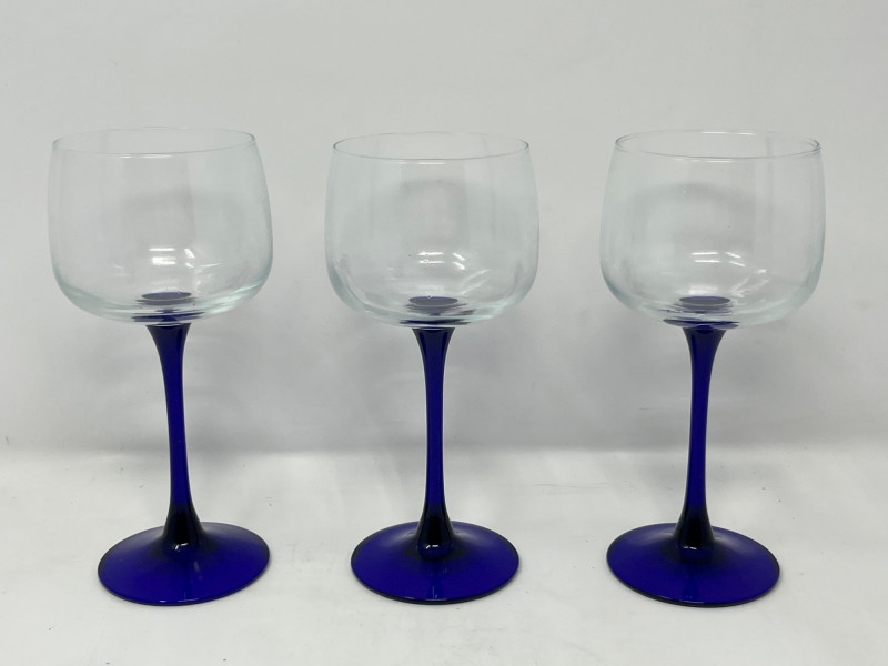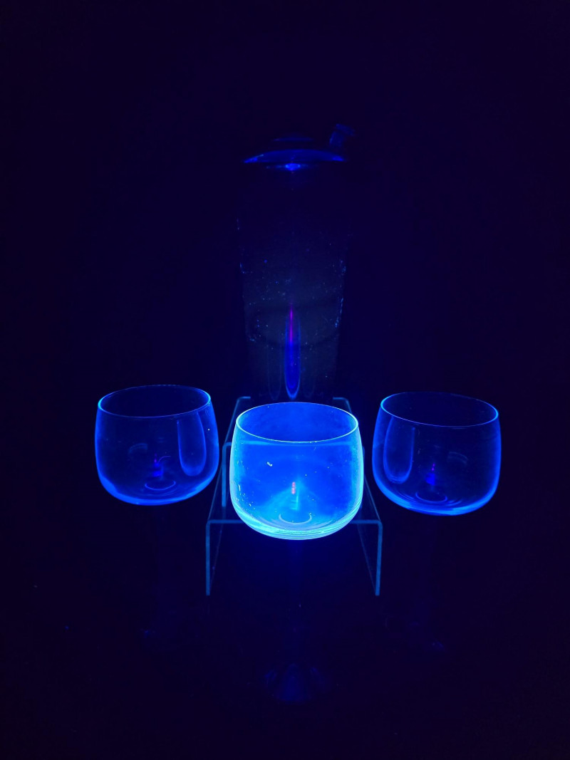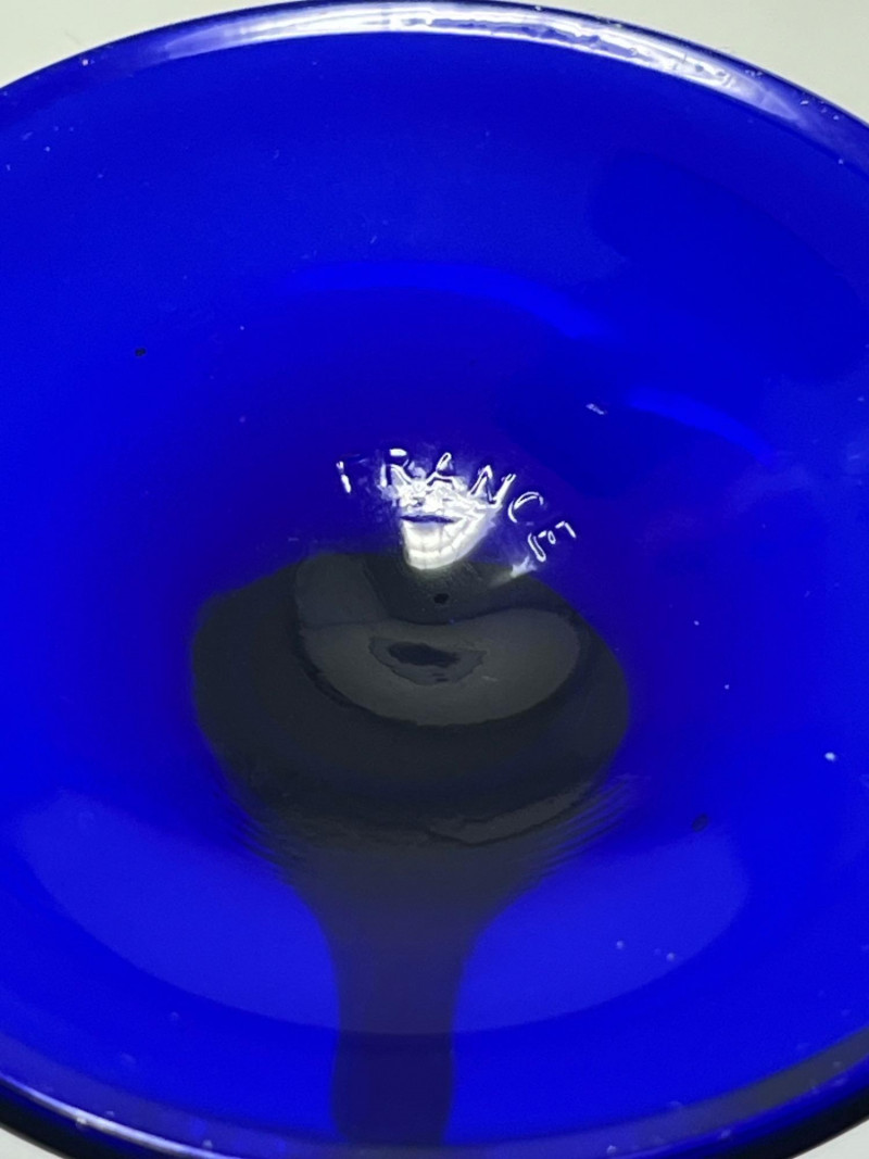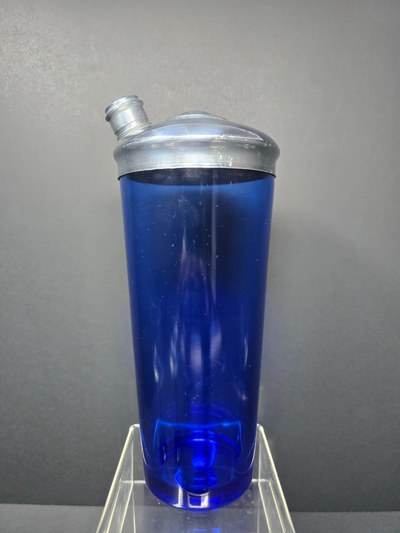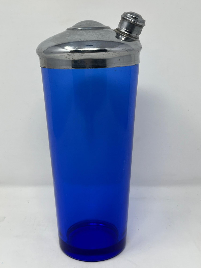 A stunning example of 1930s barware design, this vintage Art Deco set includes: Cocktail shaker: Deep cobalt blue glass body with a polished chrome cap and built-in strainer. The shaker features classic Art Deco vertical ribbing and a gently tapered silhouette.– Approx. 10" tall x 4" wide Three matching glasses: Tall, flared cobalt blue tumblers with smooth rims and subtle vertical lines echoing the shaker’s design. Perfectly proportioned for cocktails or aperitifs.– Each approx. 7" tall x 3" wide This set captures the elegance and geometric precision of the Art Deco era, with rich color and reflective chrome accents that make it ideal for display or use. Whether you're a collector or a cocktail enthusiast, it’s a rare and stylish addition to any bar or glassware collection. Condition:Excellent vintage condition. No chips, cracks, or clouding. Chrome shows minimal age-related wear.