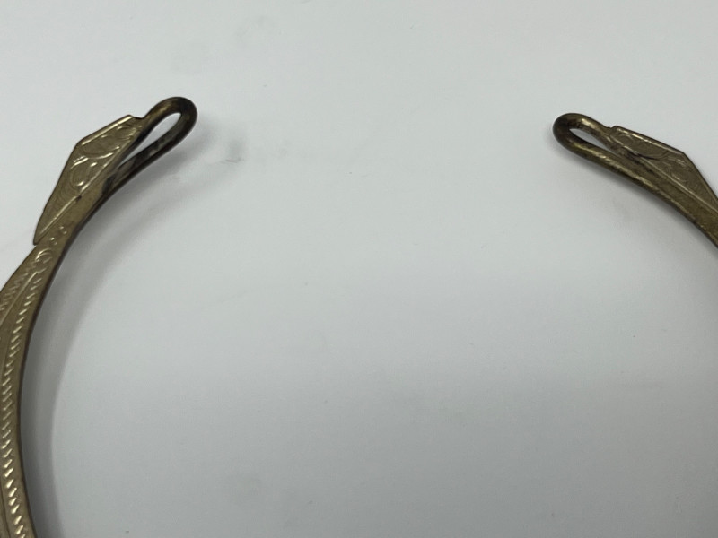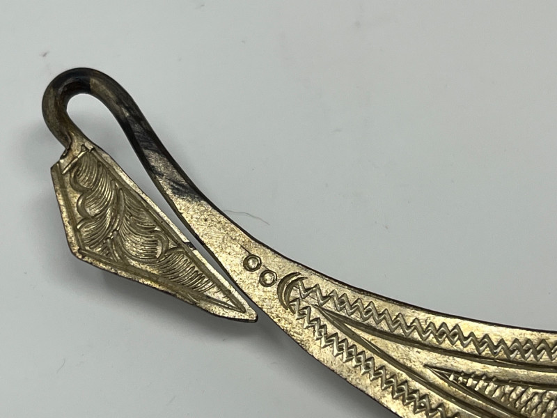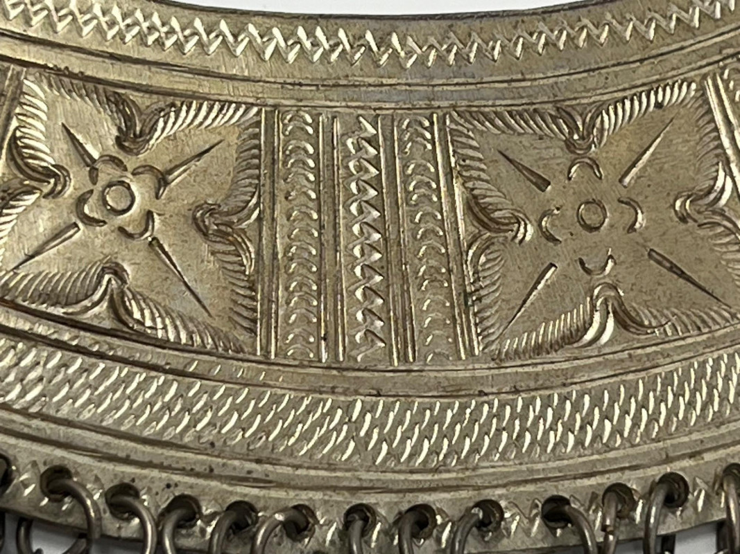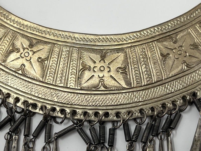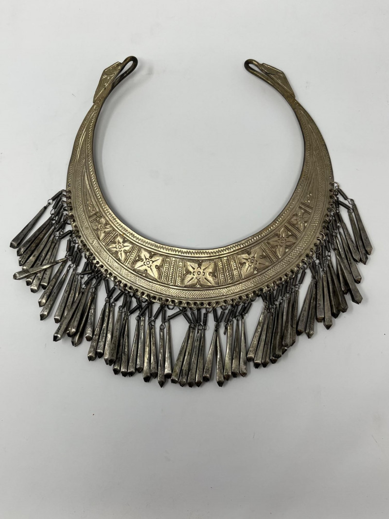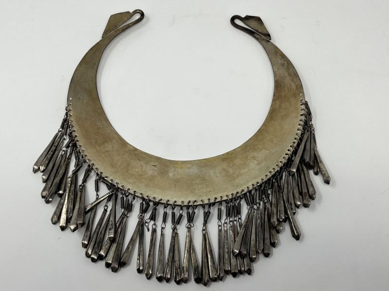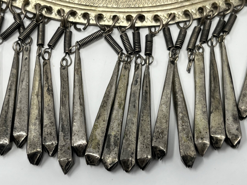 This vintage bib necklace showcases a bold tribal-inspired design with layered metal accents that evoke a bohemian, artisan-crafted aesthetic. Though unbranded and made from unknown metal, its aged patina and global styling give it a distinctive, timeworn charm. The bib section features a tiered arrangement of dangling elements in a silver-tone finish. While a few charms are missing and the connecting chain is not included, the overall silhouette remains visually striking and full of character. Ideal for jewelry makers, costume designers, or collectors seeking authentic vintage components. Whether restored, repurposed, or displayed as-is, this piece offers creative potential and a story-rich presence. Sold as-is. No chain or additional accessories included.