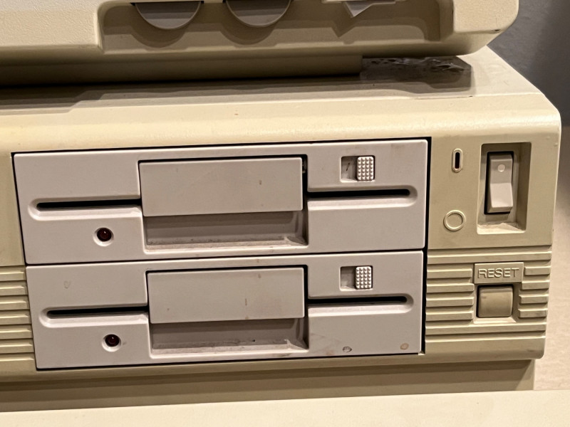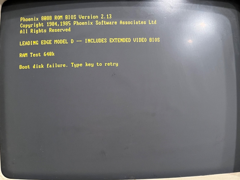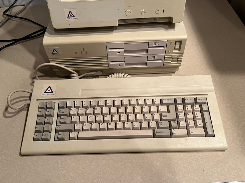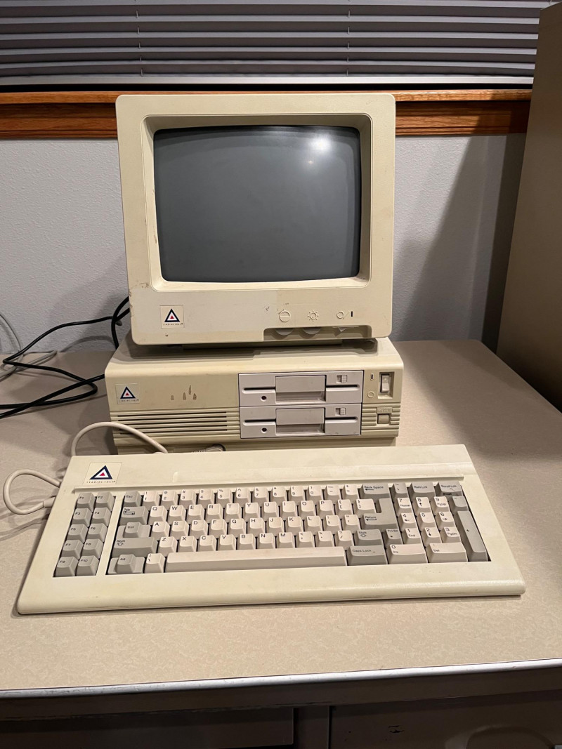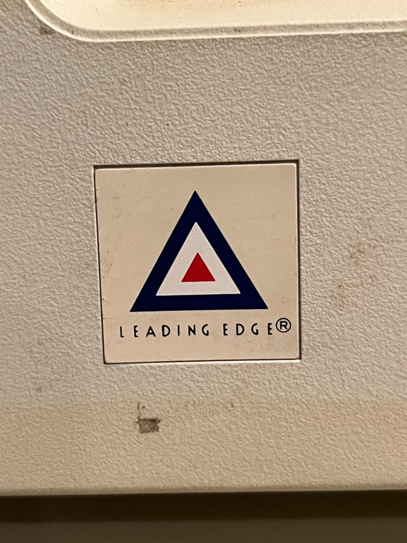 Vintage Leading Edge DC-2011 desktop personal computer, beige chassis with integrated full‑size keyboard and front 5.25" floppy drive. Sold as‑is; functionality untested. - Model: DC-2011 - Likely era: mid‑1980s - Probable CPU: Intel 8088 class (around 4.77 MHz) - Probable RAM: 256 KB–640 KB (may be expandable) - Storage: front 5.25" floppy drive; internal hard drive possible but unconfirmed - Video: CGA-compatible or equivalent onboard graphics likely - I/O and expansion: serial; parallel; keyboard port; ISA expansion slots likely present - Condition: vintage cosmetic wear, surface scuffs, possible yellowing; missing or unverified accessories; no power cord or software confirmed - Sale notes: ideal for restoration, parts, or display; recommend power-up and functional testing by buyer prior to use