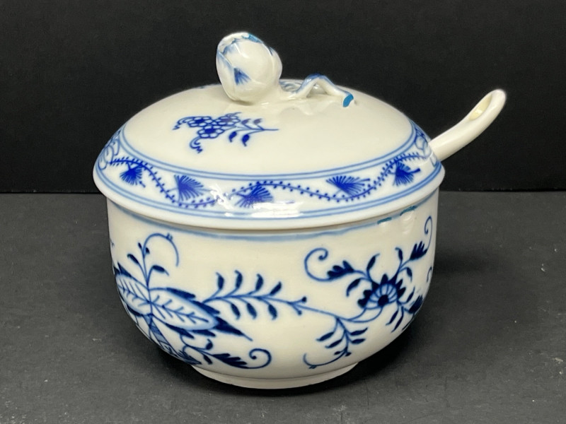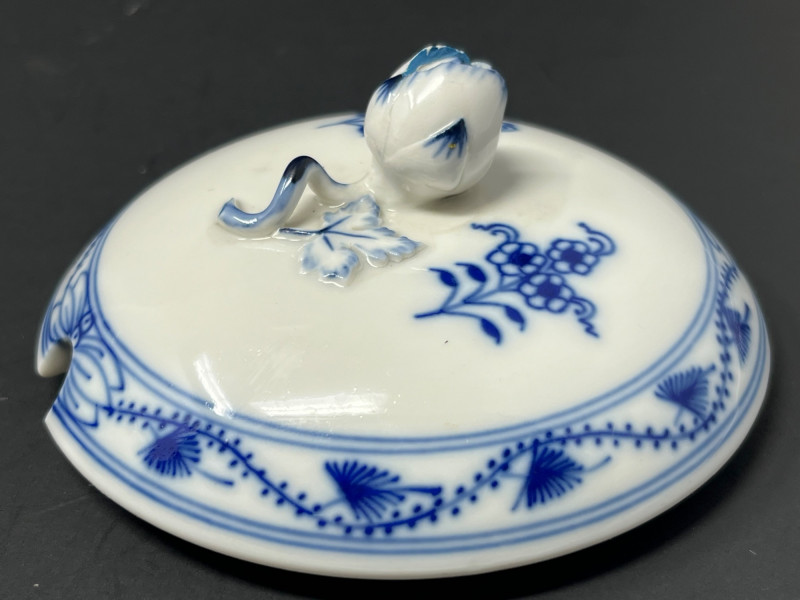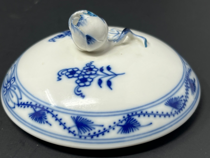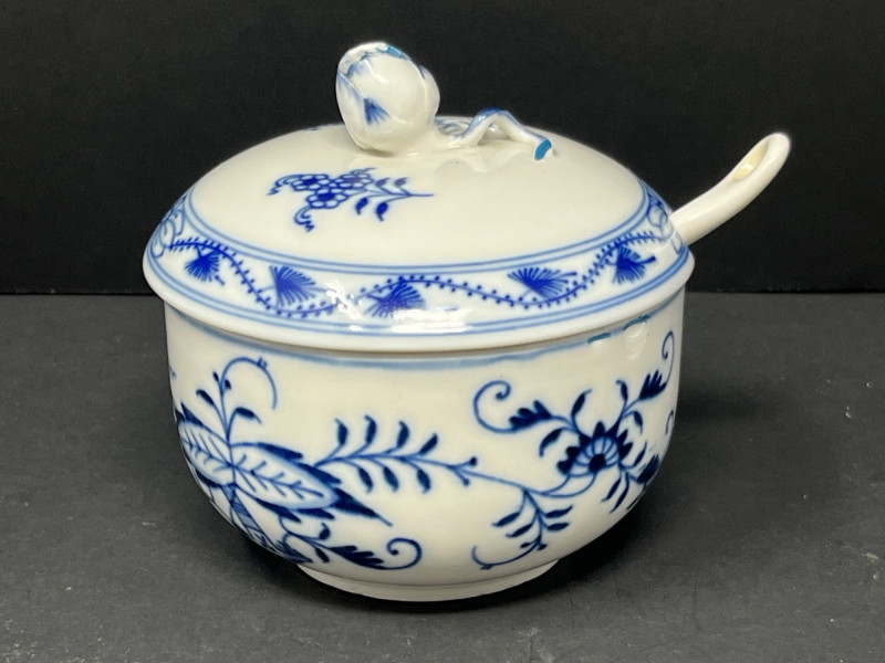 This product is a Meissen Blue Onion sugar bowl. It is a piece of German porcelain featuring the classic Blue Onion (Zwiebelmuster) pattern, which consists of hand-painted cobalt blue floral motifs. The lid is often topped with a sculpted rosebud finial.