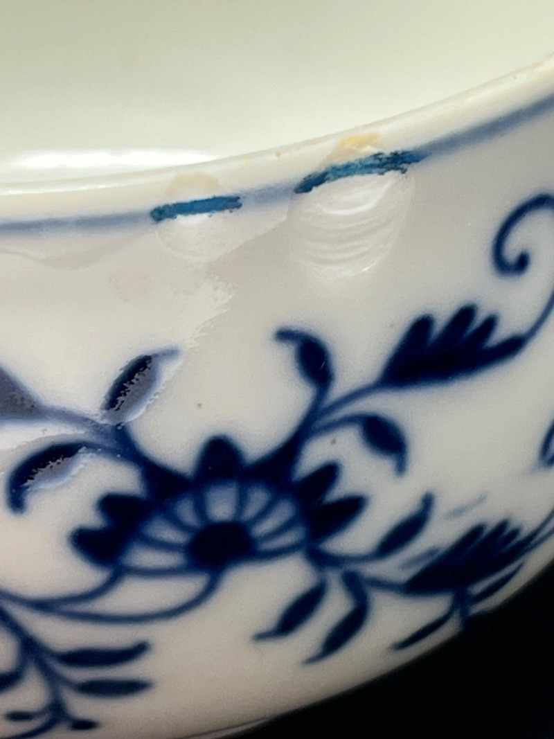The "onions" in the pattern are not actually onions, but rather peaches and melons on the rim, and bamboo stalks and chrysanthemum blossoms in the center.