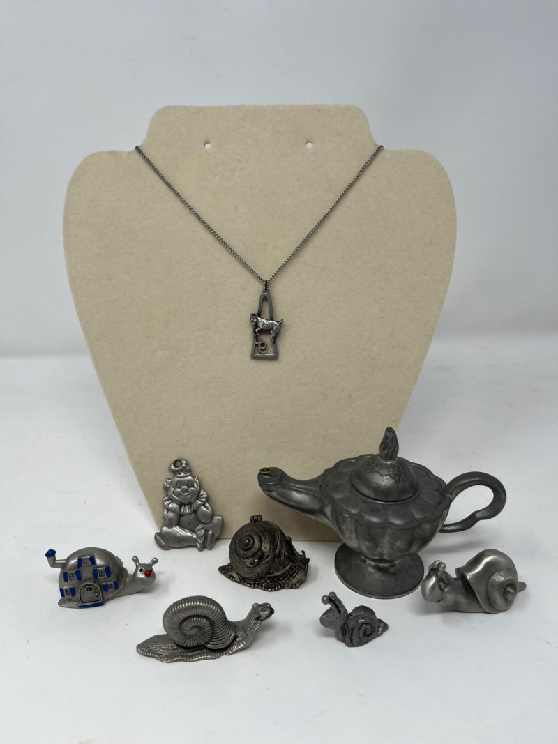 This unique 8-piece pewter lot blends wearable art, decorative miniatures, and a functional novelty item. A great find for collectors of vintage curios, zodiac-themed jewelry, or whimsical design. Included in this lot: Capricorn-themed necklace with detailed zodiac medallion Expressive clown pendant with vintage flair Genie lamp Five miniature snail figurines in varied poses Sizes: Snails range from approximately 1 to 2 inches long; pendants and lighter measure about 2 to 3 inches. Necklace chain is included for the Capricorn necklace. Condition: All pieces are in good vintage condition with light surface wear and natural patina. No major dents or damage. Highlights: Mix of figural and functional pewter Ideal for display, gifting, or upcycling Unusual finds like the genie lamp lighter and snail minis add charm