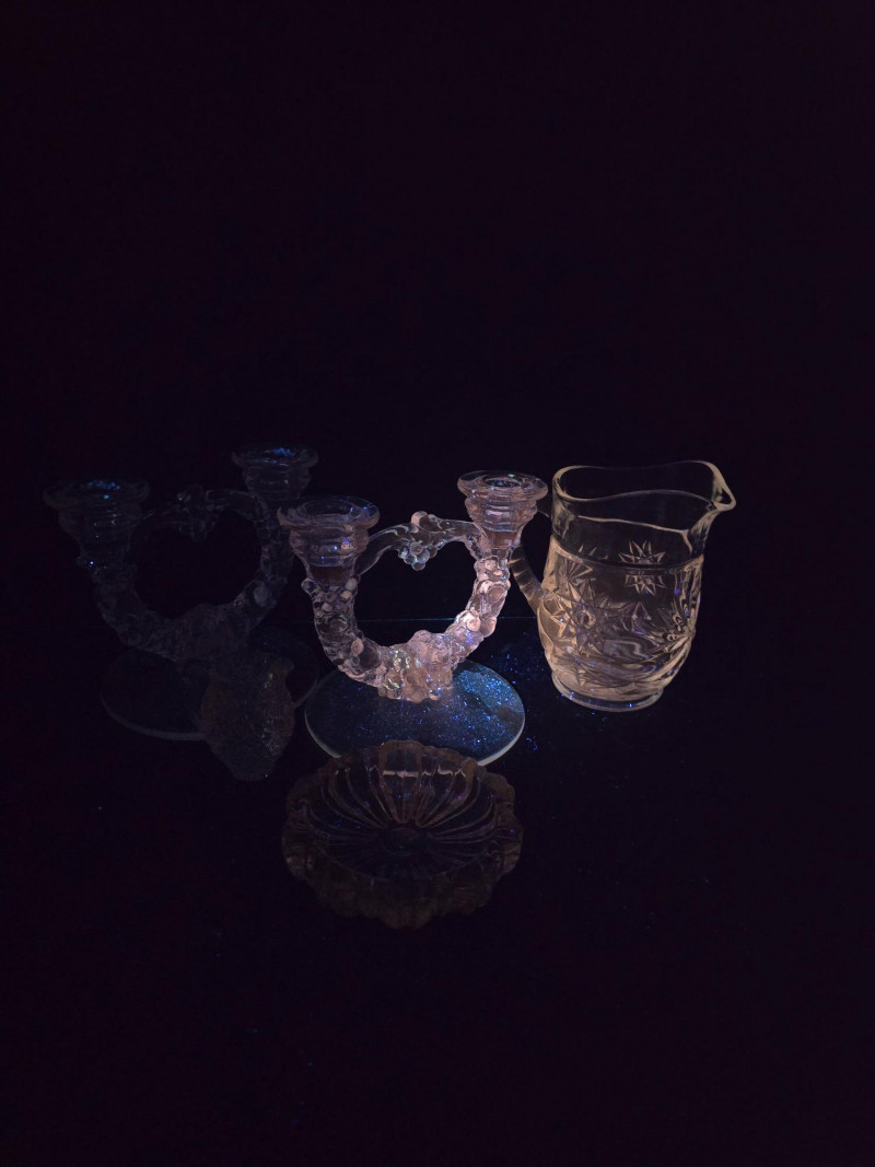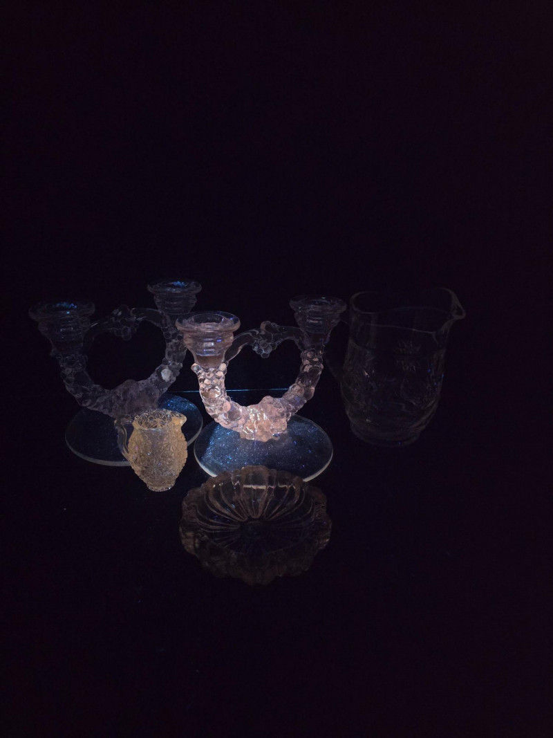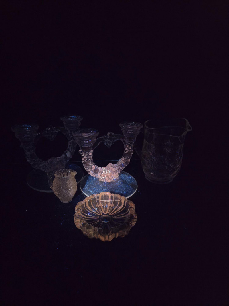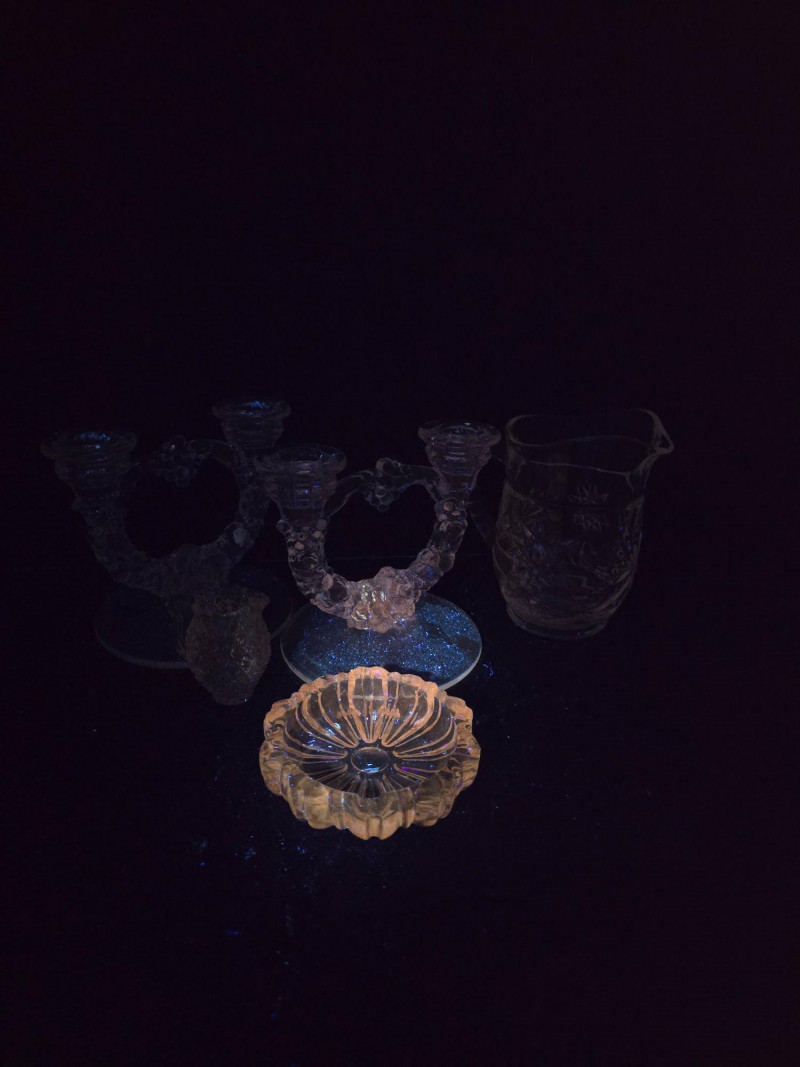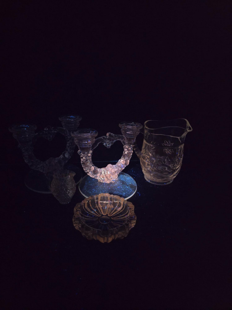 This vibrant set of vintage glassware features five UV-reactive pieces that fluoresce brilliantly under blacklight. A striking display group or starter collection for glow glass enthusiasts. Included in the lot: Two matching candlestick holders with clean lines and balanced proportions One round ashtray with a smooth rim and classic mid-century styling One single-serve pitcher, ideal for personal use or small arrangements One miniature pitcher, perfect for display or as a collectible accent Details: All pieces glow under UV light Believed to be mid-20th century; maker unknown No chips or cracks; light wear consistent with age Sold as a complete set A ready-made display with vintage charm and luminous appeal. Ideal for collectors, decorators, or anyone drawn to the unique beauty of uranium glass.