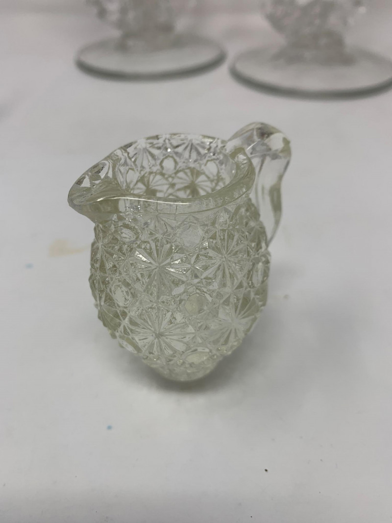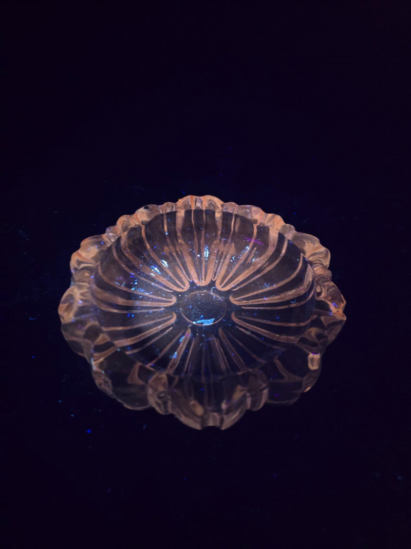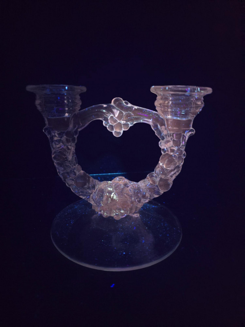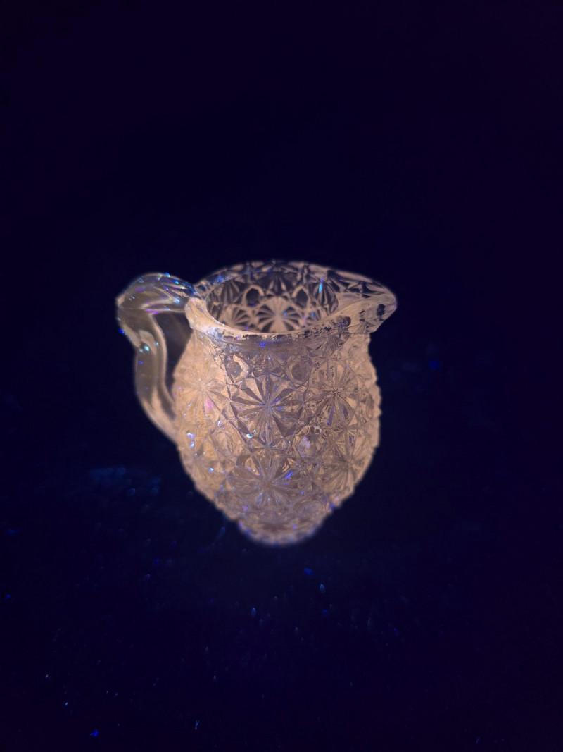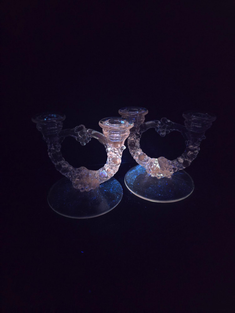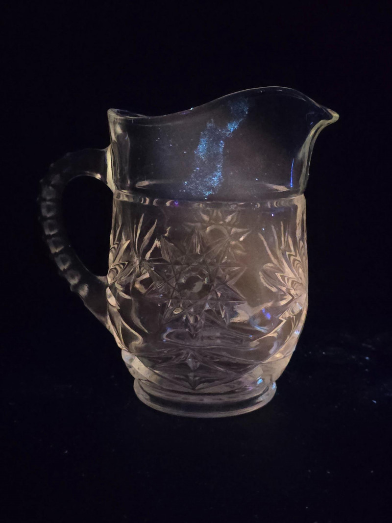 This vibrant set of vintage glassware features five UV-reactive pieces that fluoresce brilliantly under blacklight. A striking display group or starter collection for glow glass enthusiasts. Included in the lot: Two matching candlestick holders with clean lines and balanced proportions One round ashtray with a smooth rim and classic mid-century styling One single-serve pitcher, ideal for personal use or small arrangements One miniature pitcher, perfect for display or as a collectible accent Details: All pieces glow under UV light Believed to be mid-20th century; maker unknown No chips or cracks; light wear consistent with age Sold as a complete set A ready-made display with vintage charm and luminous appeal. Ideal for collectors, decorators, or anyone drawn to the unique beauty of uranium glass.