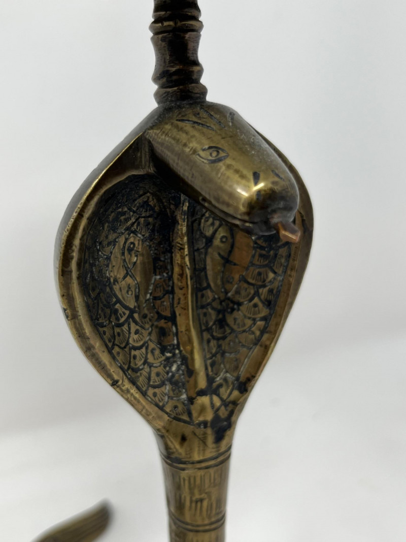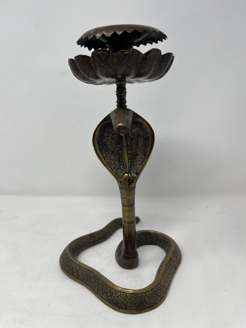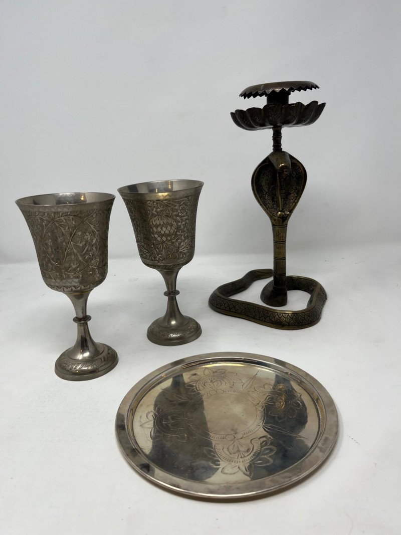 Lot # 49 - Vintage Indian Metalware– Tray, Goblets & Brass Cobra Candlestick