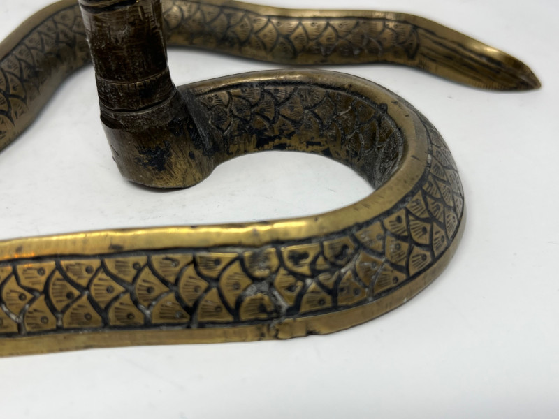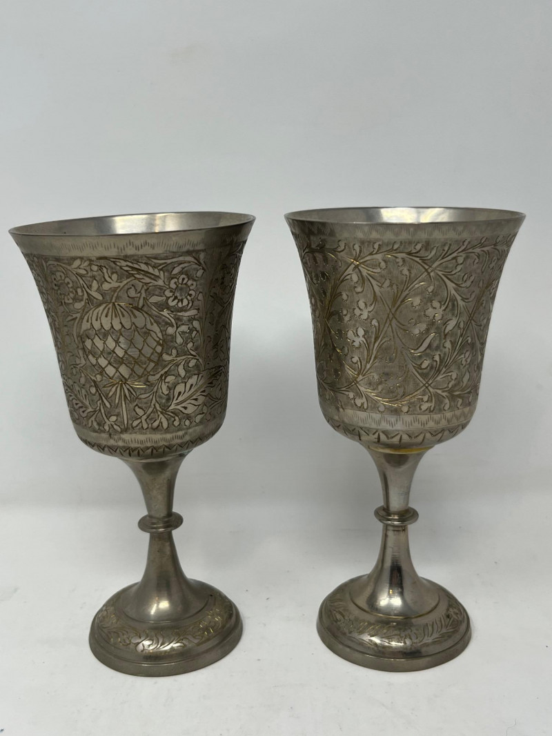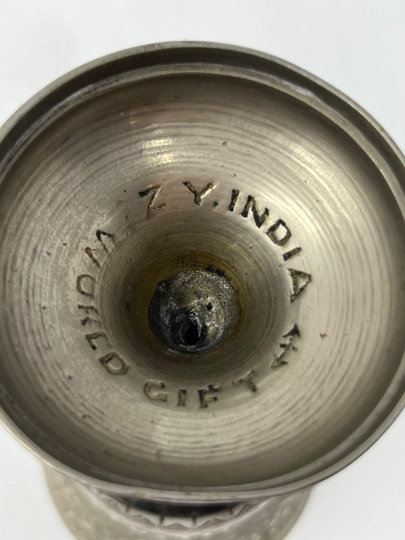 This distinctive set of three vintage decorative items showcases Indian-inspired artistry and materials. Included in the collection: Brass Snake Candlestick Holder – A sculptural coiled cobra design with detailed features and a warm patina. Holds one taper candle. Solid brass. Two Ornate Goblets – Crafted from an unknown silvery metal with etched surface designs. Lightweight and decorative. Small Round Tray – Made from an unidentified metal with a raised rim and subtle engraved patterns. Complements the goblets or serves as a standalone accent. Condition: All items exhibit light wear and surface patina consistent with age. No structural damage. The candlestick is especially striking in form and finish. Estimated Era: Mid to late 20th century