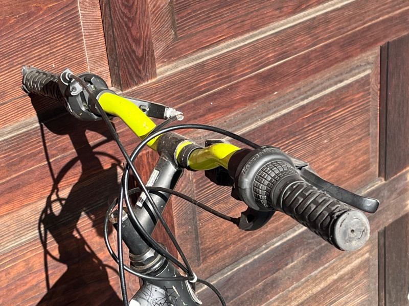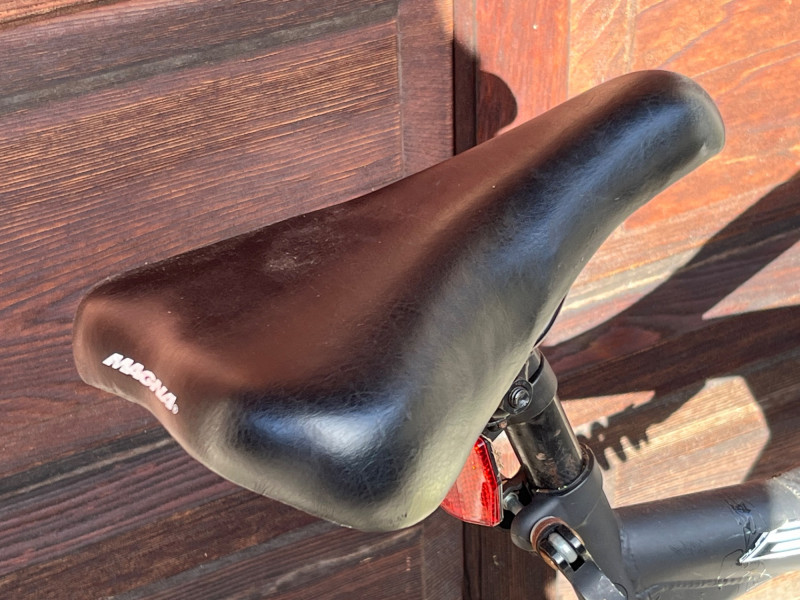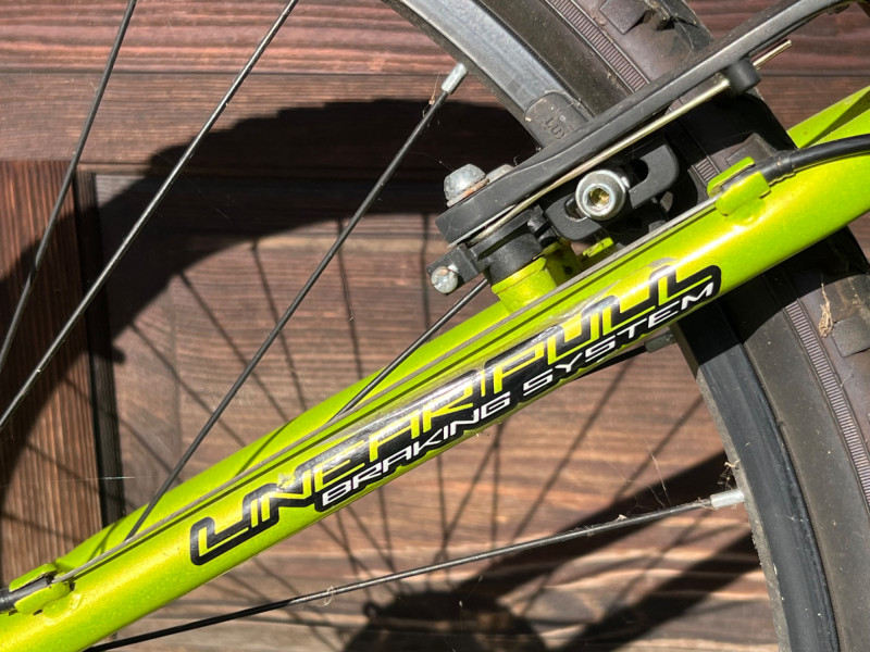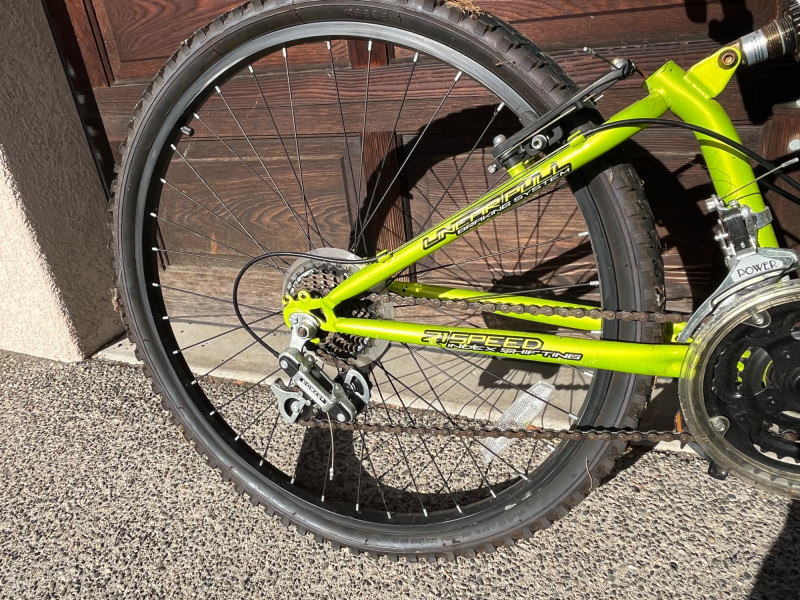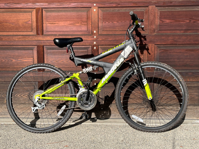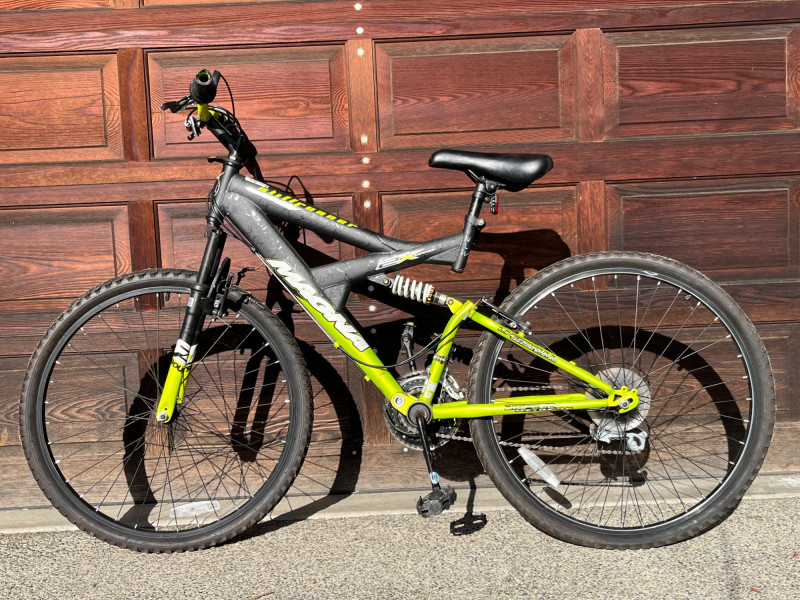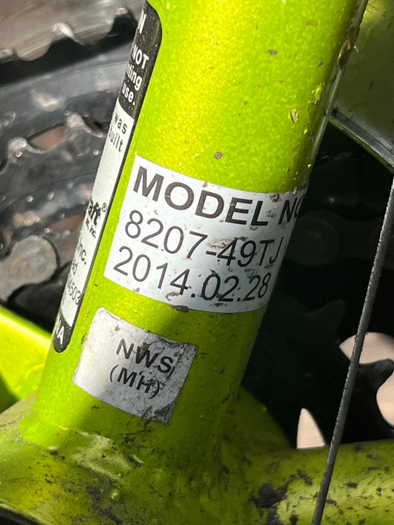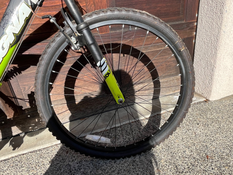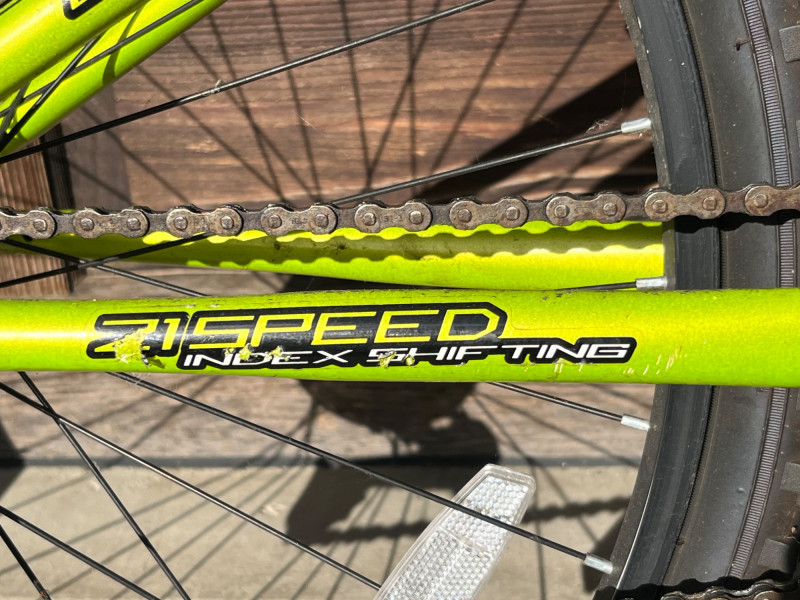 This MAGNA “Cliffhanger” mountain bike offers a rugged and reliable ride, built for both trail adventures and everyday use. Its bright green and black dual-suspension frame absorbs bumps from uneven terrain, while the 21-speed indexed gear system gives you the flexibility to climb hills or cruise flat paths with ease. The frame features bold MAGNA branding and stylized graphics, with a matching padded saddle for comfort. The bike is equipped with linear-pull brakes (V-brakes) front and rear, providing responsive stopping power. The tires are 26 x 1.95 with knobby tread, ideal for off-road grip and stability. A rear coil spring shock and front suspension fork work together to smooth out your ride, and the kickstand adds convenience for parking. Cosmetically, the bike shows signs of use: light scratches on the frame, some surface rust on the chain, and moderate wear on the tires. Mechanically, it’s in good working order—shifting, braking, and suspension have all been tested. This is a solid choice for someone looking for a dependable mountain bike with versatile gearing and a comfortable ride. Specifications Brand: Magna Model: Cliffhanger Frame: Steel with aluminum components Suspension: Dual (front fork + rear coil spring) Gearing: 21-speed indexed shifting Brakes: Linear pull (V-brake) Tires: 26 x 1.95 knobby tread Saddle: Padded black seat with Magna logo Color: Bright green with black and white accents Extras: Kickstand, reflectors Additional Details Model No: 8207-49TJ Date of Manufacture: 2014.02.28 Barcode: 016751180612 Manufacturer: Kent International Terms