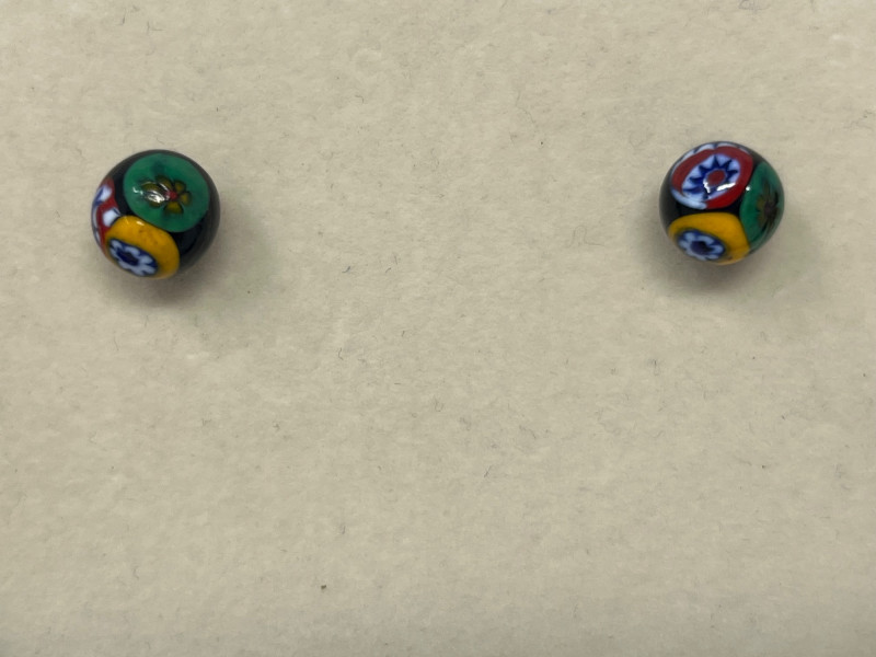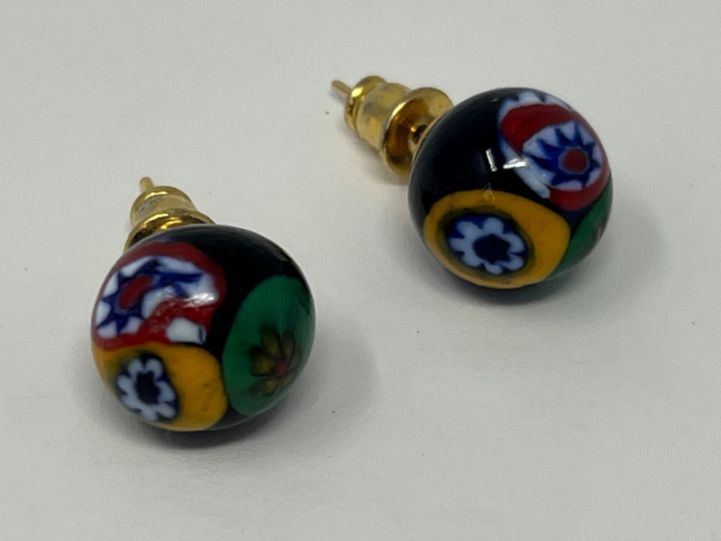 Colorful vintage jewelry set featuring two single-strand necklaces and a coordinating pair of drop earrings, all adorned with vibrant millefiori-style glass beads. Each piece showcases intricate floral and geometric patterns in richly colored glass, offering a playful yet timeless aesthetic. Necklace 1: Single-strand design with evenly spaced millefiori-style beads; finished with a metal spring ring clasp. Approx. 20 inches long. Necklace 2: Single-strand design with clustered millefiori-style beads and subtle variation in bead size; finished with a metal clasp. Approx. 18 inches long. Earrings: Pierced, French hook backs with matching millefiori beads and metal findings Materials: Millefiori-style glass beads; metal used only for clasps and earring hooks Condition: Excellent vintage condition; no chips or cracks in beads, minimal surface wear Era: Estimated mid-20th century A vibrant and versatile set that can be worn together or separately. Ideal for collectors, display, or adding a pop of color to any outfit.