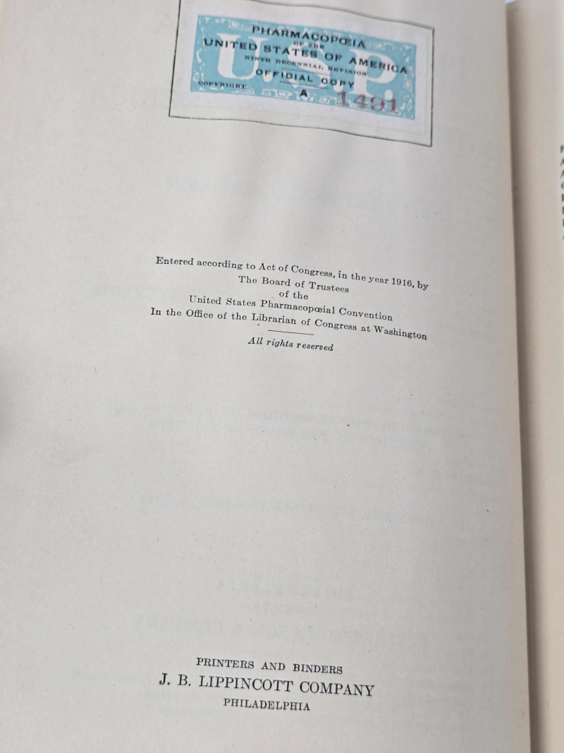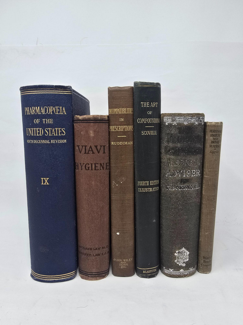 A curated selection of six early 20th-century medical and pharmaceutical texts, spanning pharmacopoeia, prescription safety, hygiene, compounding, and home nursing. These volumes offer historical insight into American medical education and practice, and are ideal for collectors, educators, or display. Titles & Publishing Details: Pharmacopœia of the United States of America – Ninth Decennial Revision