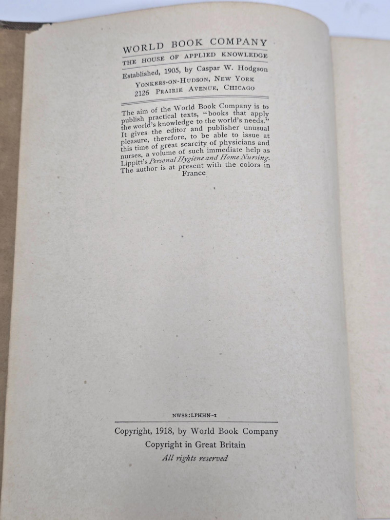 77th Edition, 1909. World's Dispensary Medical Association, Buffalo, NY. Personal Hygiene and Home Nursing by Louisa C. Lippitt, R.N. World Book Company, Yonkers-on-Hudson, NY. Copyright 1918. Condition: