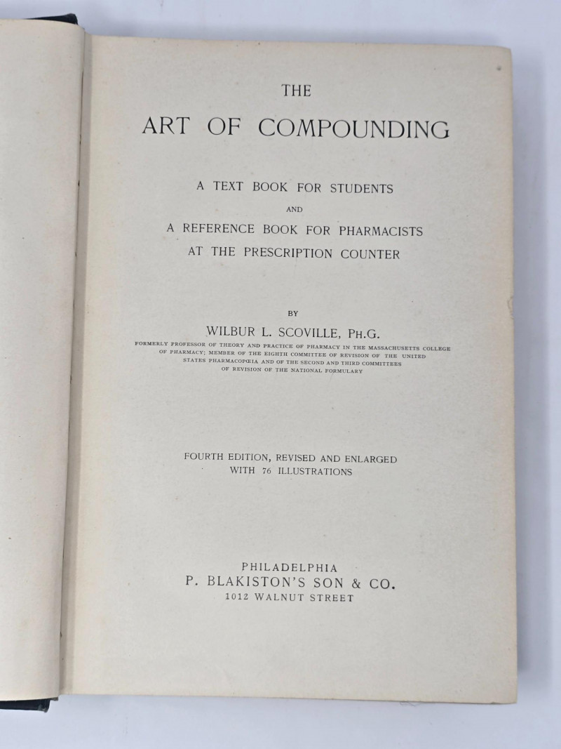 Copyrights: 1897, 1900, 1908. Printed by The Scientific Press, Brooklyn, NY. The Art of Compounding by Wilbur L. Scoville, Ph.G.