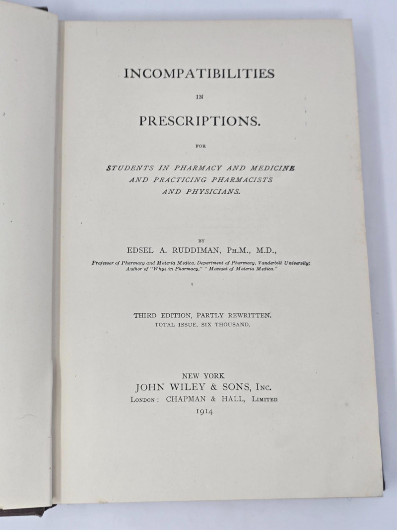 The Viavi Company, San Francisco, 1904. Copyright 1899. Incompatibilities in Prescriptions by Edsel A. Ruddiman, Ph.M., M.D.