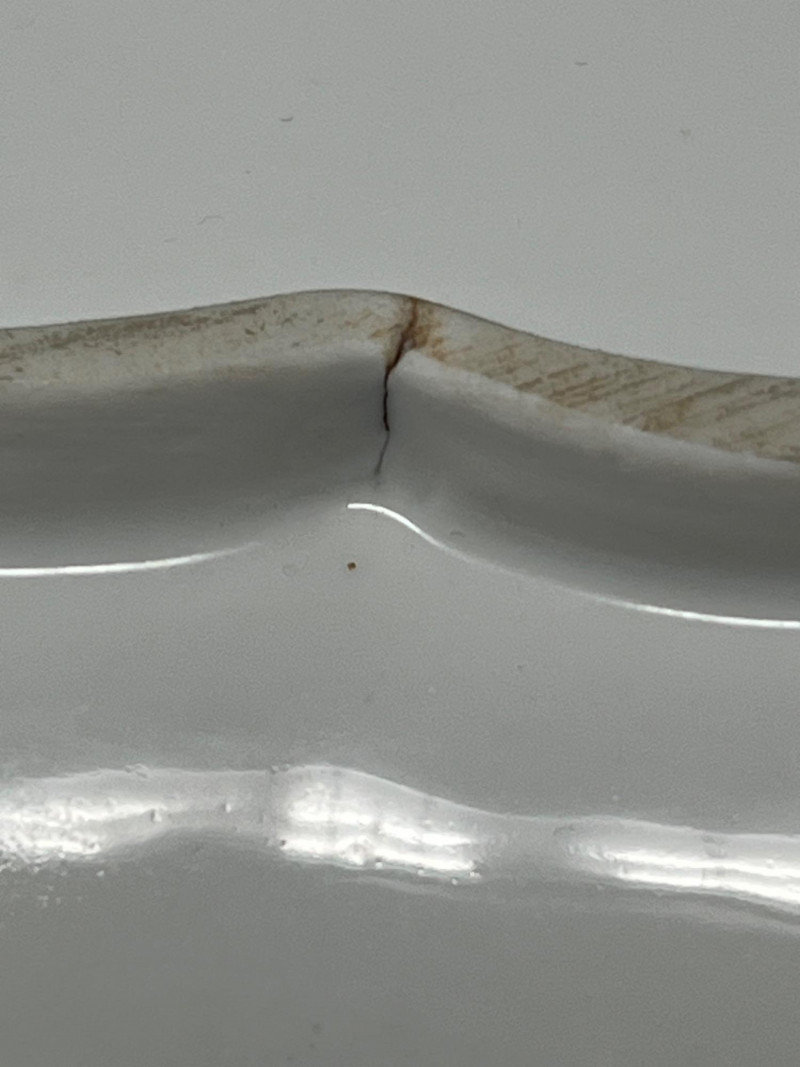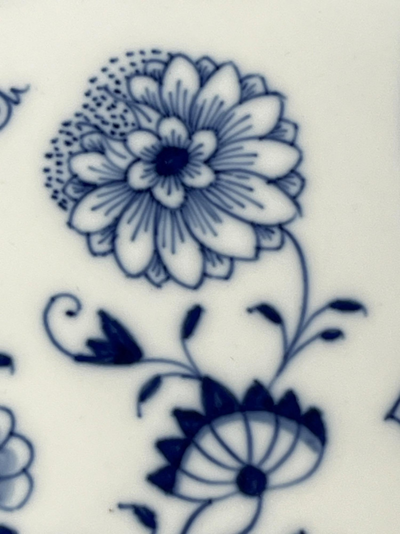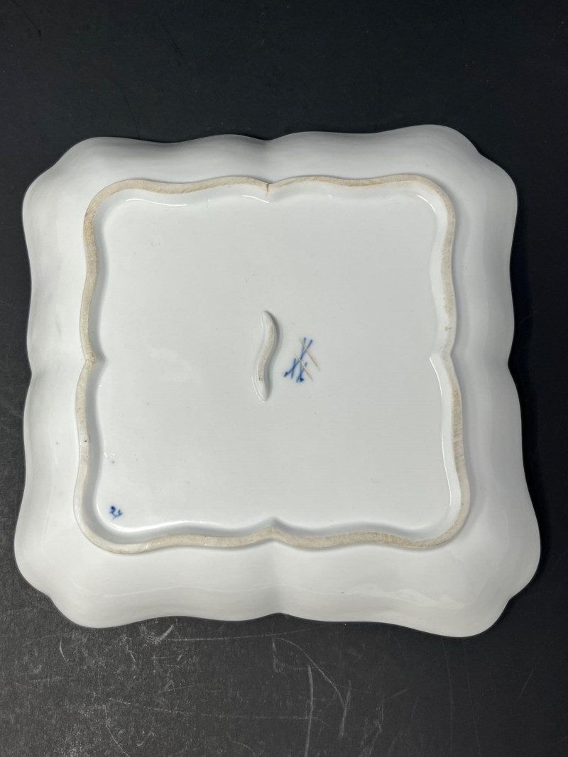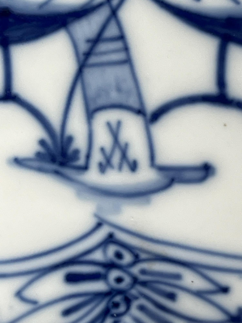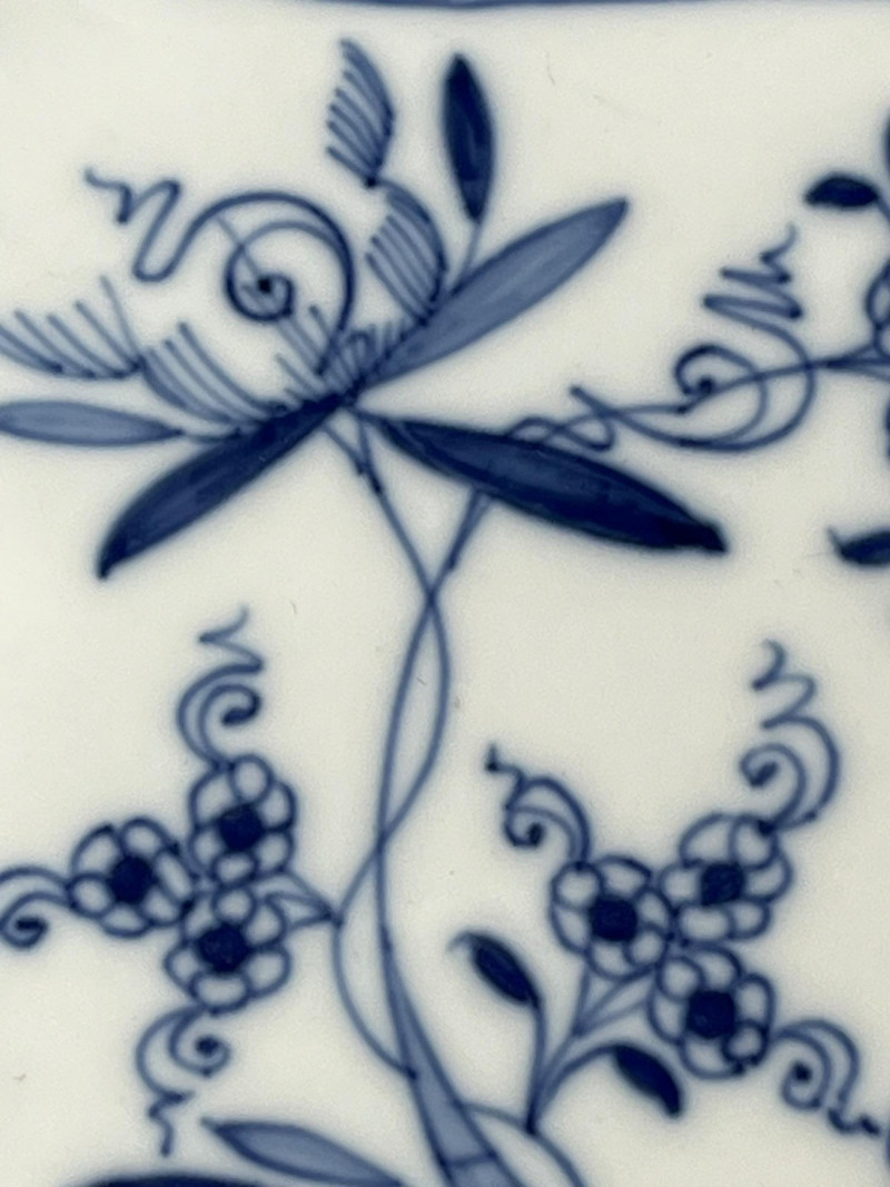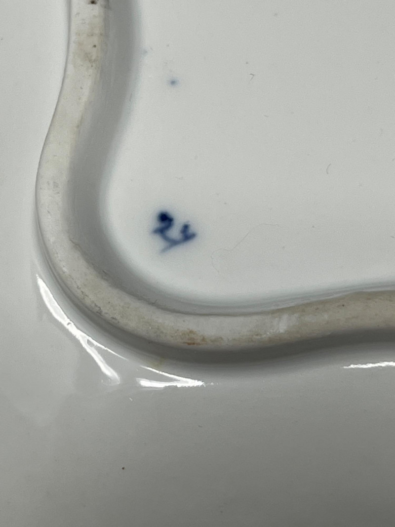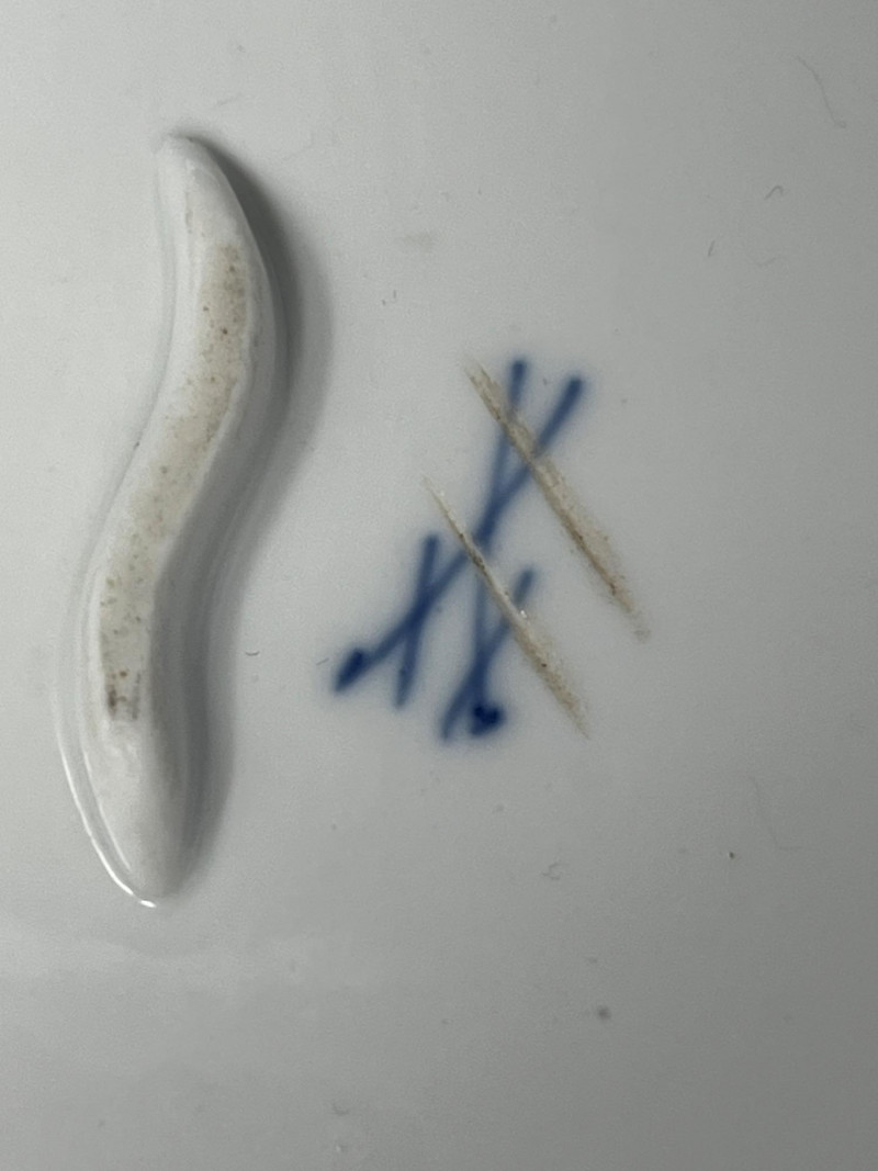 This hand-painted porcelain dish features the iconic Meissen crossed swords hallmark and a classic blue onion floral motif. A fine example of 19th-century European craftsmanship, ideal for collectors of authentic Meissen or blue-and-white ceramics. Maker: Meissen Porcelain (Germany) Pattern: Blue Onion (Zwiebelmuster) Material: Glazed porcelain Dimensions: Approx. 8.5" diameter Markings: Blue crossed swords underglaze mark on base; additional painter’s mark visible Design Features: Scalloped rim with hand-painted floral and botanical motifs Central bird among stylized foliage Traditional cobalt blue on white glaze Overall condition: Fair to good antique condition Notable flaws: Hairline crack along rim with visible discoloration Minor staining and wear consistent with age Underside shows typical shelf wear and glaze thinning Display appeal: Strong visual presence despite flaws; ideal for cabinet display or decorative use Authentic Meissen: Crossed swords hallmark confirms origin Estimated date: Late 19th to early 20th century Style: European Rococo revival with Asian-inspired motifs This dish exemplifies Meissen’s enduring legacy in European porcelain. The Blue Onion pattern, inspired by Chinese Qing dynasty designs, became a hallmark of German ceramic artistry. Despite its imperfections, this piece retains historical and decorative value.Item Details
