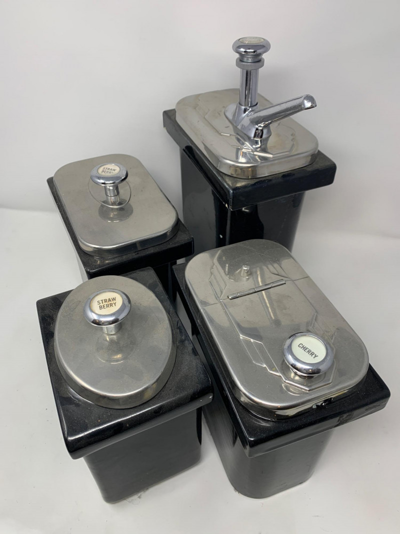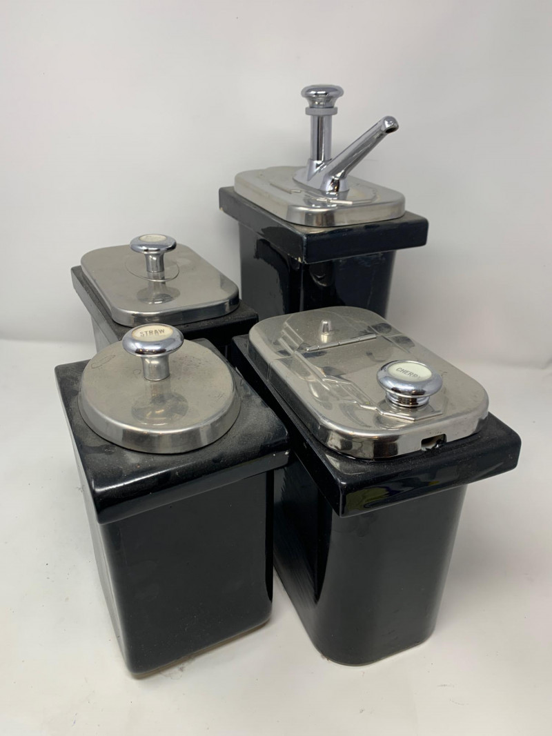 This vintage Hall China set includes one syrup dispenser and three matching topping containers, all finished in a rich, glossy black glaze. Originally designed for commercial use in soda fountains and luncheonettes, these pieces offer timeless appeal for collectors and display. Included in this set: One Hall China syrup dispenser with chrome pump Three Hall China lidded topping containers All pieces marked “Hall” on the base Dimensions: