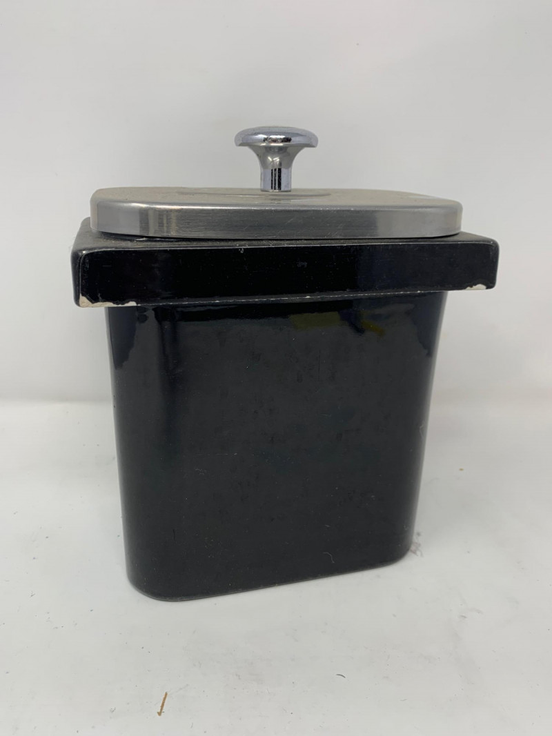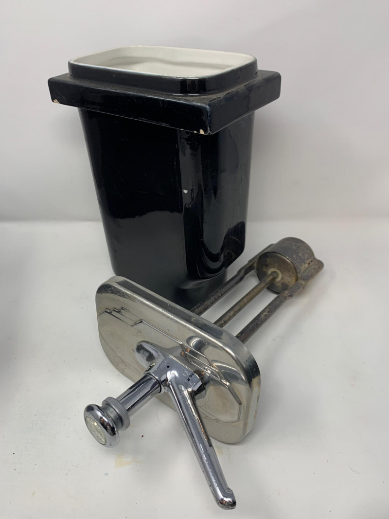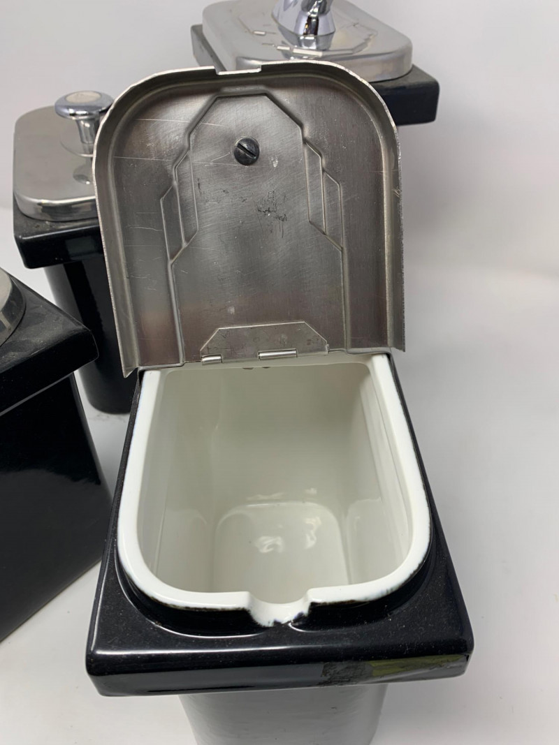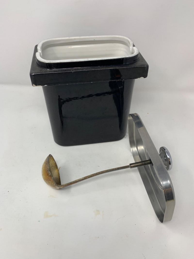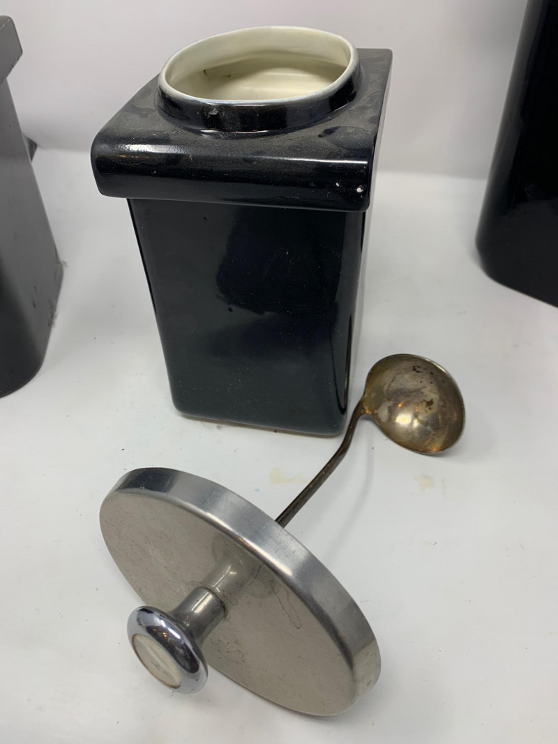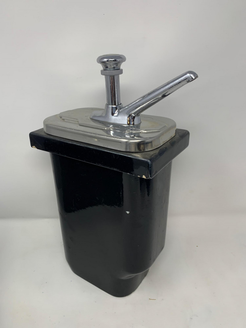 Visible signs of age and use throughout. Expect scattered chips, surface scratches, and wear to the glaze and hardware. These imperfections are documented in the photographs. The pump mechanism is present but untested. Highlights: Matching set in classic black glaze Durable vitrified china construction Ideal for display, restoration, or prop styling Sought-after by collectors of vintage restaurantware A cohesive and visually striking set with authentic mid-century character.