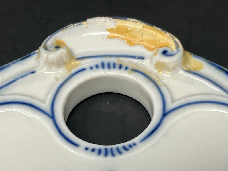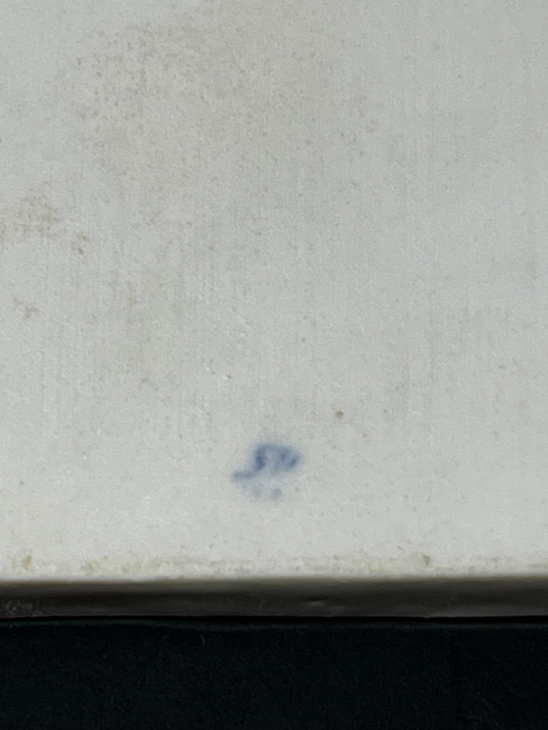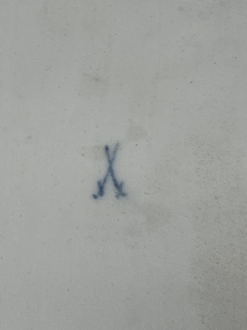 A fine example of Meissen craftsmanship, this antique butter board features the iconic “Blue Onion” (Zwiebelmuster) pattern, first introduced in the 18th century and beloved by collectors worldwide. The crisp cobalt blue floral motif is hand-painted on white porcelain, showcasing Meissen’s signature underglaze technique. Maker: Meissen, Germany Pattern: Blue Onion (Zwiebelmuster) Form: Butter board / small serving tray Markings: Underglaze crossed swords mark to base Estimated Date: Late 19th to early 20th century Condition: Some repairs have been done- see photos. Light wear consistent with age and use throughout. This piece is ideal for display or use in a refined table setting. A charming addition to any collection of European porcelain or Blue Onion-patterned wares. From what we can tell this piece should be able to clean up nicely and the yellow glaze should be able to be removed without harm.