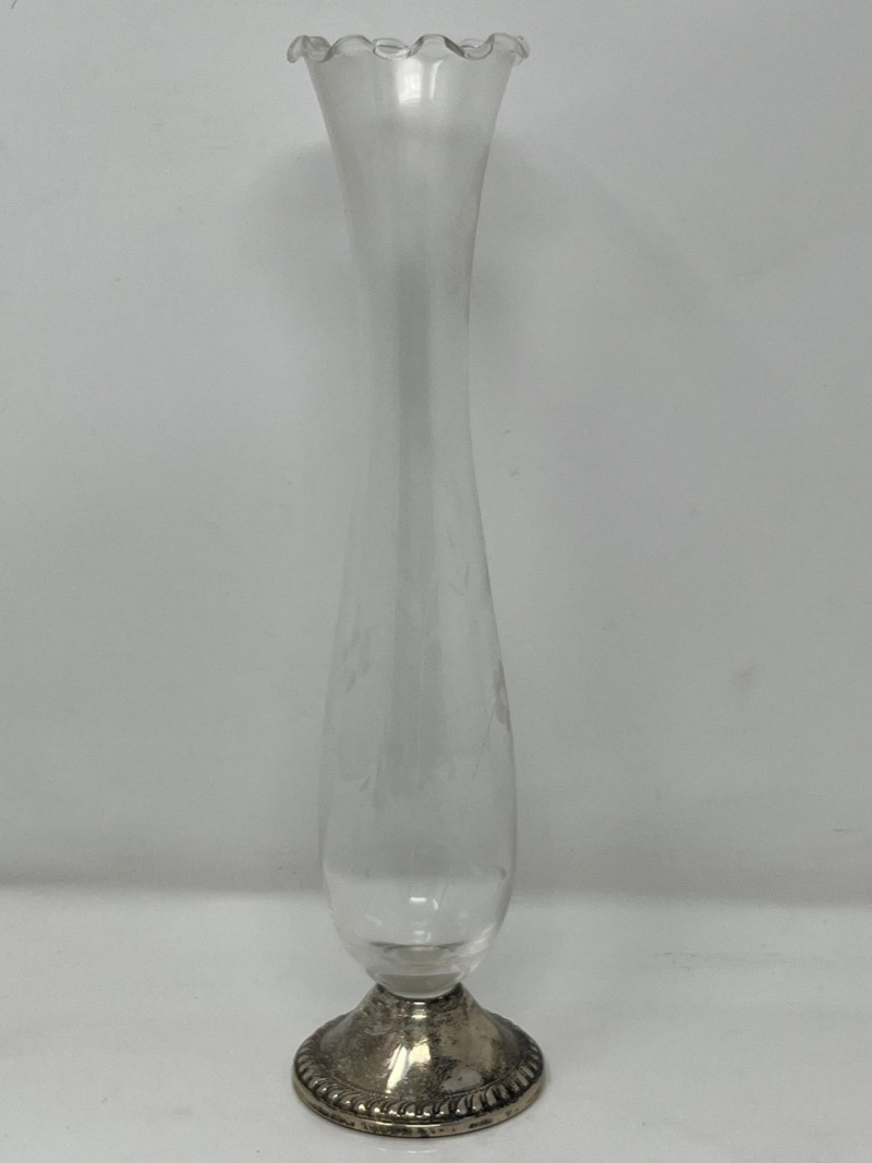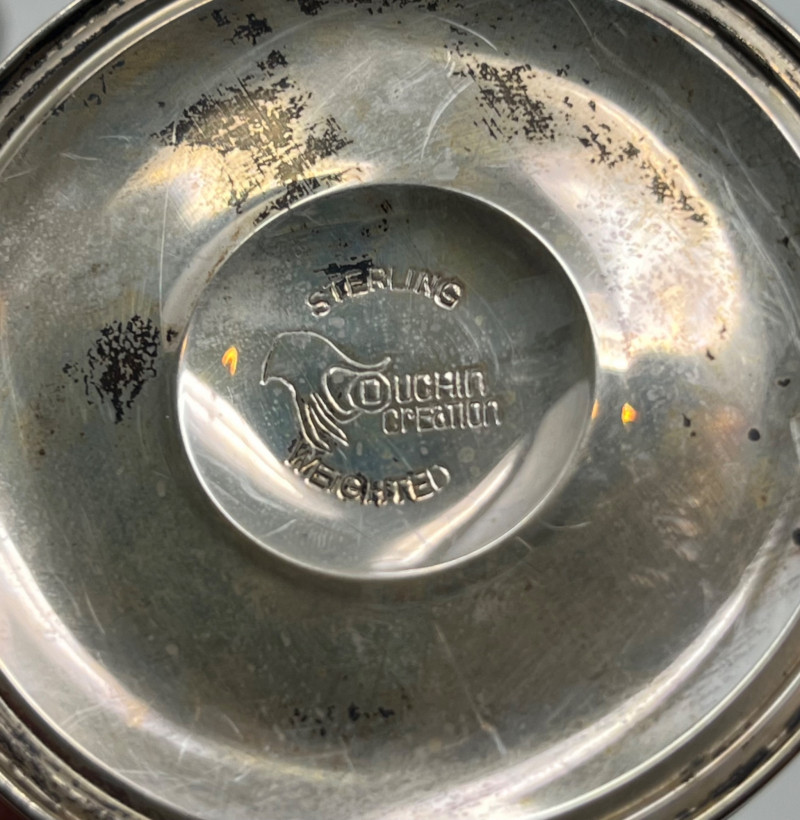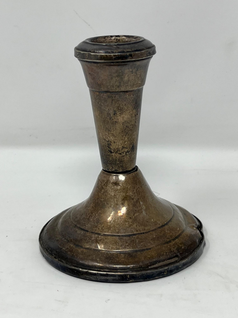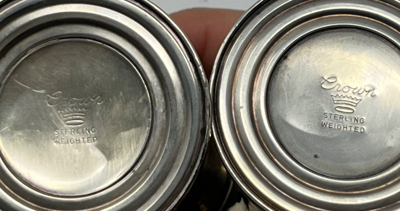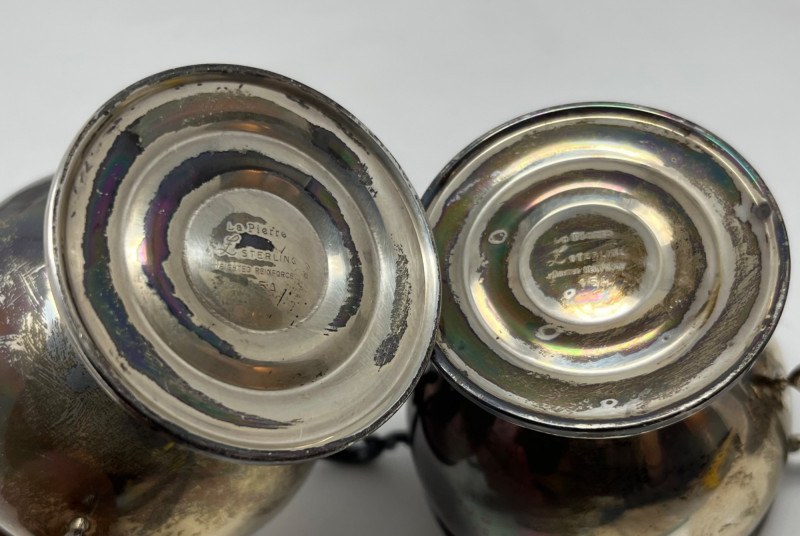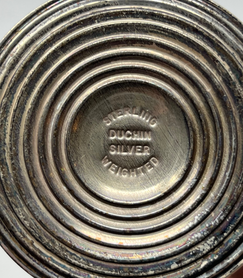 A cohesive and elegant set of vintage weighted sterling silver and glass pieces from respected American silversmiths. This collection includes: (3) Glass Vases (2) marked Duchin Silver (1) marked Newport All feature weighted sterling silver bases with flared or trumpet-style silhouettes Salt & Pepper Shakers Marked Crown Clear glass bodies with weighted sterling silver screw-top lids and bases Single Candlestick Marked Frank M. Whiting Traditional design with smooth column and flared base Creamer & Sugar Set Marked La Pierre Matching glass bodies with weighted sterling silver bases; sugar bowl includes lid Condition: Light surface wear consistent with age. No cracks or chips in glass. Silver bases show mild patina and are structurally sound. Maker marks are clearly visible where present (see photos). Era: Mid-20th century Marks: All silver components are stamped “Sterling Weighted” along with respective maker marks. This set offers timeless craftsmanship and visual harmony, ideal for collectors of American silver or vintage tableware. Perfect for display, entertaining, or gifting.