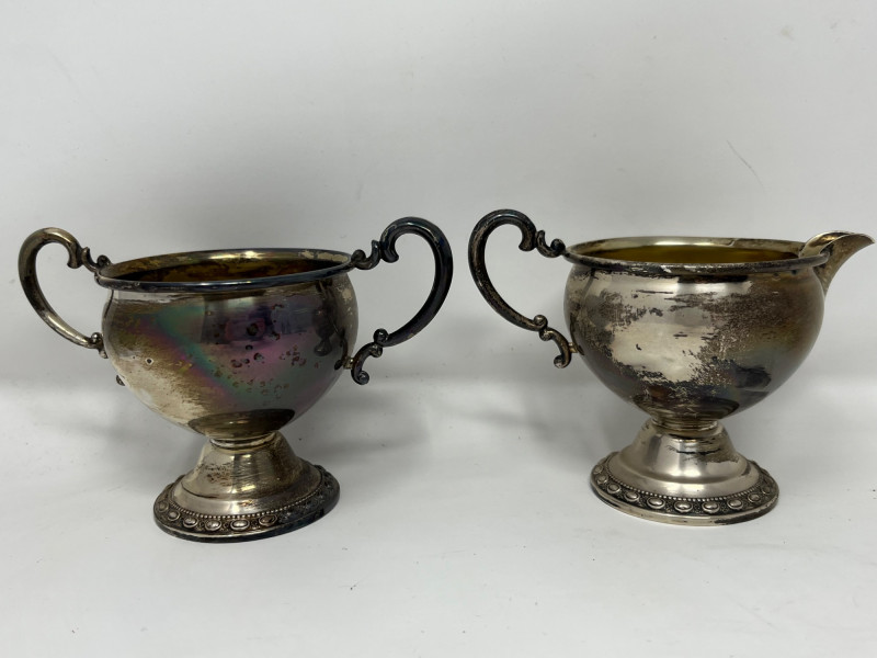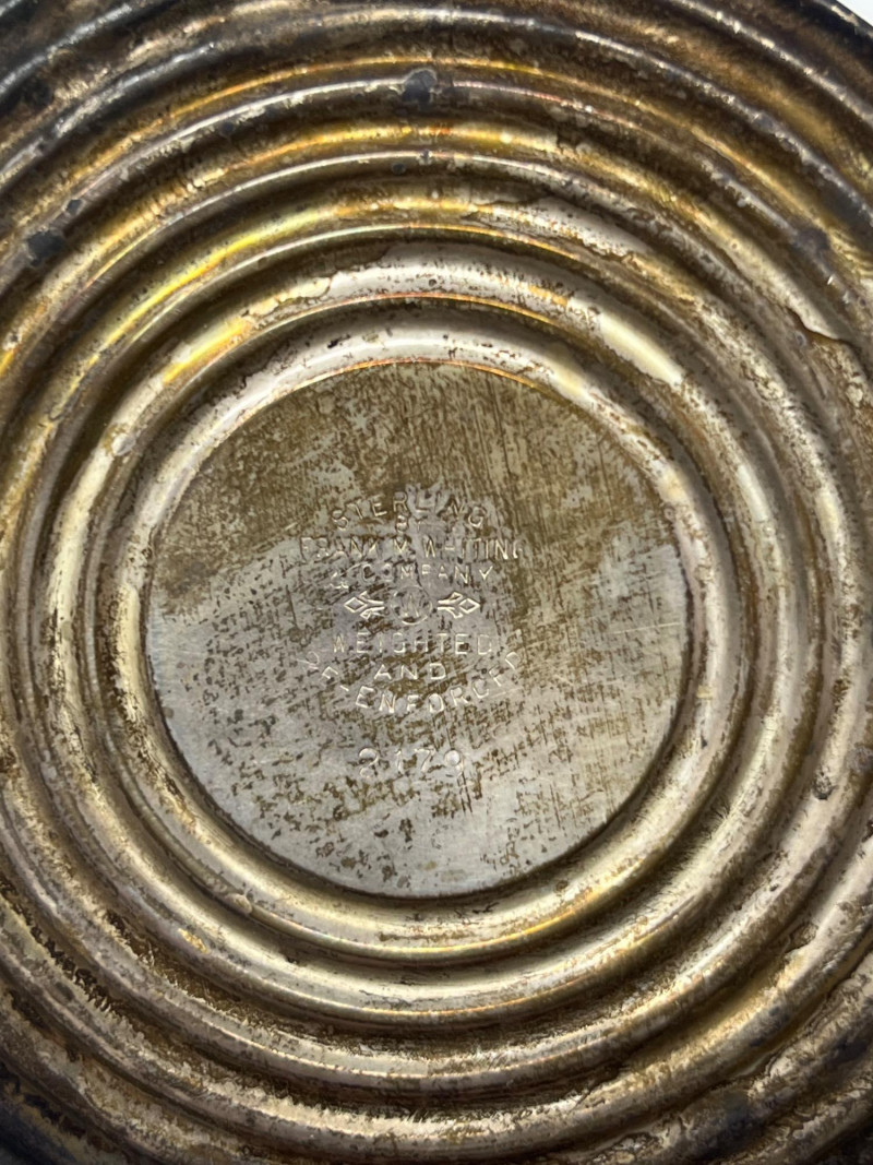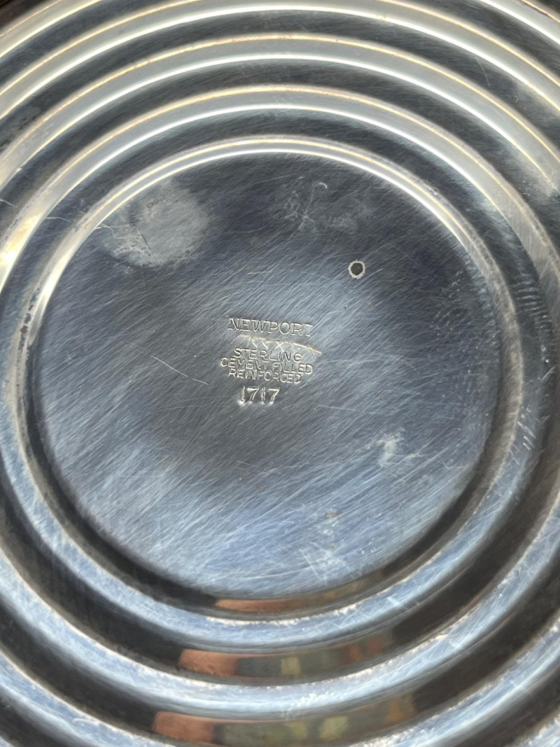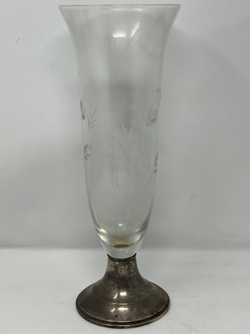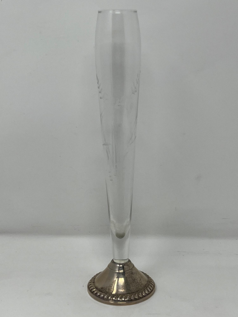A cohesive and elegant set of vintage weighted sterling silver and glass pieces from respected American silversmiths. This collection includes: (3) Glass Vases (2) marked Duchin Silver (1) marked Newport All feature weighted sterling silver bases with flared or trumpet-style silhouettes Salt & Pepper Shakers Marked Crown Clear glass bodies with weighted sterling silver screw-top lids and bases Single Candlestick Marked Frank M. Whiting Traditional design with smooth column and flared base Creamer & Sugar Set Marked La Pierre Matching glass bodies with weighted sterling silver bases; sugar bowl includes lid Condition: Light surface wear consistent with age. No cracks or chips in glass. Silver bases show mild patina and are structurally sound. Maker marks are clearly visible where present (see photos). Era: Mid-20th century Marks: All silver components are stamped “Sterling Weighted” along with respective maker marks. This set offers timeless craftsmanship and visual harmony, ideal for collectors of American silver or vintage tableware. Perfect for display, entertaining, or gifting.