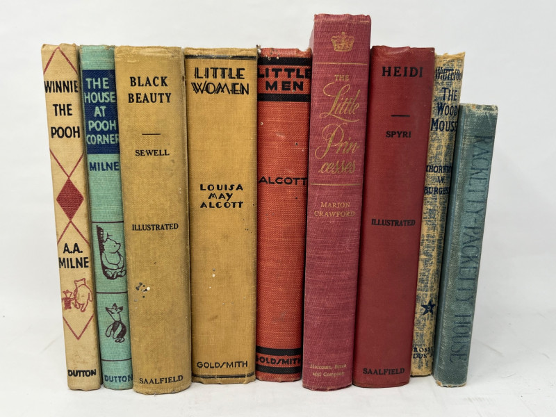 A well-preserved collection of nine vintage children's books spanning beloved classics, illustrated editions, and mid-century reprints. Each volume reflects its original publisher’s character and era, making this lot ideal for collectors, educators, or display. Titles Included: Winnie the Pooh by A.A. Milne – Dutton edition The House at Pooh Corner by A.A. Milne – Dutton edition Black Beauty by Anna Sewell – Illustrated, Saalfield Publishing Little Women by Louisa May Alcott – Goldsmith edition Little Men by Louisa May Alcott – Goldsmith edition The Little Princesses by Marion Crawford – Museum Press Ltd., London Heidi by Johanna Spyri – Illustrated, Saalfield Publishing The Adventures of the Wood Mouse by Thornton W. Burgess The Adventures of Reddy Fox by Thornton W. Burgess Provenance & Condition: Publishers include Dutton, Goldsmith, Saalfield, and Museum Press—each known for mid-century children’s literature and collectible reprints. Books show vintage wear: softened corners, spine fading, and foxing typical of age. Bindings remain mostly intact; pages complete and legible. Illustrated editions retain original artwork. Sold as-is for authenticity. This lot is offered as a complete set. Please review photos for condition details.