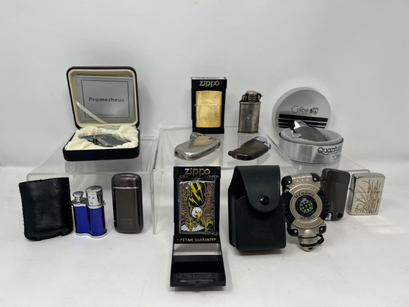 A striking collection of 12 vintage and antique lighters, spanning multiple decades and styles—from Art Deco elegance to mid-century utility. This diverse lot is ideal for collectors, decorators, or anyone drawn to the craftsmanship of classic smoking accessories. Included in this collection: Ronson Varaflame (c. 1950s): Chrome finish, Art Deco styling. Untested; light surface wear. Zippo Windproof Lighter (c. 1960s): Brushed steel with original insert. Hinges intact, flint wheel sparks. Evans Table Lighter (c. 1940s): Brass body with Bakelite base. Unmarked, classic silhouette. Japanese Petrol Lighter (c. 1930s): Engraved case, souvenir-style. Age-appropriate patina. Miscellaneous Pocket Lighters (c. 1940s–1970s): Includes varied finishes—chrome, enamel, faux tortoiseshell, and brushed metal. Original Cases: Select lighters include their original branded or fitted cases, enhancing display and collector appeal. Condition Notes: