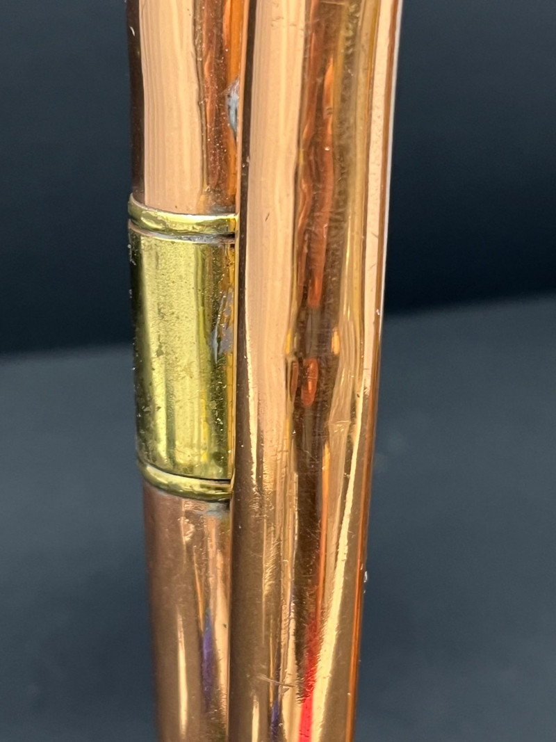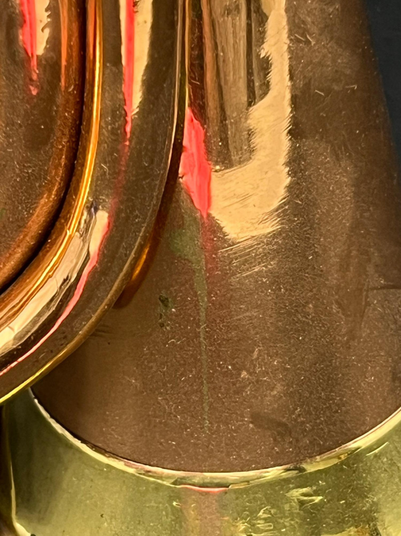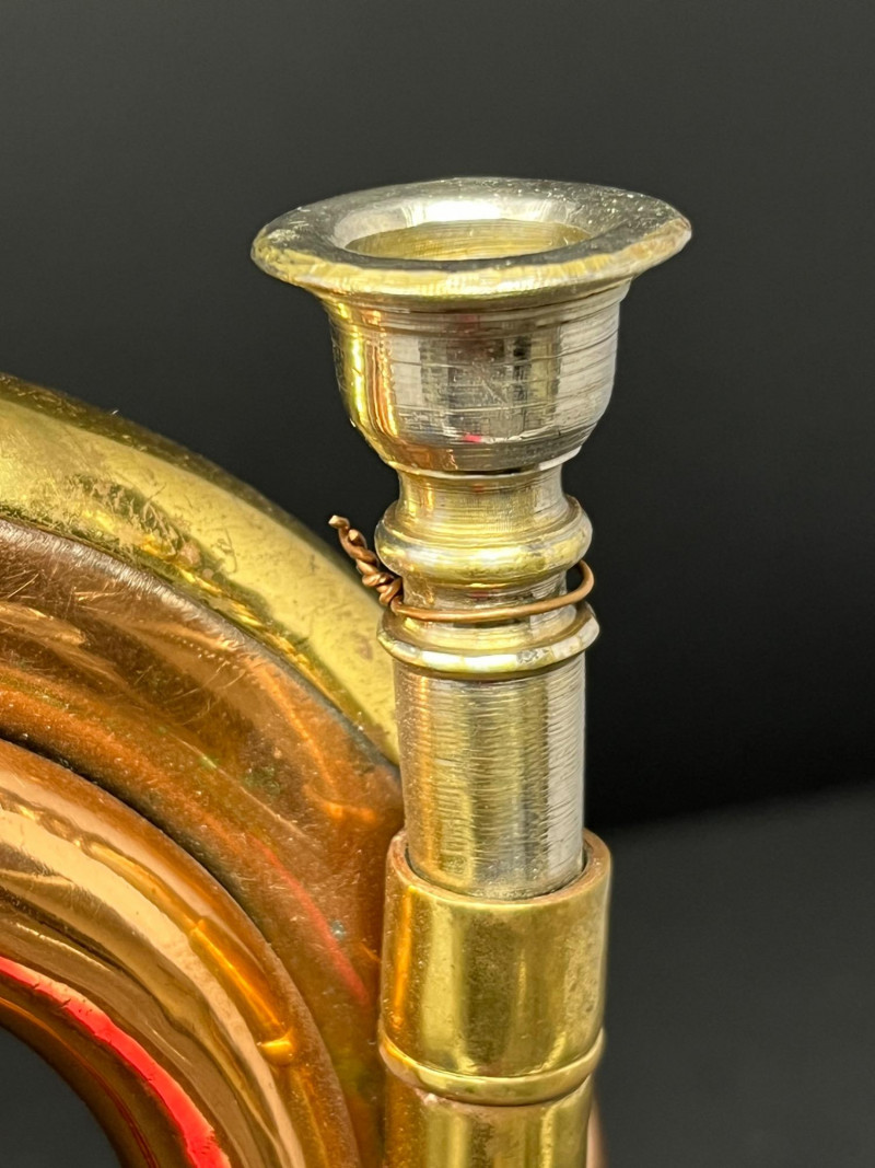 This authentic military-style bugle is crafted from a blend of copper and brass, giving it a rich, warm patina and a distinctive, timeworn character. With visible dents and dings, it shows clear signs of use—likely from years of service in drills, ceremonies, or field communication. Materials: Copper and brass Condition: Well-worn with dents and surface wear; structurally sound and playable Sound: Loud, clear tone Use: Ideal for military reenactments, collectors, or display Bugles have long been used by armed forces worldwide to signal commands, from wake-up calls to battlefield maneuvers. This piece reflects that legacy—possibly modeled after the U.S. Regulation “G” bugle, a standard in 19th and 20th-century military use. A rugged, storied instrument that still speaks.