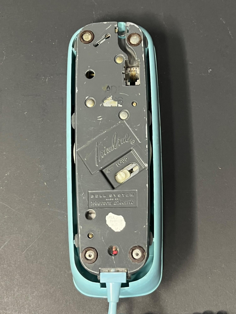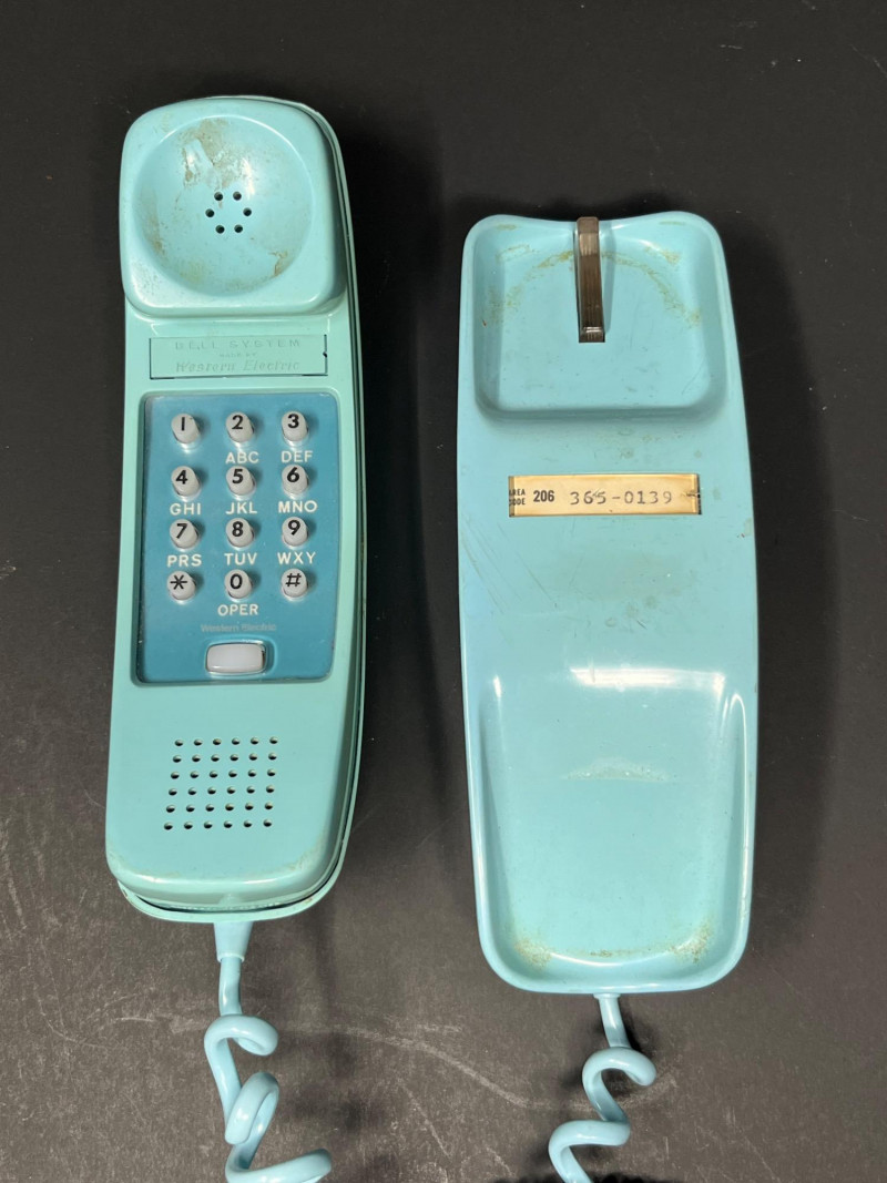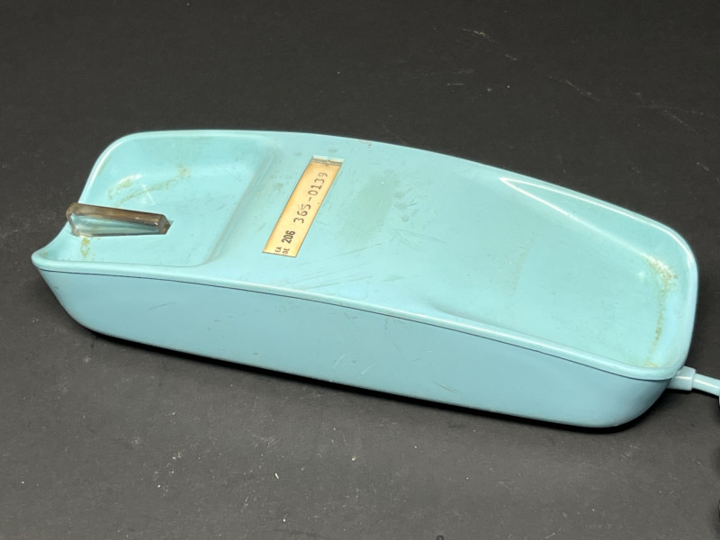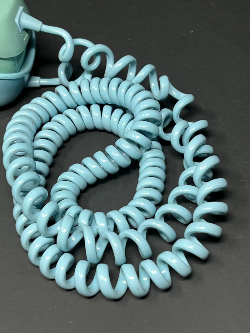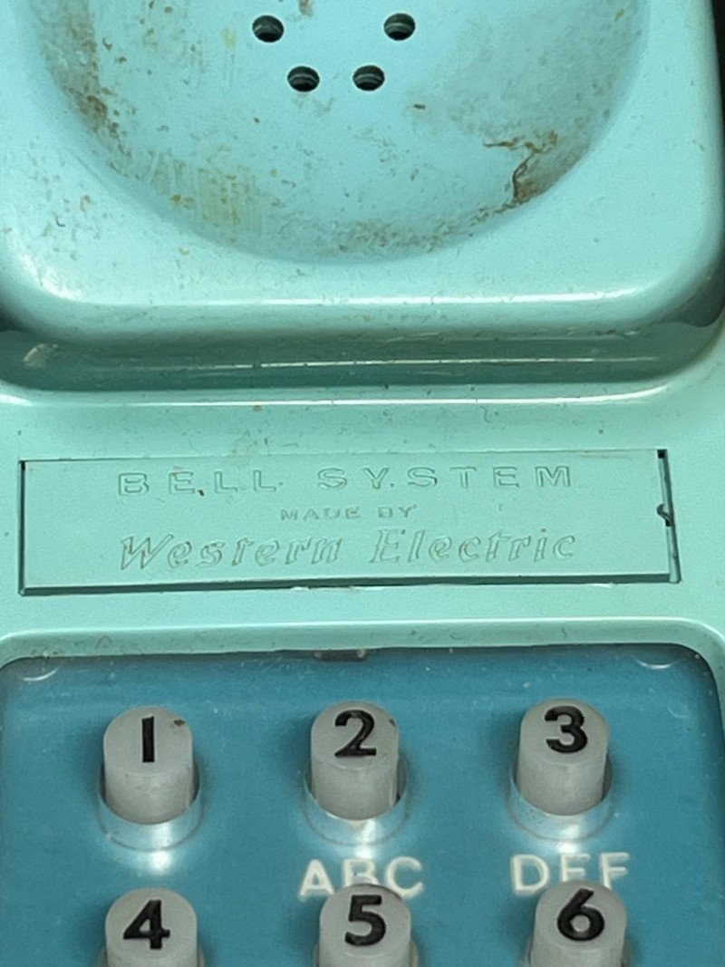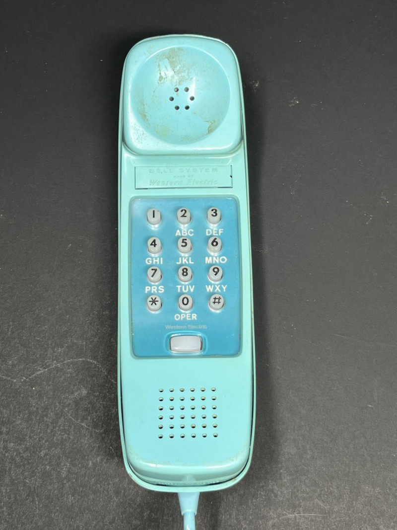This vintage Western Electric Bell System push-button phone features a distinctive mint green-blue color and classic mid-century styling. A charming example of early touch-tone technology, it’s ideal for collectors, decorators, or anyone drawn to retro design. Features: Authentic Western Electric Bell System push-button model Eye-catching mint green/blue plastic housing Original handset and button layout Bell ringer mechanism present (untested) Western Electric and Bell System markings Condition: Visible surface wear consistent with age and use No visible cracks or structural damage Untested and sold as-is; no cords or modular connectors included Handset and body show vintage patina Notes: