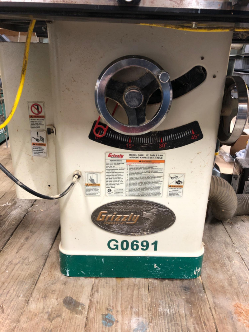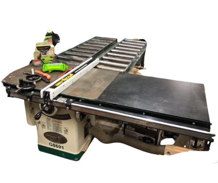Precision meets power in this Grizzly G0691 cabinet-style table saw, built for serious woodworkers and contractors. With a side stabilizer table extending the width to 82 inches and integrated roller extensions creating a cutting length of nearly 100 inches, this Grizzly table saw is ideal for ripping long boards, sheet goods, and dimensional lumber. The 3 HP motor and heavy-duty cast iron table ensure stability and accuracy, while the T-square fence system delivers smooth, repeatable cuts. Whether you're outfitting a shop or upgrading your jobsite gear, this saw is ready to perform. 3 HP, 220V cabinet-style saw 100" cutting length with roller extensions (detached from table and measure 65 inches length x 20 inches wide (each) x 34 inches adjustable height) Heavy-duty cast iron table (34 inches height x 32 inches depth x 82 inches with side extension) Precision T-square fence system Ideal for longboard and sheet material cutting