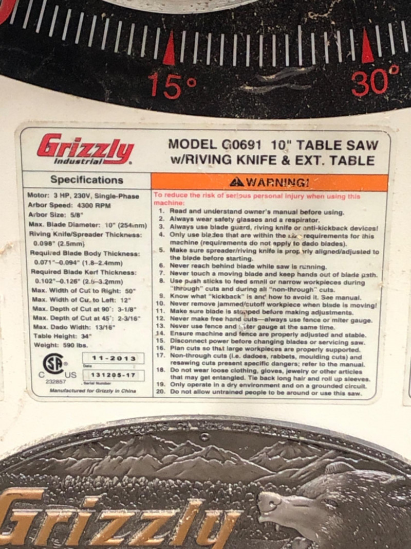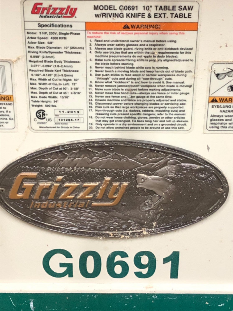 Lot # 2 - Grizzly G0691 Table Saw with Roller Extensions –82" Longboard Capacity