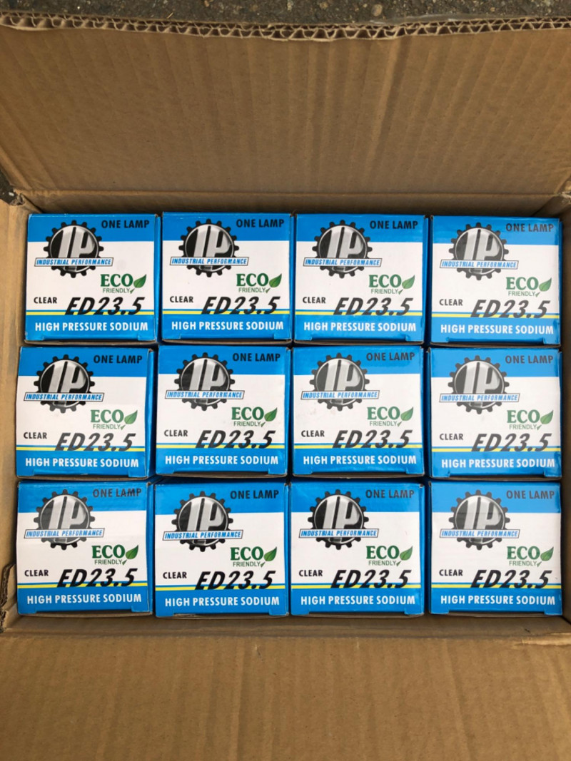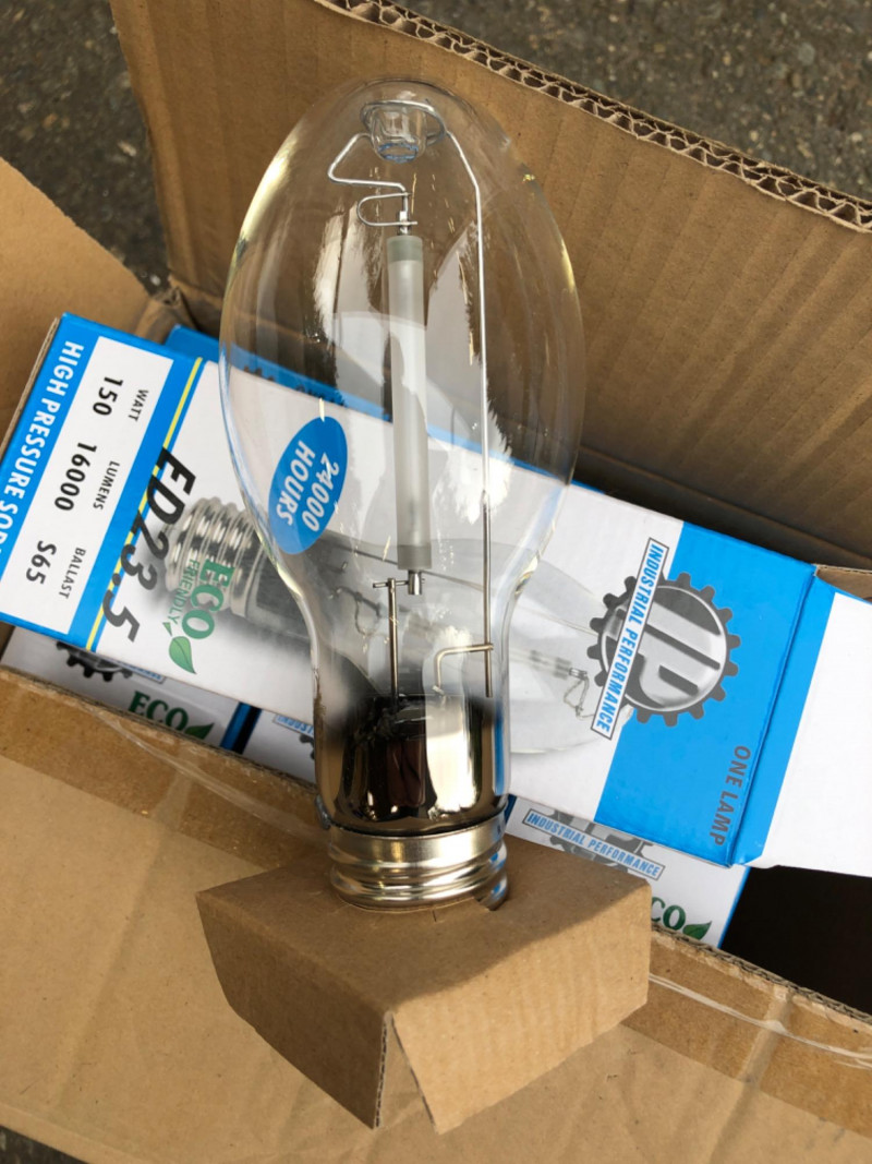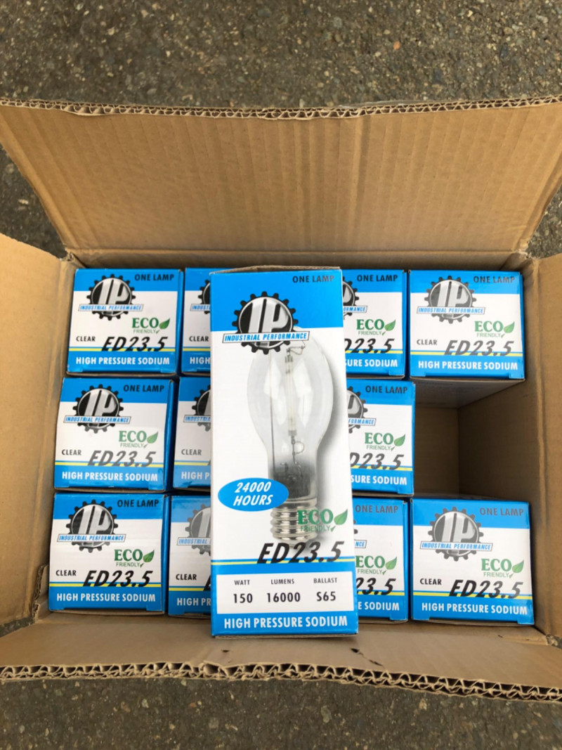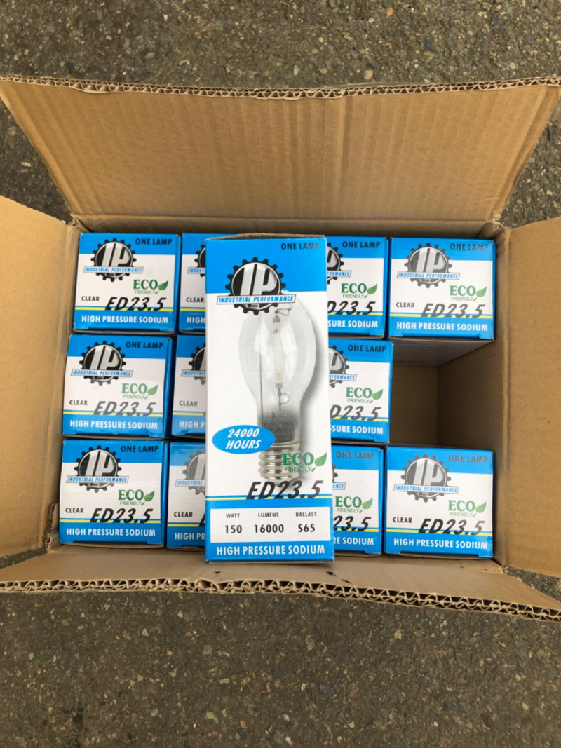 Set of twelve high pressure sodium light bulbs, each rated at 150 watts. Designed for industrial and commercial lighting applications, these bulbs provide bright, efficient illumination. Suitable for warehouses, outdoor fixtures, or shop environments requiring consistent, high‑intensity light. Need Shipping?: Contact LoopCycle