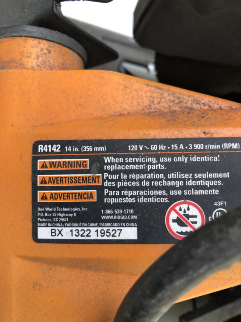 Ridgid, Model R4142, 15‑amp abrasive cut‑off saw with 14‑inch blade capacity. Built for cutting metal and construction materials with precision and speed. Durable housing and contractor‑grade design make it suitable for shop or jobsite use.