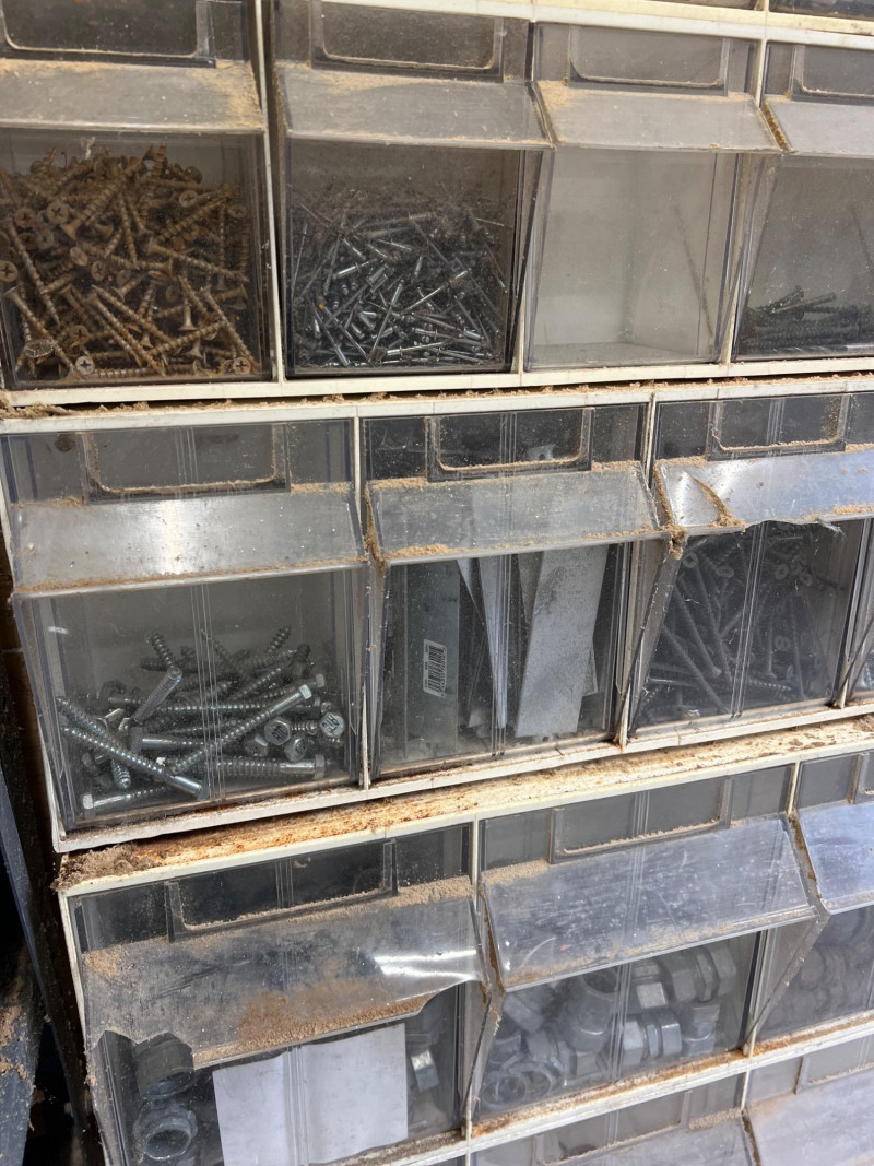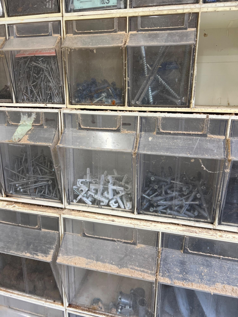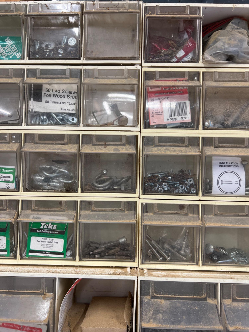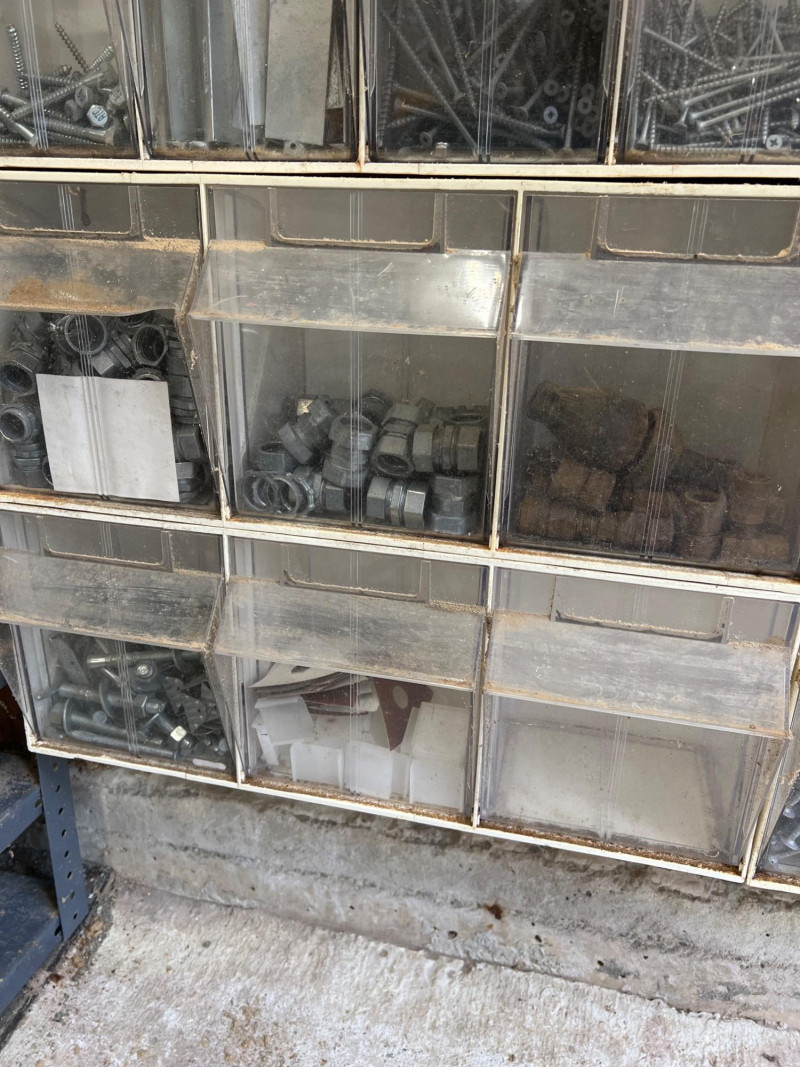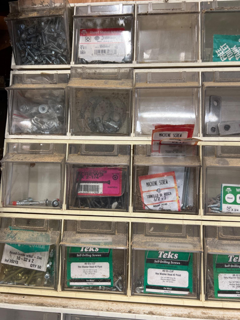 Assorted rack and plastic organizers full of miscellaneous screws, nails, washers, bolts, couplers and more. Comprehensive hardware selection suitable for construction, repair, and shop projects. Organized for easy access and versatile use across applications. Includes all in picture along with the organizer. Buyer removes from wall.