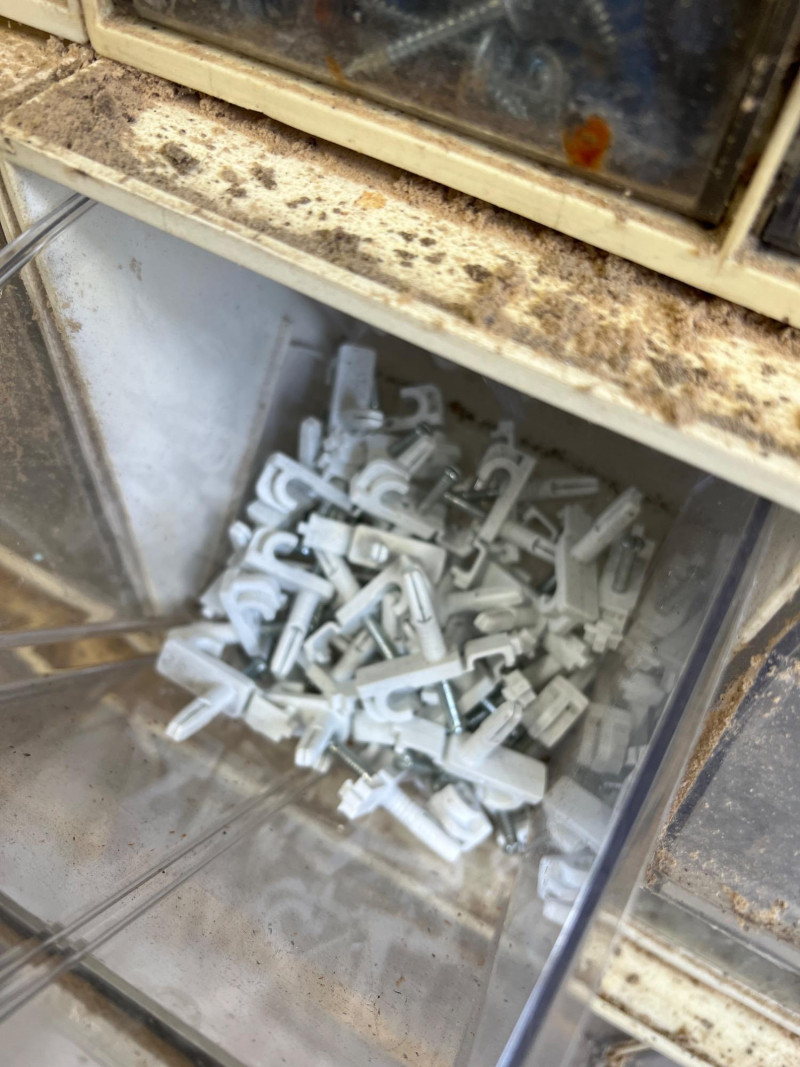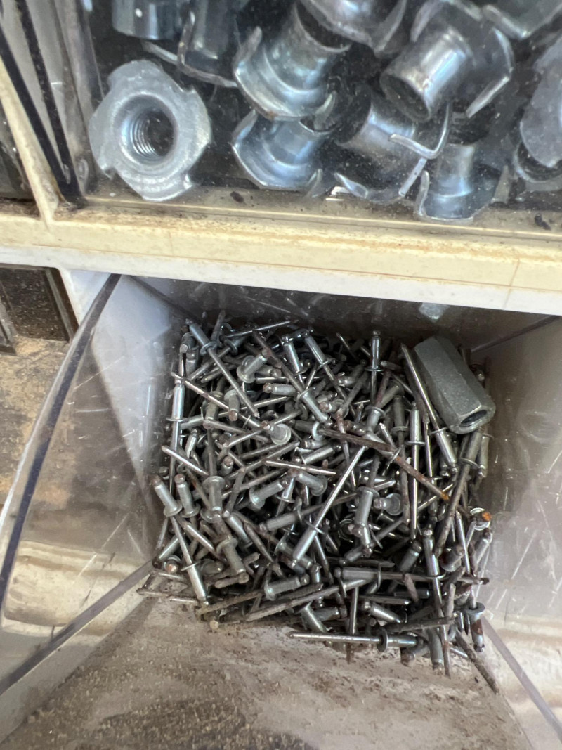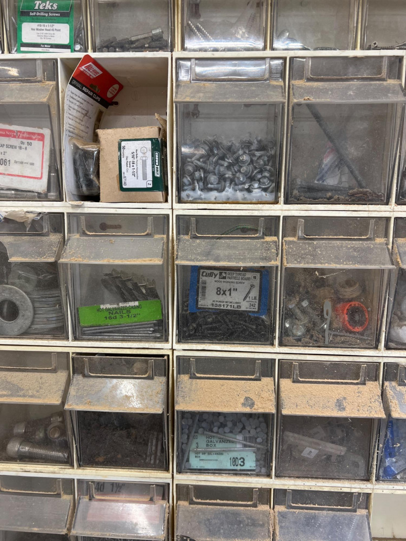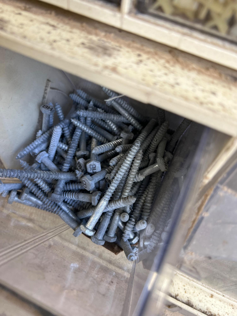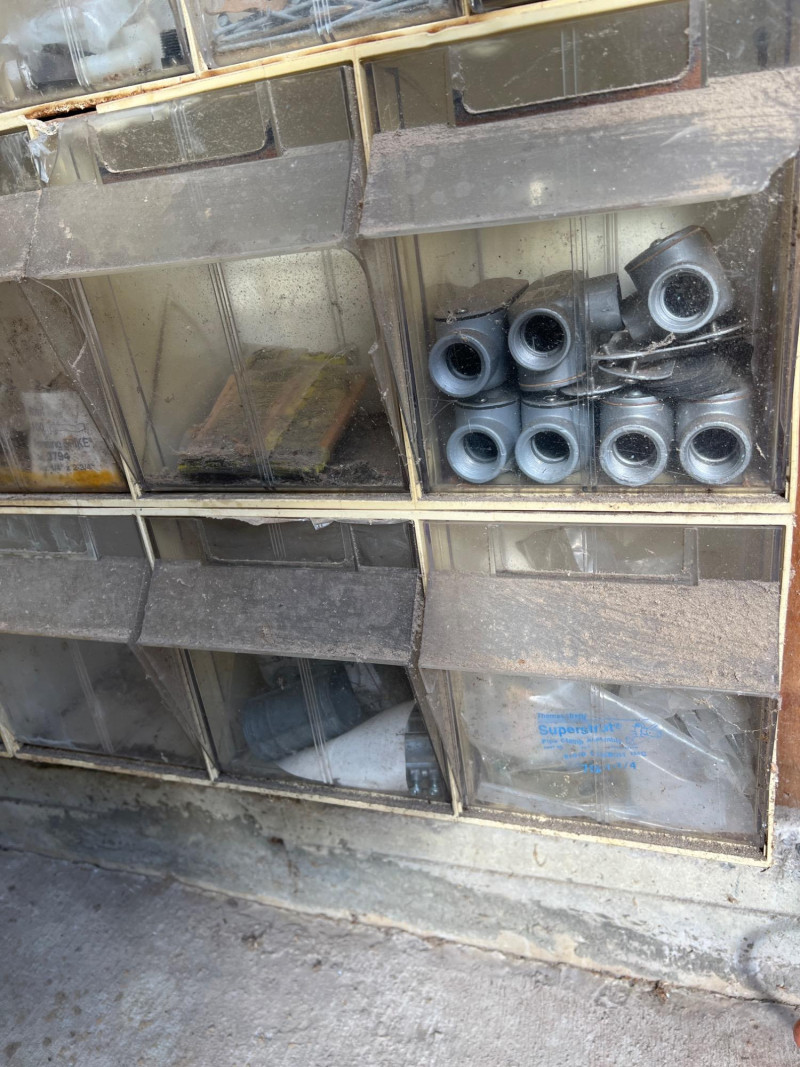 Assorted rack and plastic organizers full of miscellaneous screws, nails, washers, bolts, couplers and more. Comprehensive hardware selection suitable for construction, repair, and shop projects. Organized for easy access and versatile use across applications. Includes all in picture along with the organizer. Buyer removes from wall.
