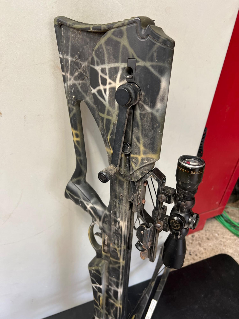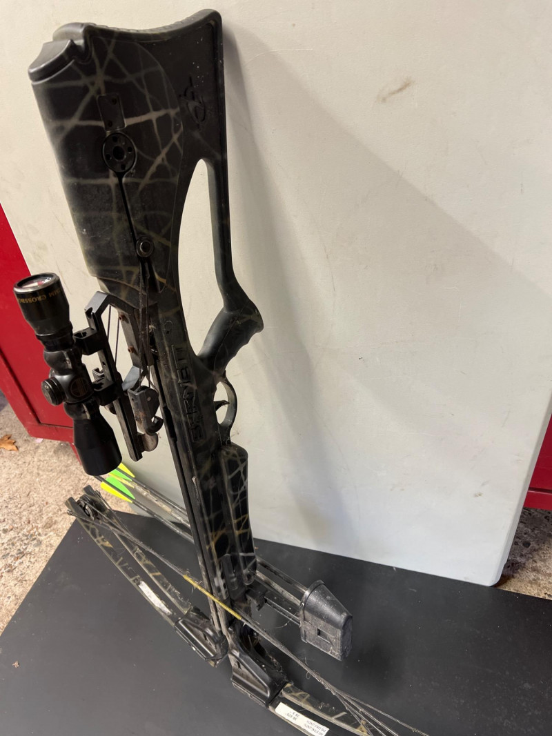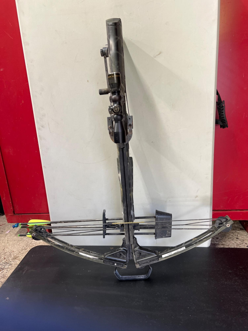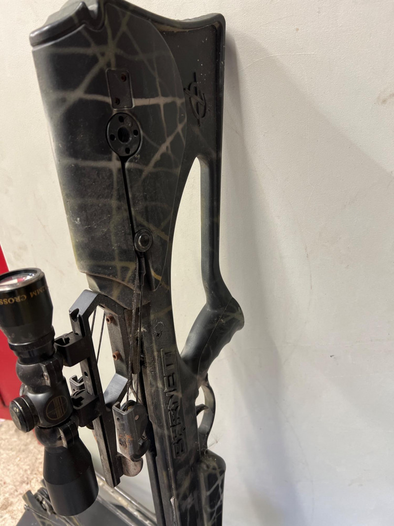 High‑performance Barnett crossbow complete with arrows and mounted scope for precision targeting. Crossbow: Barnett model, designed for accuracy and durability. Scope: Mounted scope enhances aim and long‑range precision. Arrows: Includes a set of compatible arrows for immediate use. Utility: Ideal for sporting, target practice, or collectors of quality archery equipment.