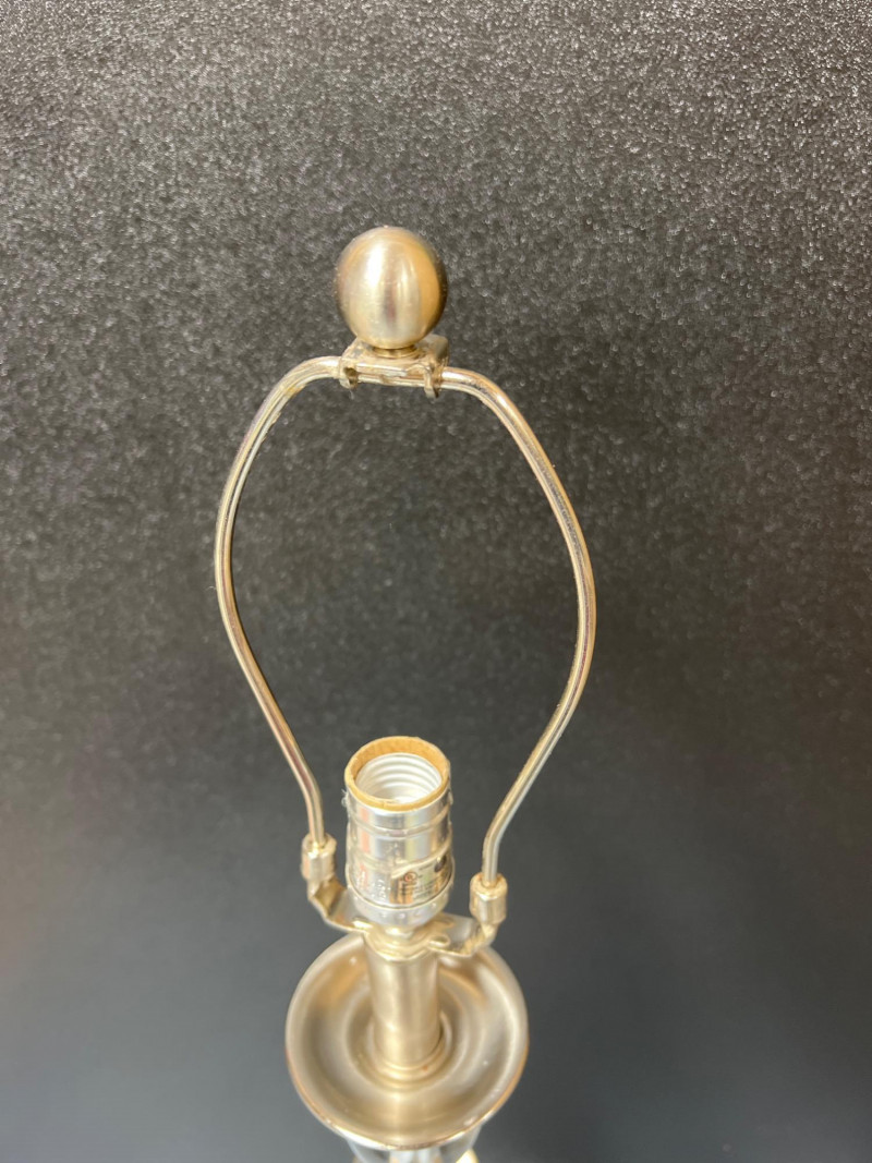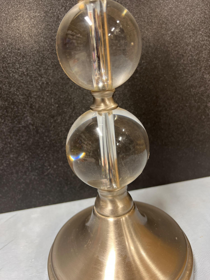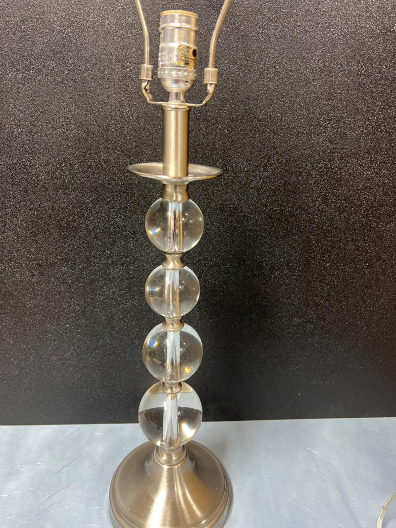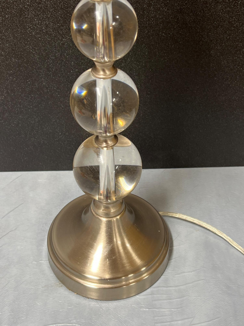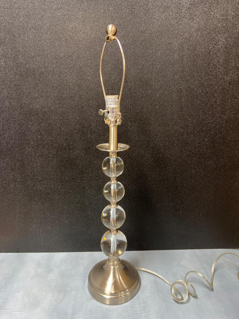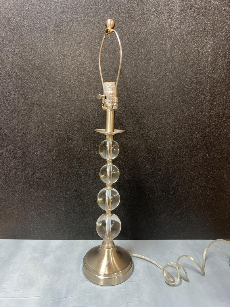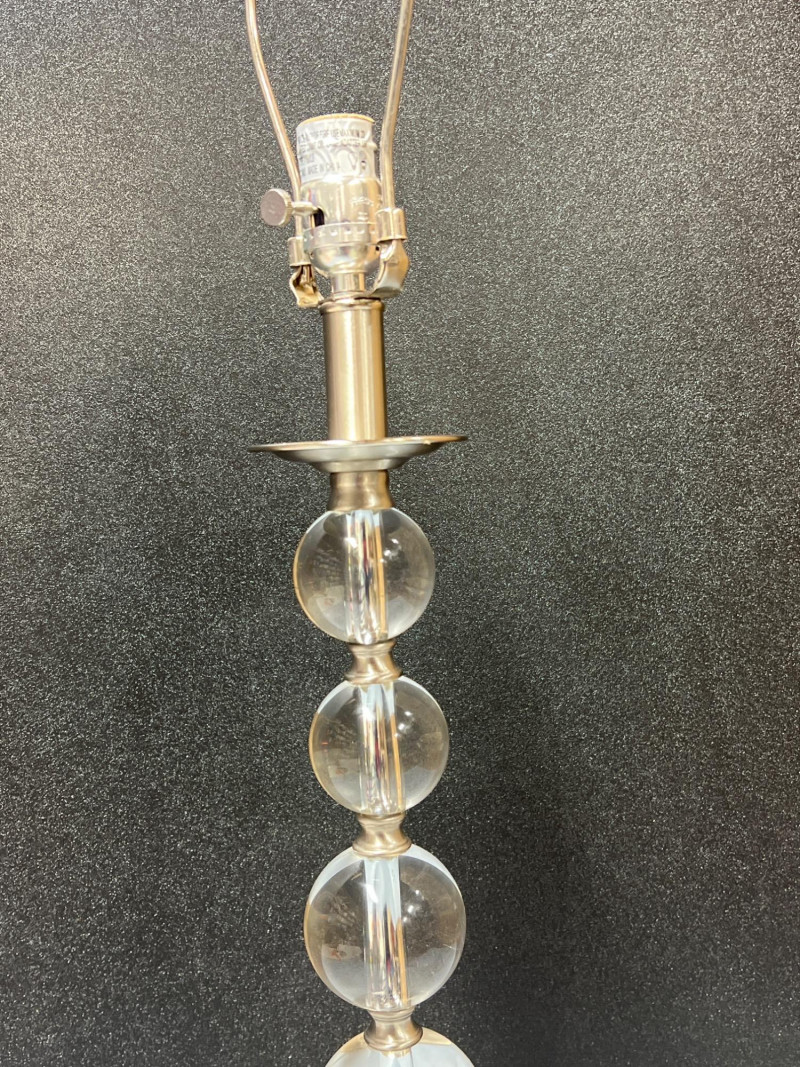 Elegant Mid‑Century Modern lamp featuring stacked glass spheres and a polished brass base. Working condition. No shade. Design: Iconic MCM styling with clear glass balls stacked vertically for a sculptural effect. Material: Brass base and fittings paired with luminous glass accents. Dimensions: 28" H × 6" W (approximate). Utility: Perfect statement piece for living rooms, offices, or collector displays.