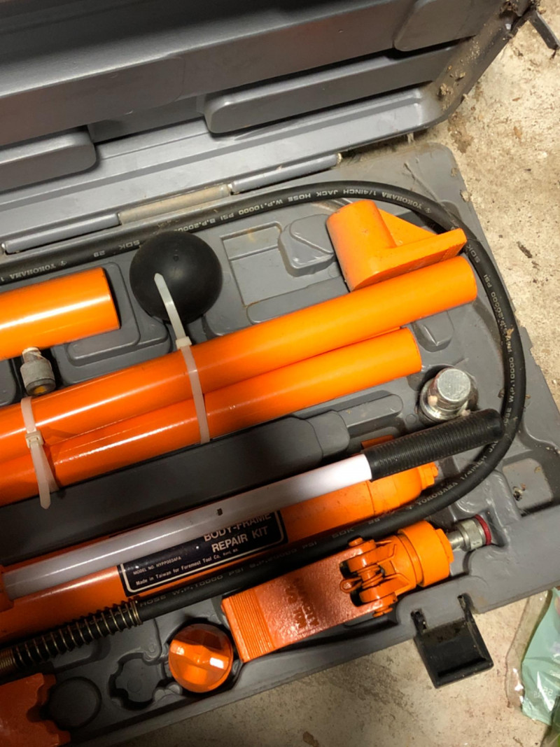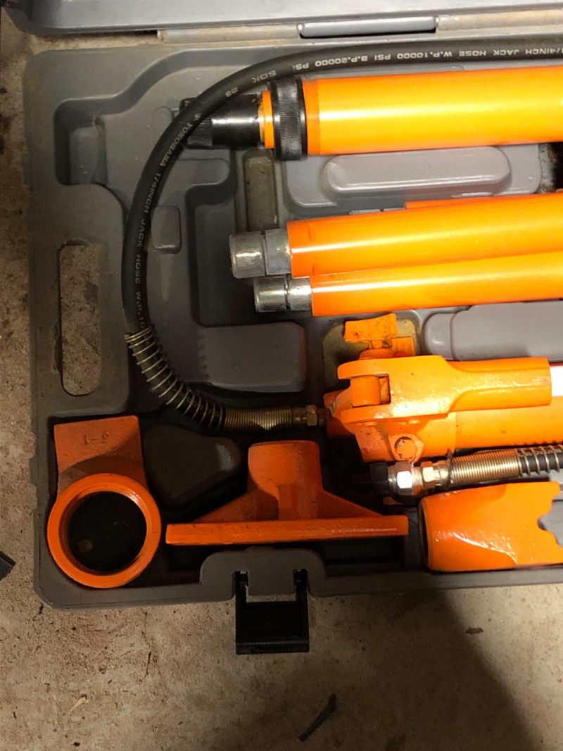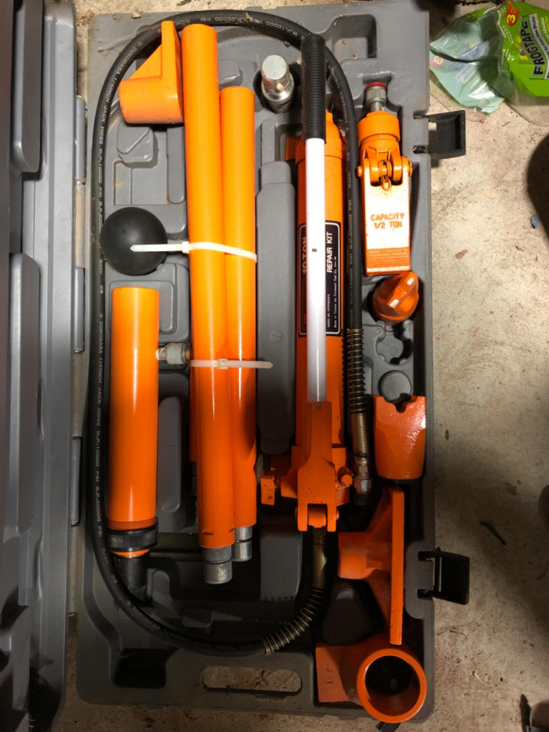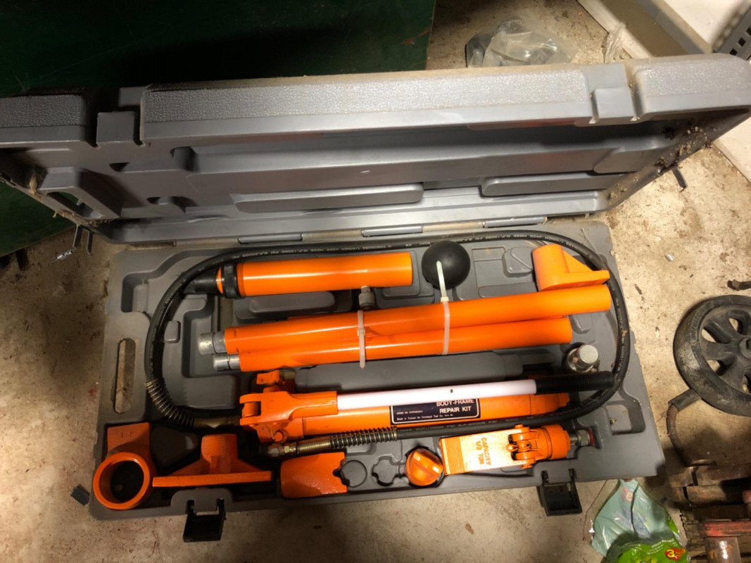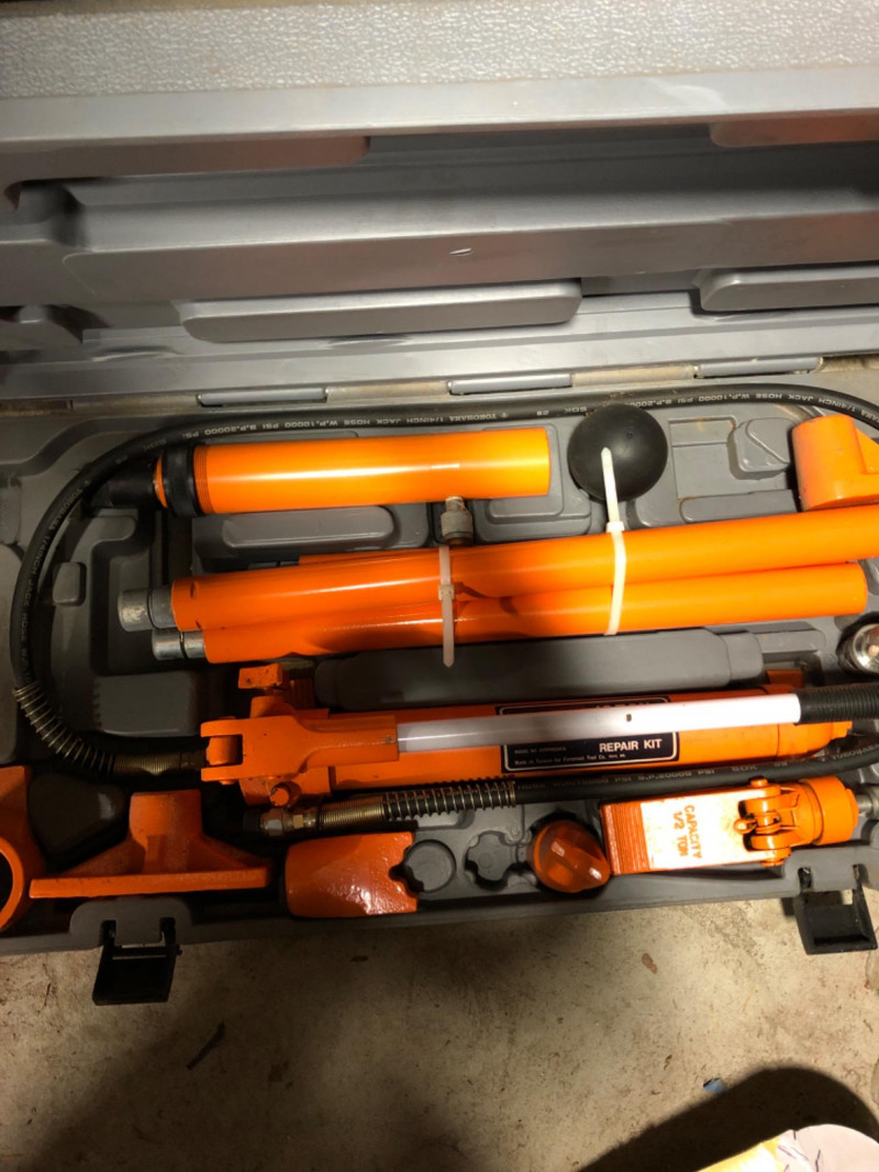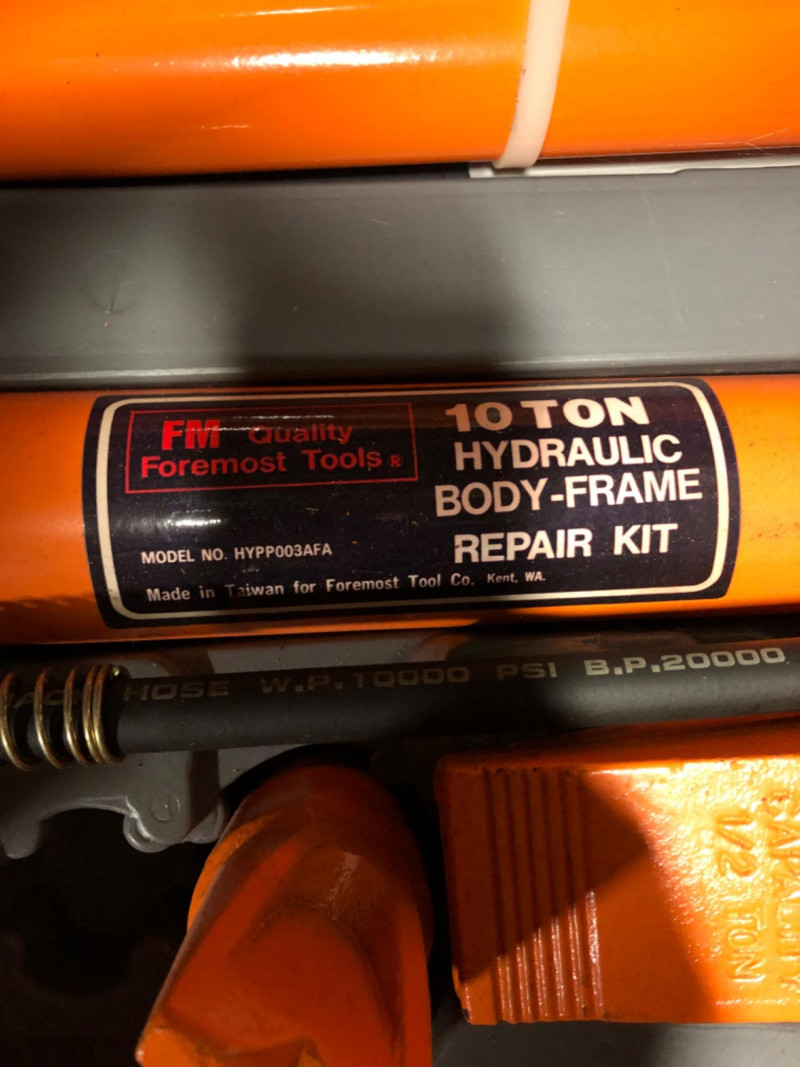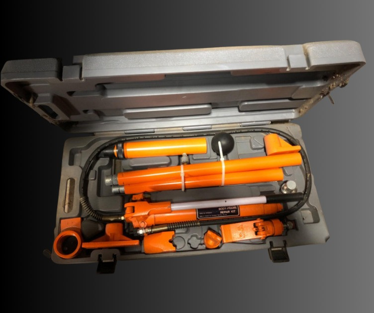 Heavy‑duty 10‑ton hydraulic body frame repair kit, Model HYPP003AFA, designed for contractor and automotive use. Provides powerful lifting, pushing, pulling, bending, and frame adjustment capability for a wide range of repair applications. Includes multiple attachments for versatility, all housed in a portable case for organized storage and transport. Built for durability and reliability in demanding shop or jobsite environments. Need Shipping?: Contact LoopCycle