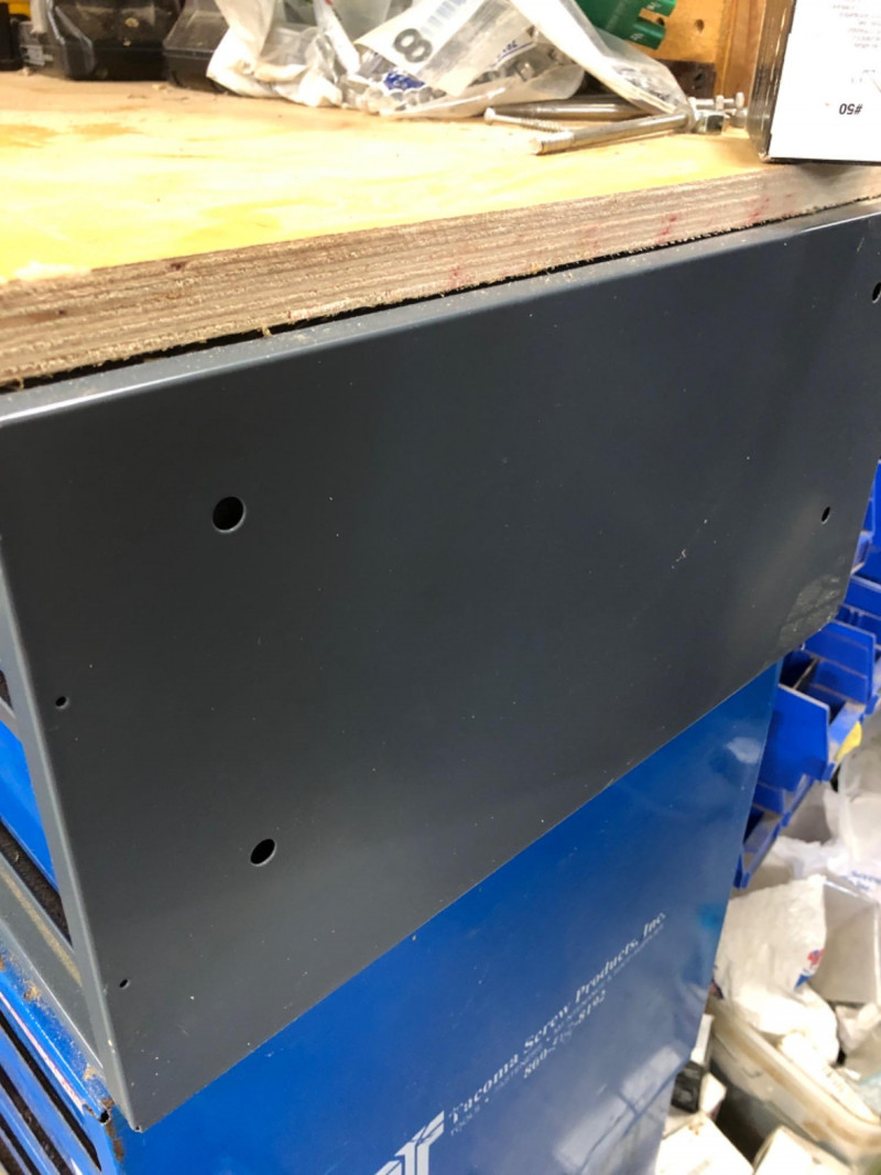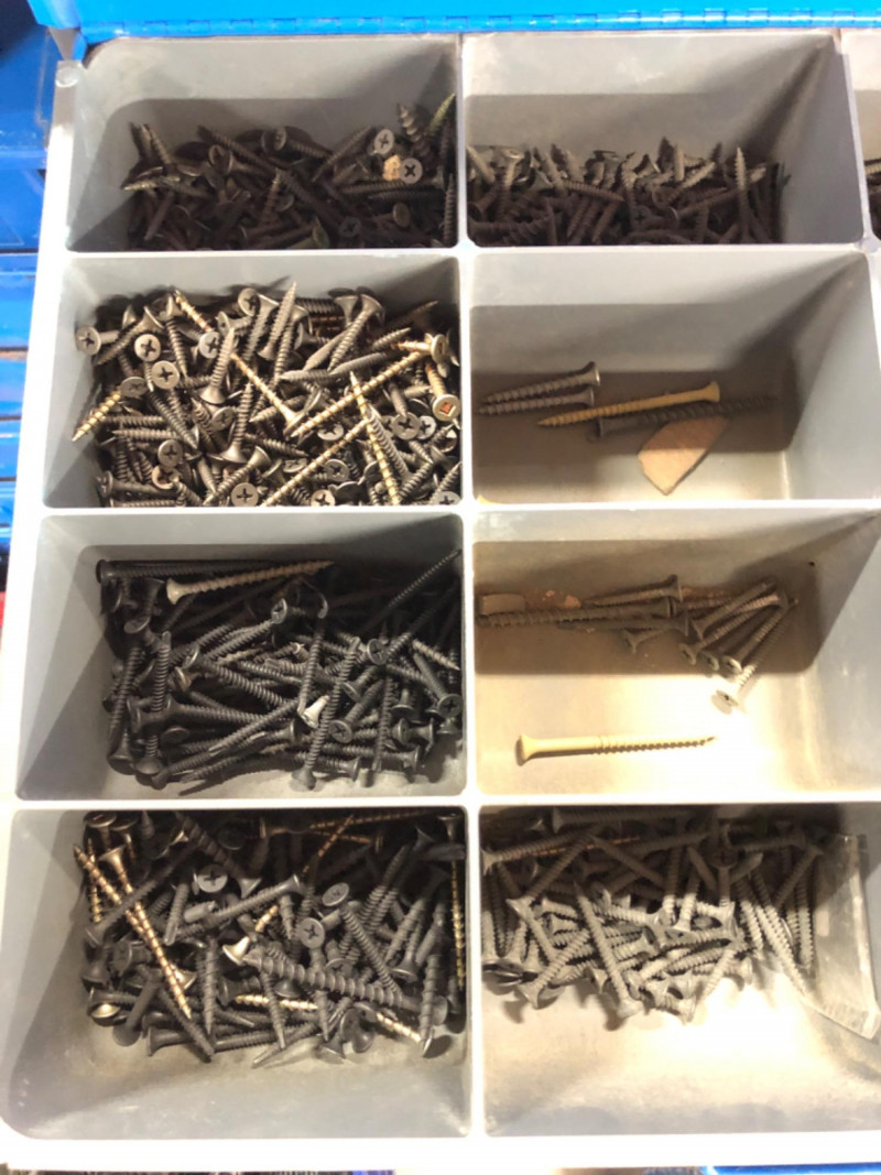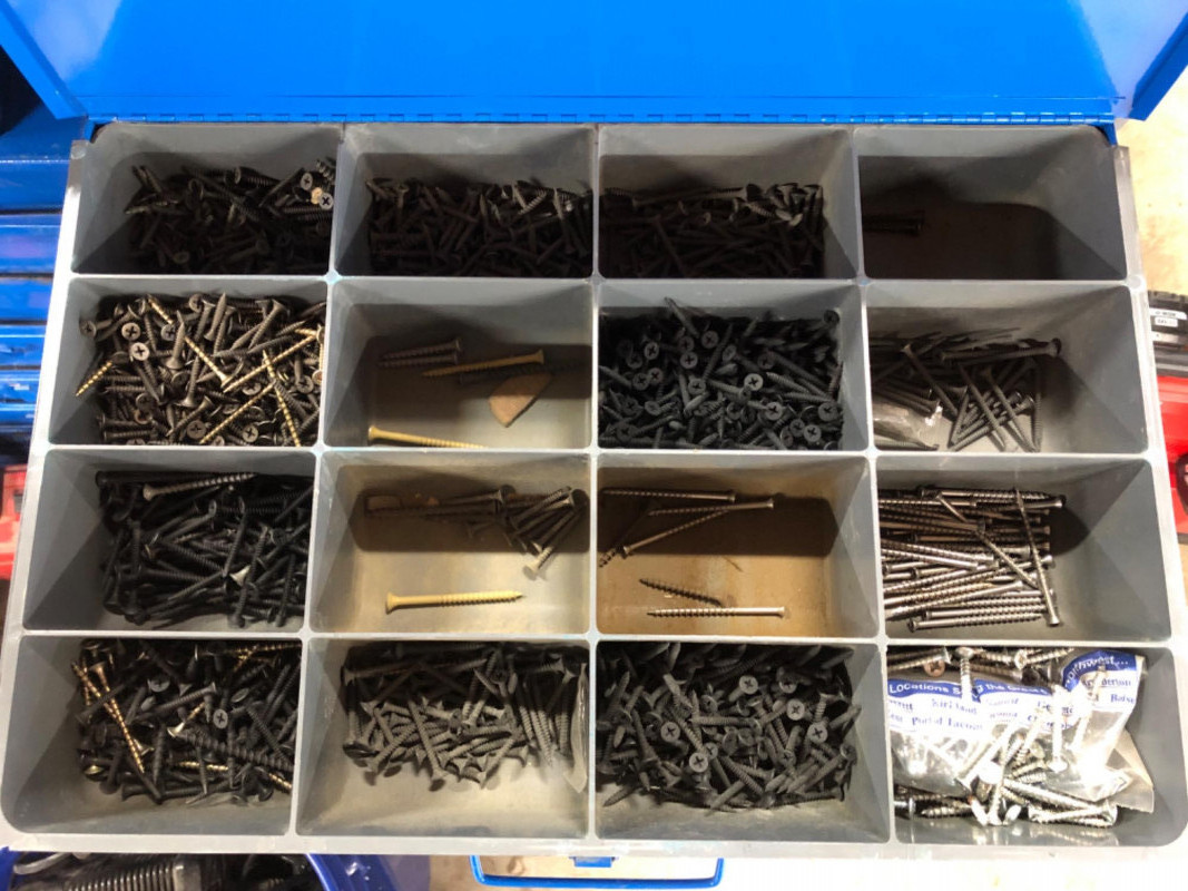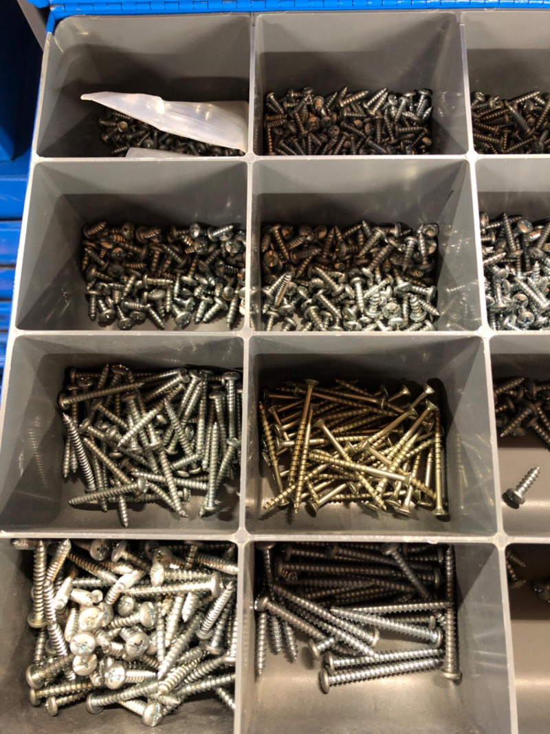 Tacoma Screw organizer #3 designed to hold two metal boxes with lids and filled with hardware - mostly screws and fasteners. Durable construction ensures long‑term use in industrial or garage settings. Unattached wood shelf above organizer is for display only and not included.