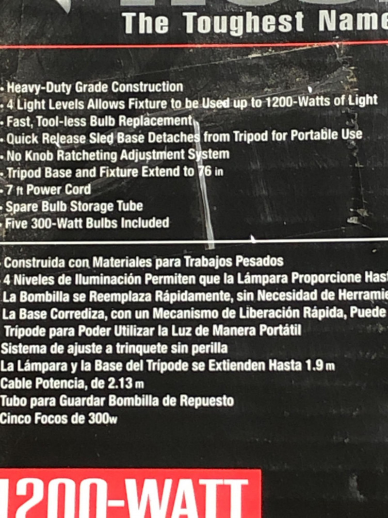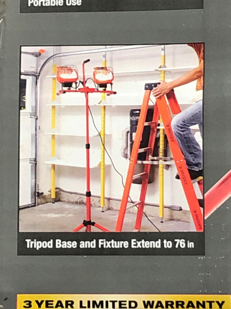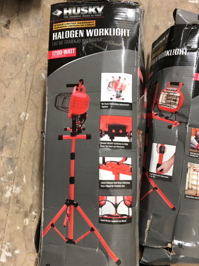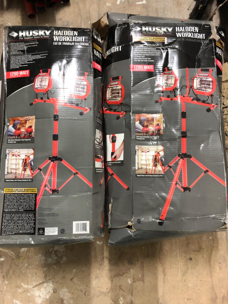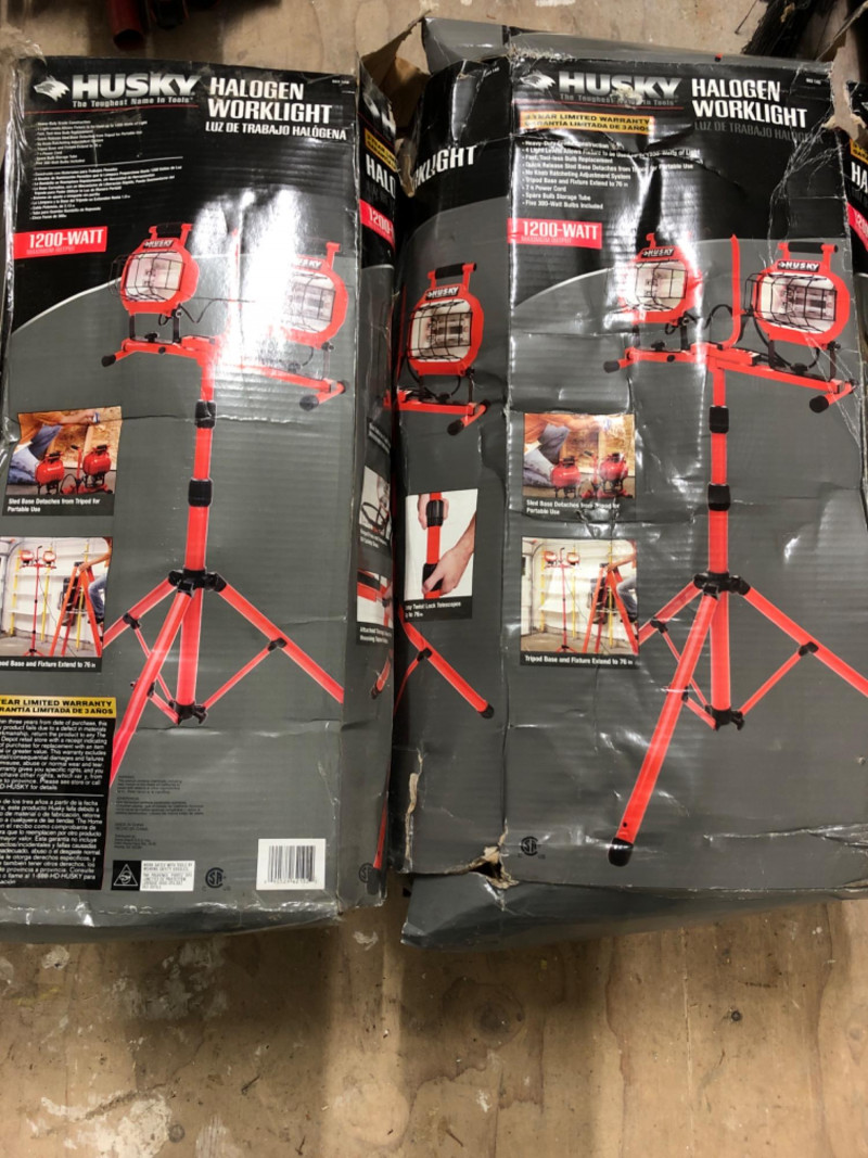 Pair of Husky halogen worklights, designed for contractor and jobsite use. Provides bright illumination for construction, shop, or garage projects. Durable build with adjustable stands for versatile positioning. Still in boxes.