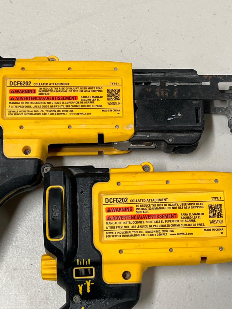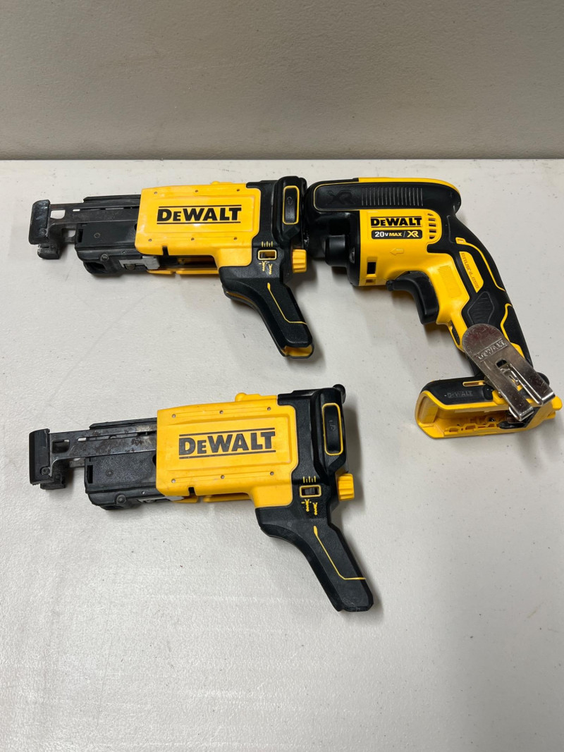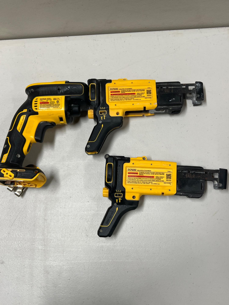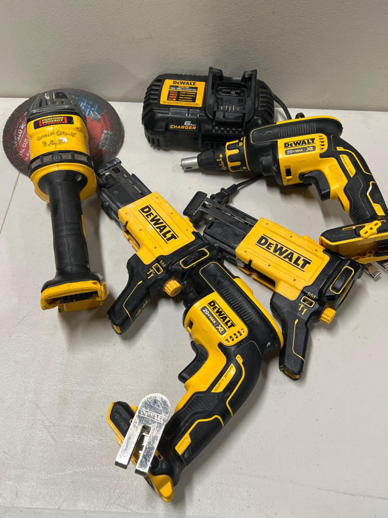 Assorted set of DeWalt cordless power tools designed for portability and jobsite efficiency. This lot includes: Two DCF620 Drywall Screw Guns – precision fastening for drywall installation Two DCF6202 Collated Attachments – compatible with screw guns for faster production work DCG414 Grinder (Brushless Motor, 60V Max) – heavy‑duty cutting and grinding performance DCB1106 6V Battery Charger – supports multiple DeWalt battery platforms All tools are contractor‑grade, built for durability and reliability in demanding shop or construction environments. Please note: batteries are not included.