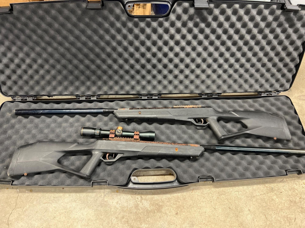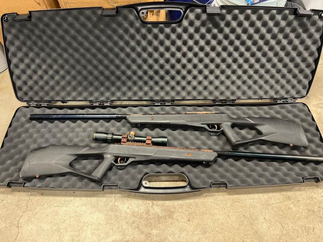 Pair of Benjamin Trail air rifles, complete with protective carrying case. Performance: Break‑barrel design with Nitro Piston technology for smoother cocking, reduced recoil, and quieter shots. Caliber: .177 or .22 (model dependent), suitable for target practice and small game hunting. Scope: One rifle is equipped with a Simmons scope, offering enhanced accuracy and clear sighting. Case: Durable padded case included for safe transport and storage. Condition: Both rifles included; sold as‑is.