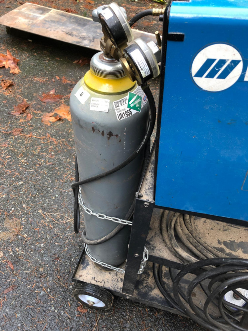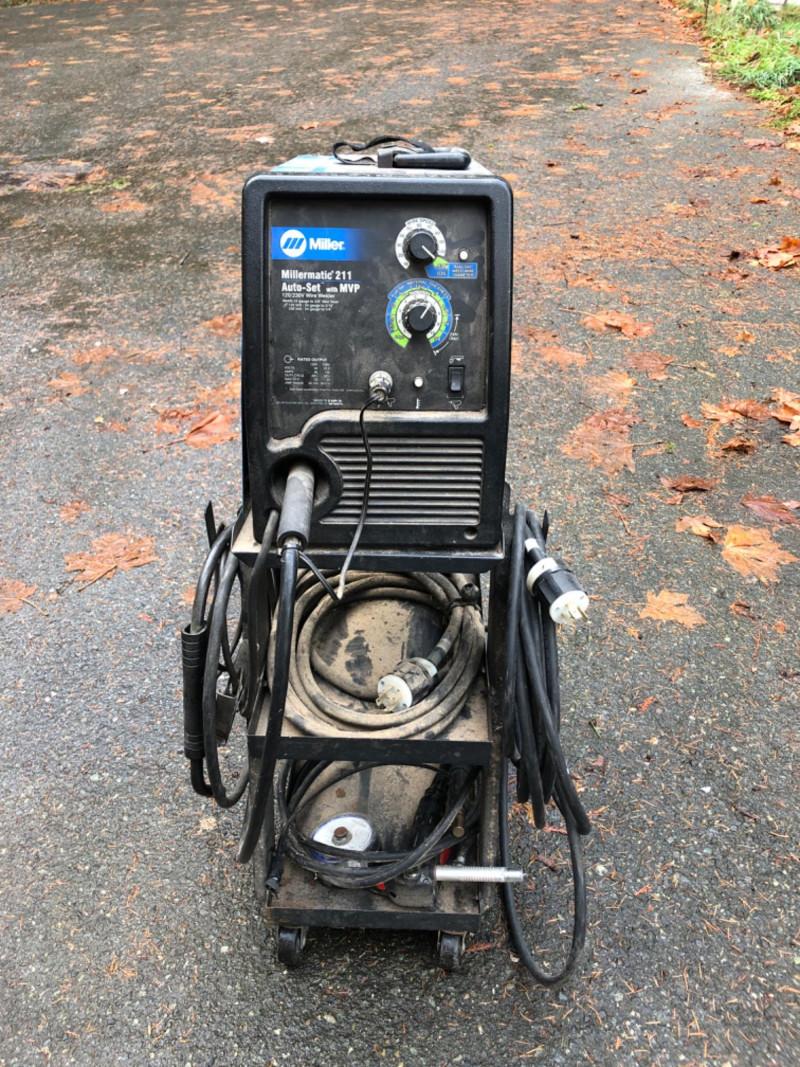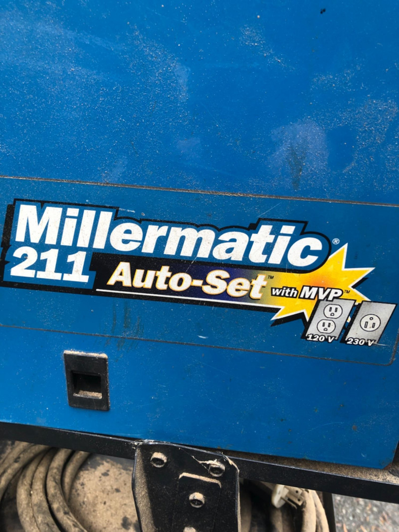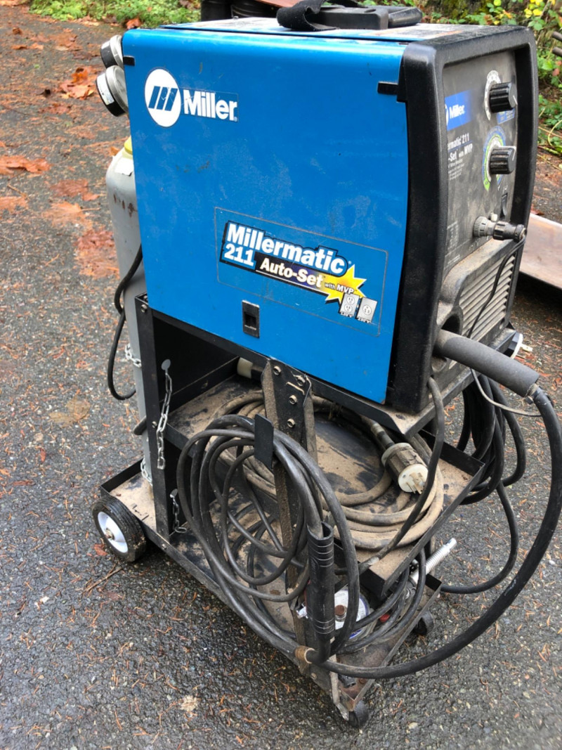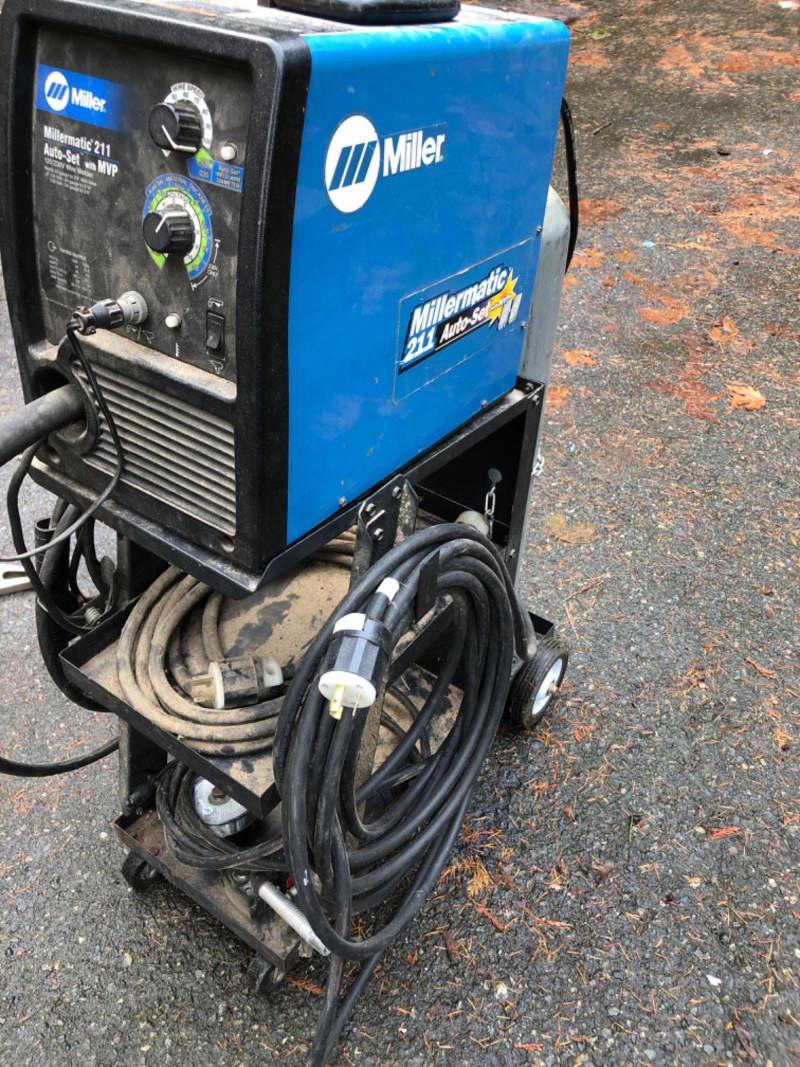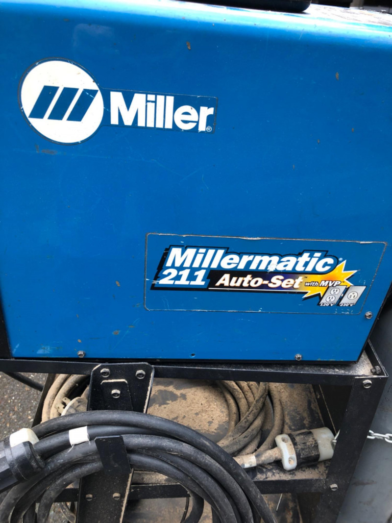 Miller Millermatic 211 single‑phase MIG welder, complete with spool and accessories. Known for its versatility and professional‑grade performance, this unit is ideal for contractors, fabricators, and shop use. Capable of welding mild steel, stainless, and aluminum, the 211 offers smooth arc starts and reliable output. Includes: Millermatic 211 Welder Spool Gun for MIG Welding Extension Cords Cart Tank Measurements Include Cart