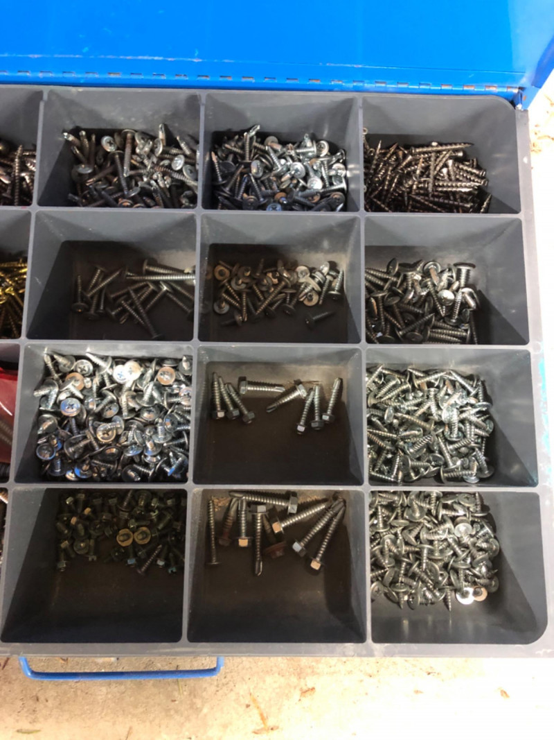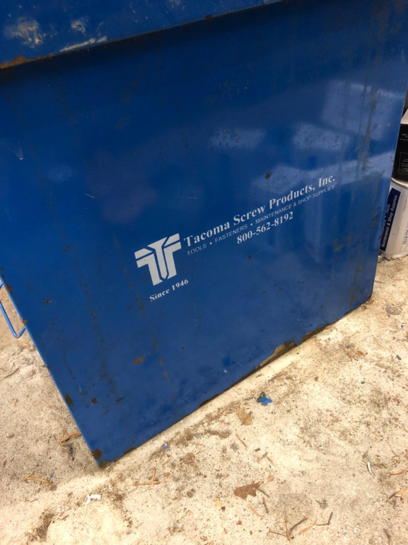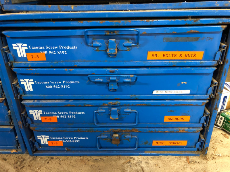 Tacoma Screw 4‑drawer metal cabinet, designed for organizing screws, fasteners, and shop hardware. Durable construction with compartmentalized drawers makes it easy to sort and store supplies. Ideal for contractors and shop organization.