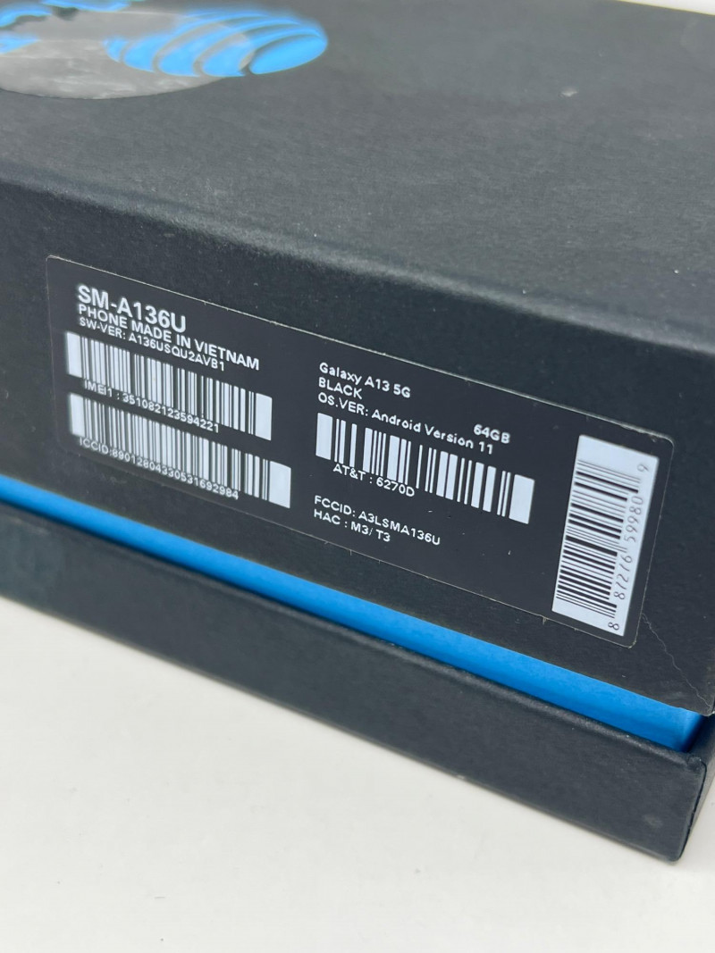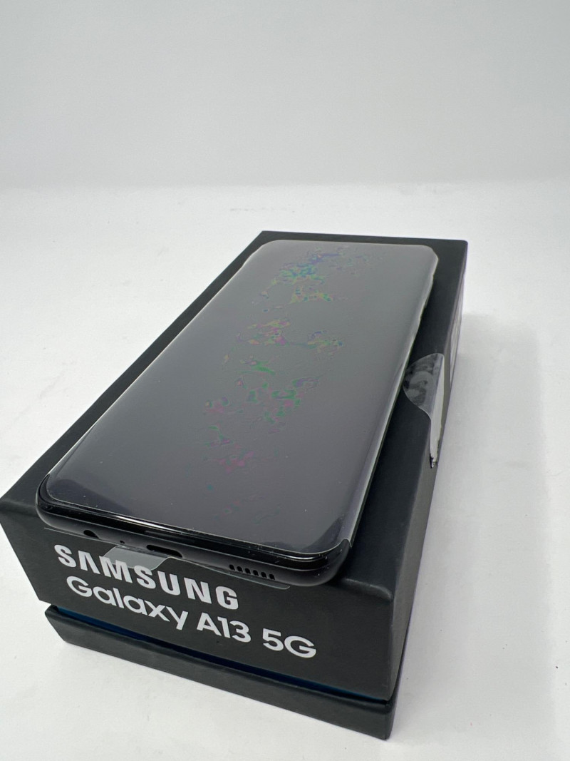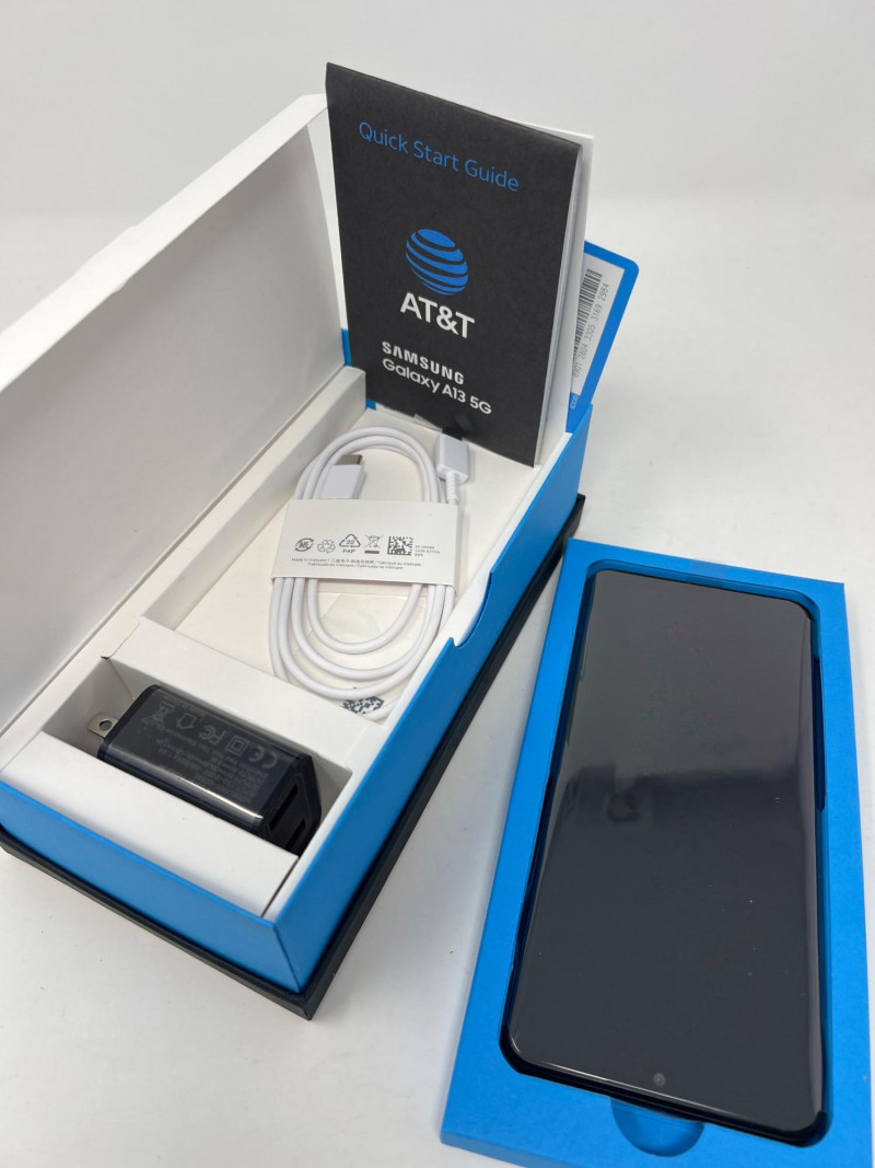 Modern Samsung Galaxy A13 5G smartphone, bundled with an Anker Power Pak for reliable backup power, a car charger, a wall charger, and two charging cables. Buyer needs to acquire new SIM card. Display: 6.5" HD+ Infinity‑V screen for vibrant visuals. Performance: MediaTek Dimensity processor with 5G connectivity for fast streaming and browsing. Storage: 64GB internal memory with microSD expansion option. Camera: Triple rear camera system with 50MP main lens; front camera for selfies and video calls. Utility: Android OS with Samsung One UI; compatible with major carriers. Bonus Accessory: Anker Power Pak included – portable charging solution for extended use on the go. Condition: New in box; sold as‑is.