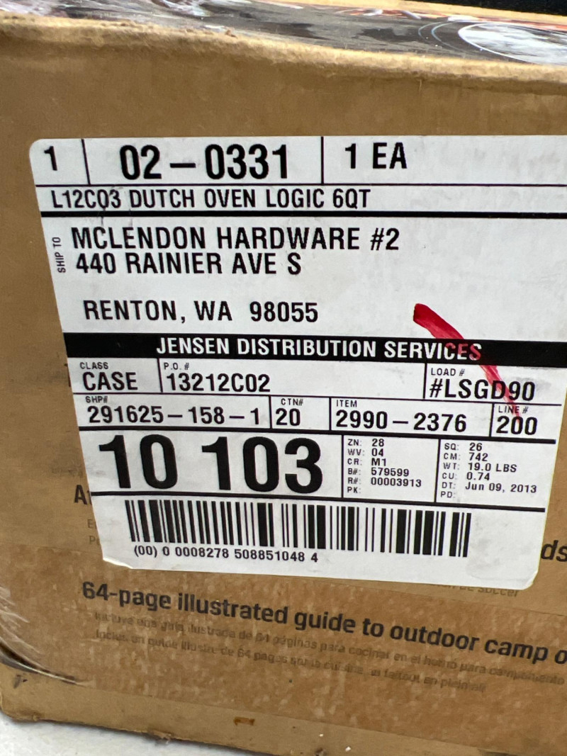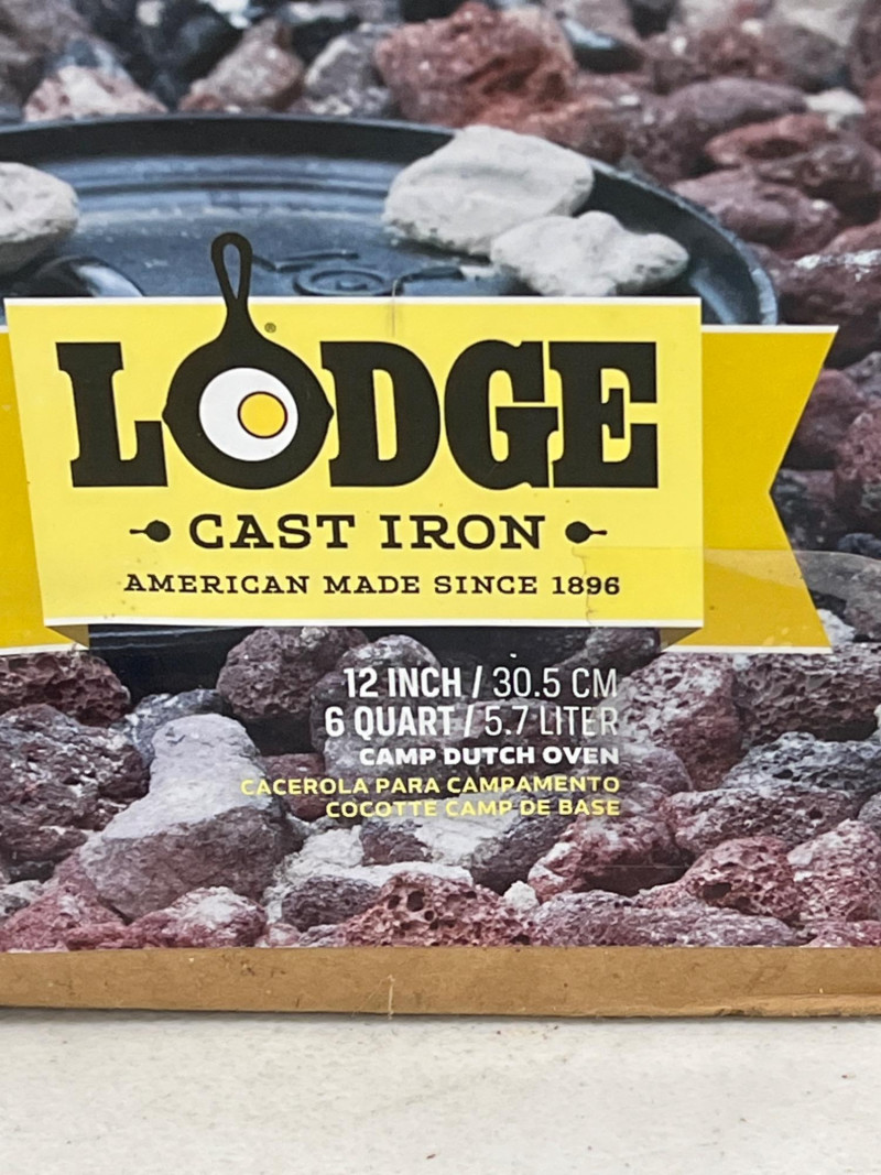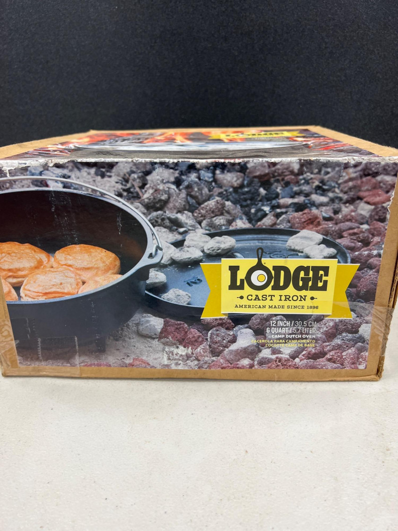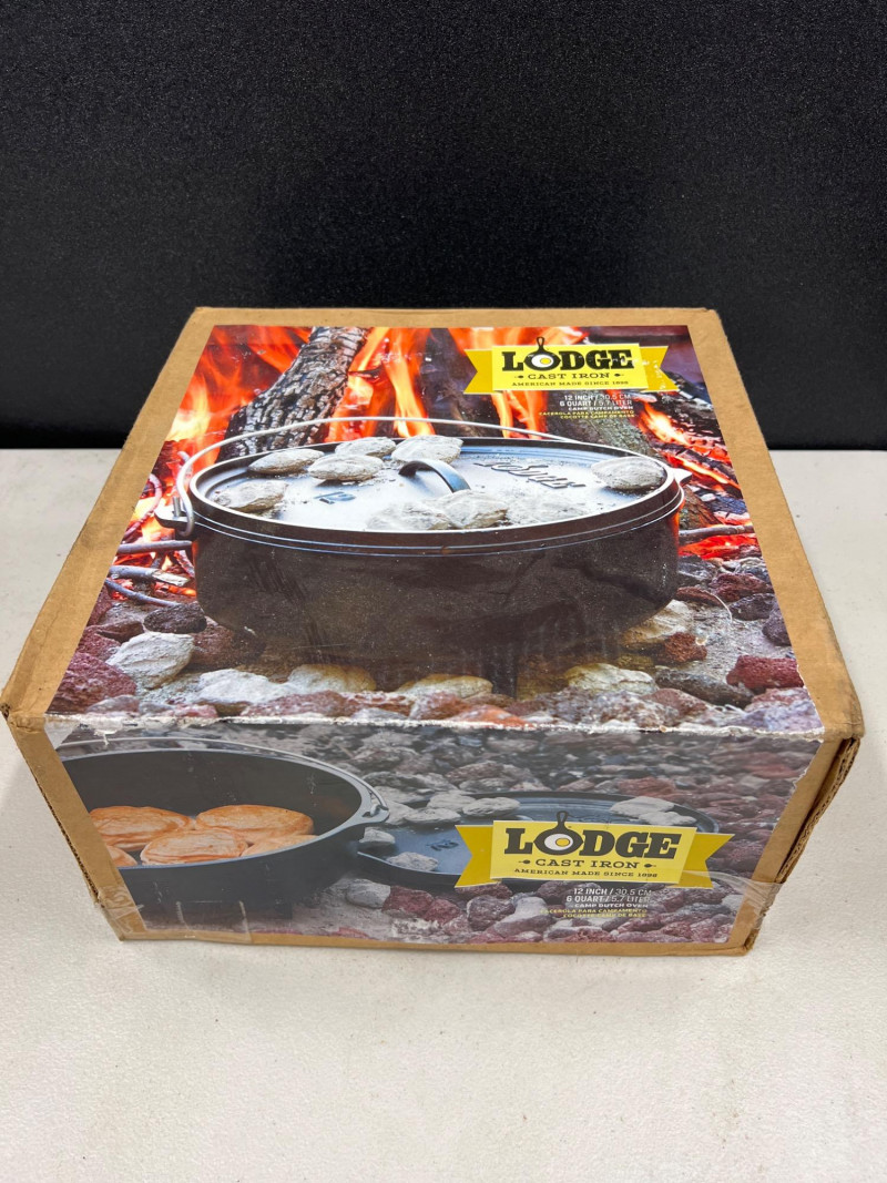 Classic Lodge 12‑inch cast iron pot with lid, built for versatile cooking indoors or outdoors. Performance: Superior heat retention and even heating, ideal for stews, soups, roasts, and campfire meals. Design: Heavy‑duty cast iron with matching lid for moisture lock and flavor depth. Utility: Suitable for stovetop, oven, grill, or open fire cooking. Durability: Built to last generations; naturally seasoned for enhanced nonstick performance. Condition: Solid and intact; new in unopened box.