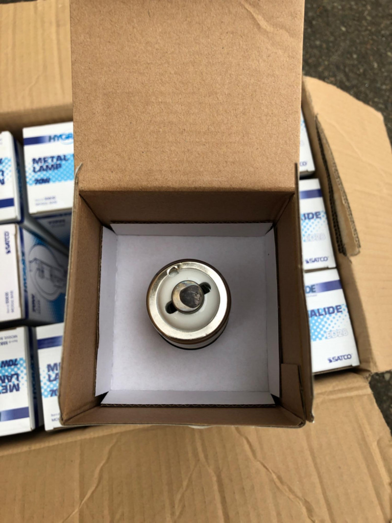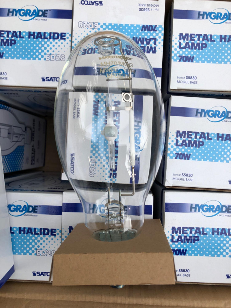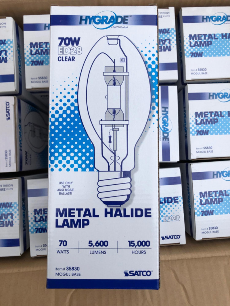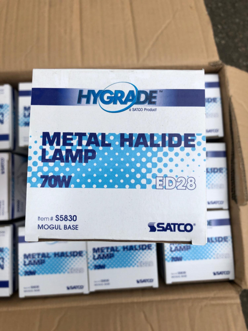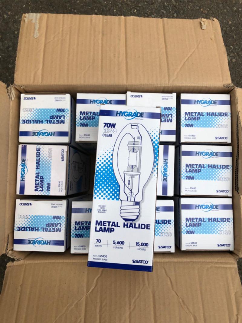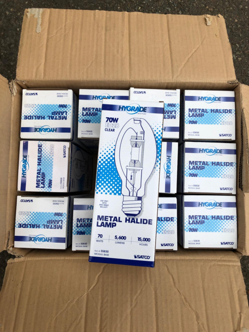 Twelve Hygrade 70‑watt metal halide bulbs, new in original packaging. Reliable contractor lighting solution for industrial and shop use. Need Shipping?: Contact LoopCycle