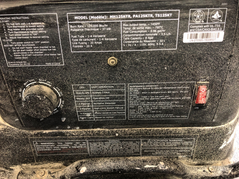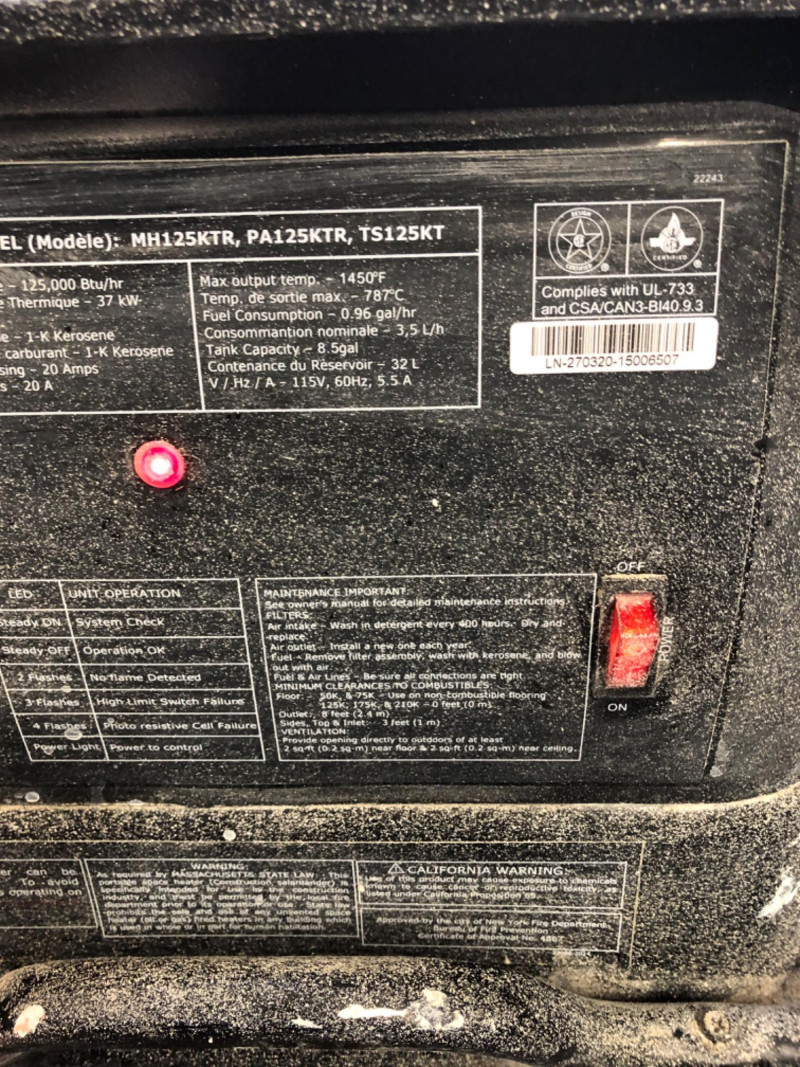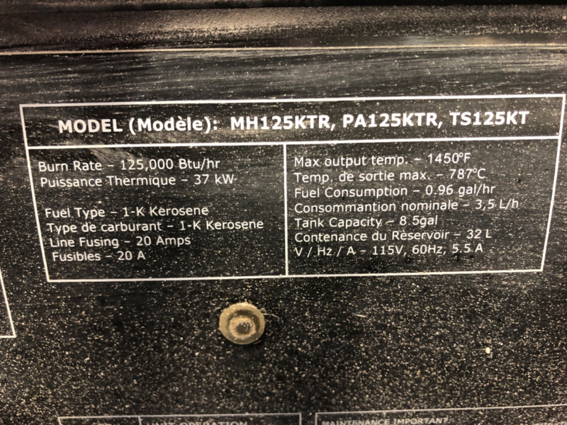 Built for demanding environments, this Mr. Heater 125,000 BTU forced air unit delivers powerful kerosene-fueled heat to keep your jobsite, garage, or warehouse warm and productive. Compatible with multiple model numbers (125KTR, PA125KTR, TS125KT), this industrial-grade heater features a rugged steel body, built-in thermostat, and high-output fan for fast, even heat distribution. Ideal for contractors working in unconditioned spaces during cold months. 125,000 BTU output Compatible with kerosene, diesel, and JP-8 fuels Integrated thermostat and overheat safety shutoff Heats up to 3,125 sq ft Heavy-duty steel construction with carry handle and wheels
