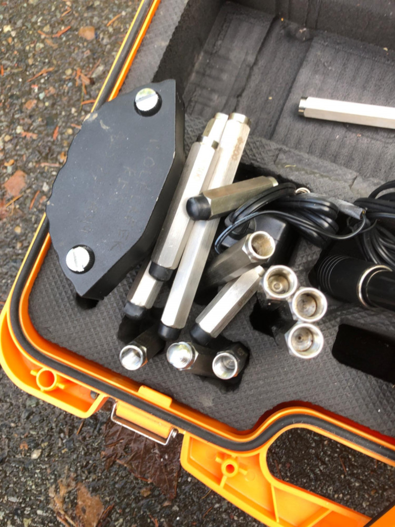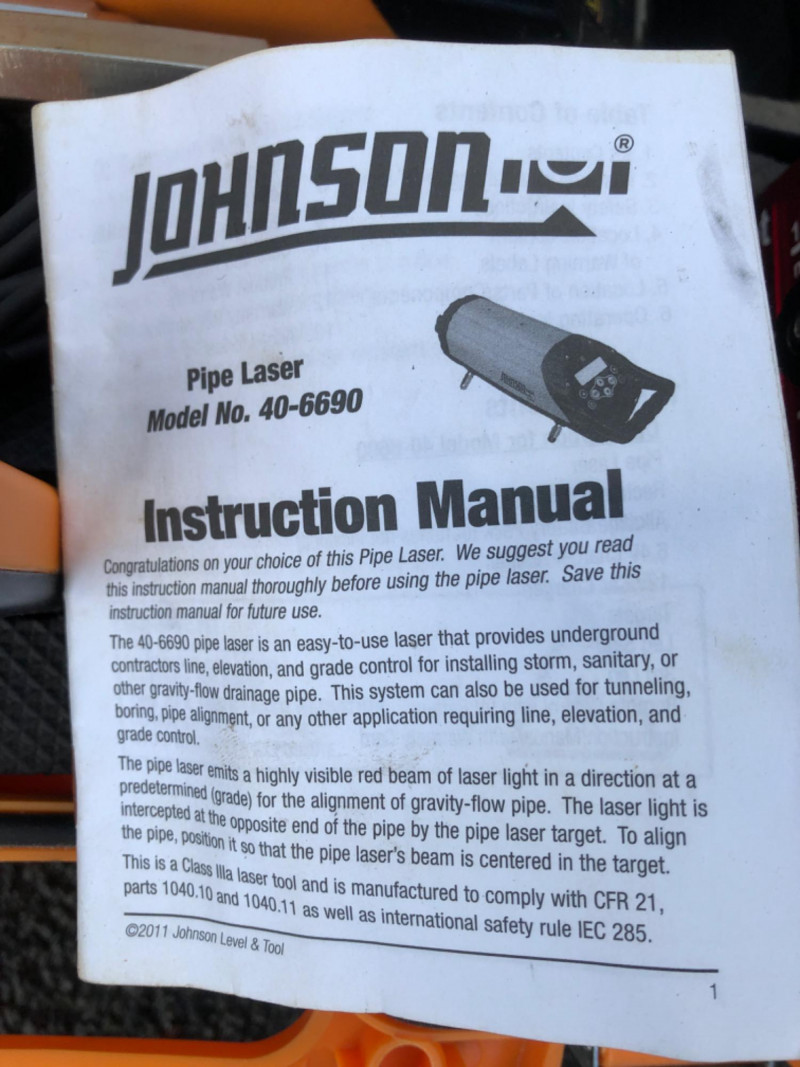 Johnson Model 40‑6690 pipe laser. Professional contractor tool for precision alignment in underground pipe installation. Unit powers on and is functional. Need Shipping?: Contact LoopCycle