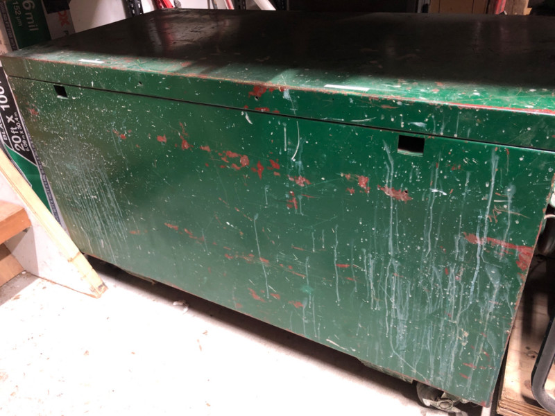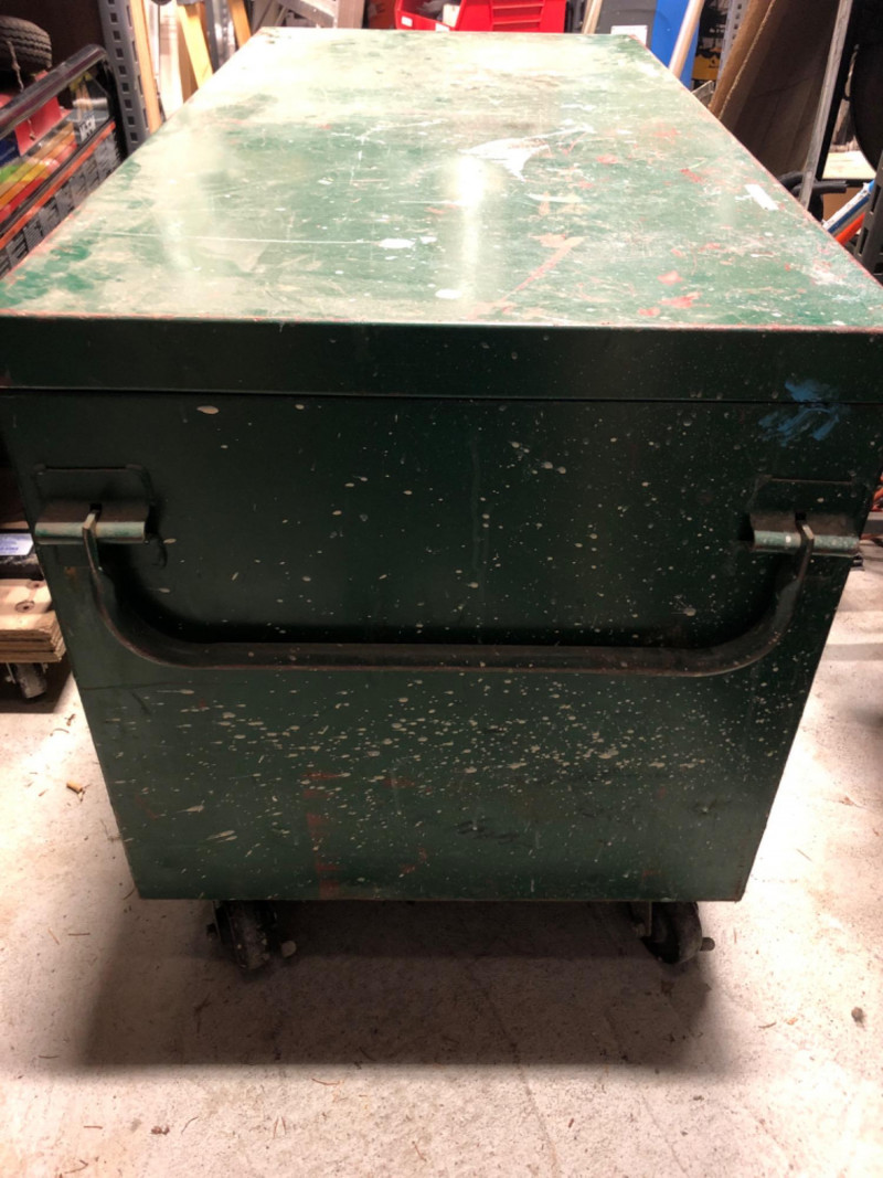 Heavy‑duty rolling metal storage container for contractor tools. Industrial design with secure locking and mobility for shop or field use.